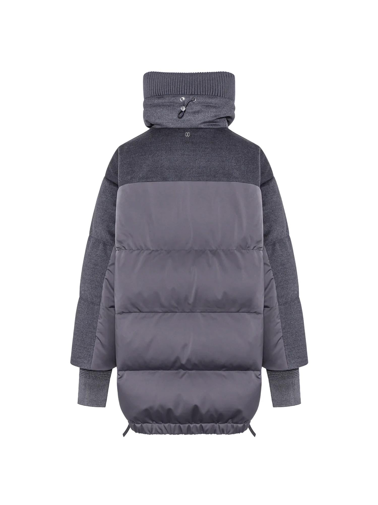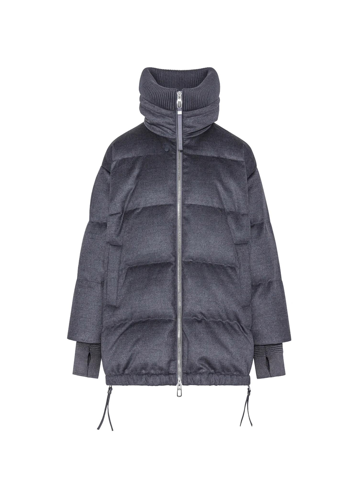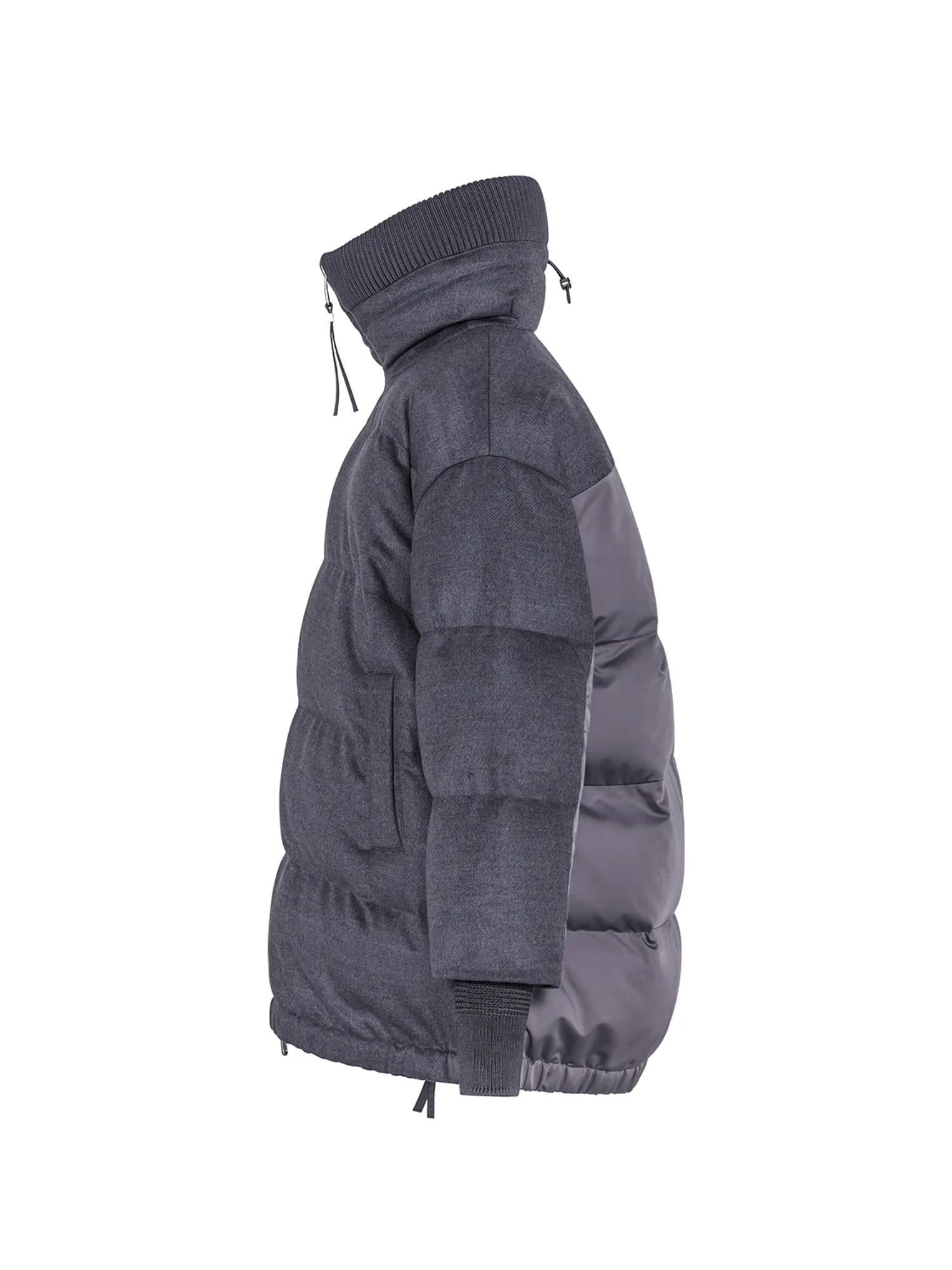 Piumino Duno realizzato esternamente in lana tecnica e poliestere, imbottito in piumino e piuma, con chiusura tramite zip a collo alto, polsini con fori per i pollici e tasche laterali.