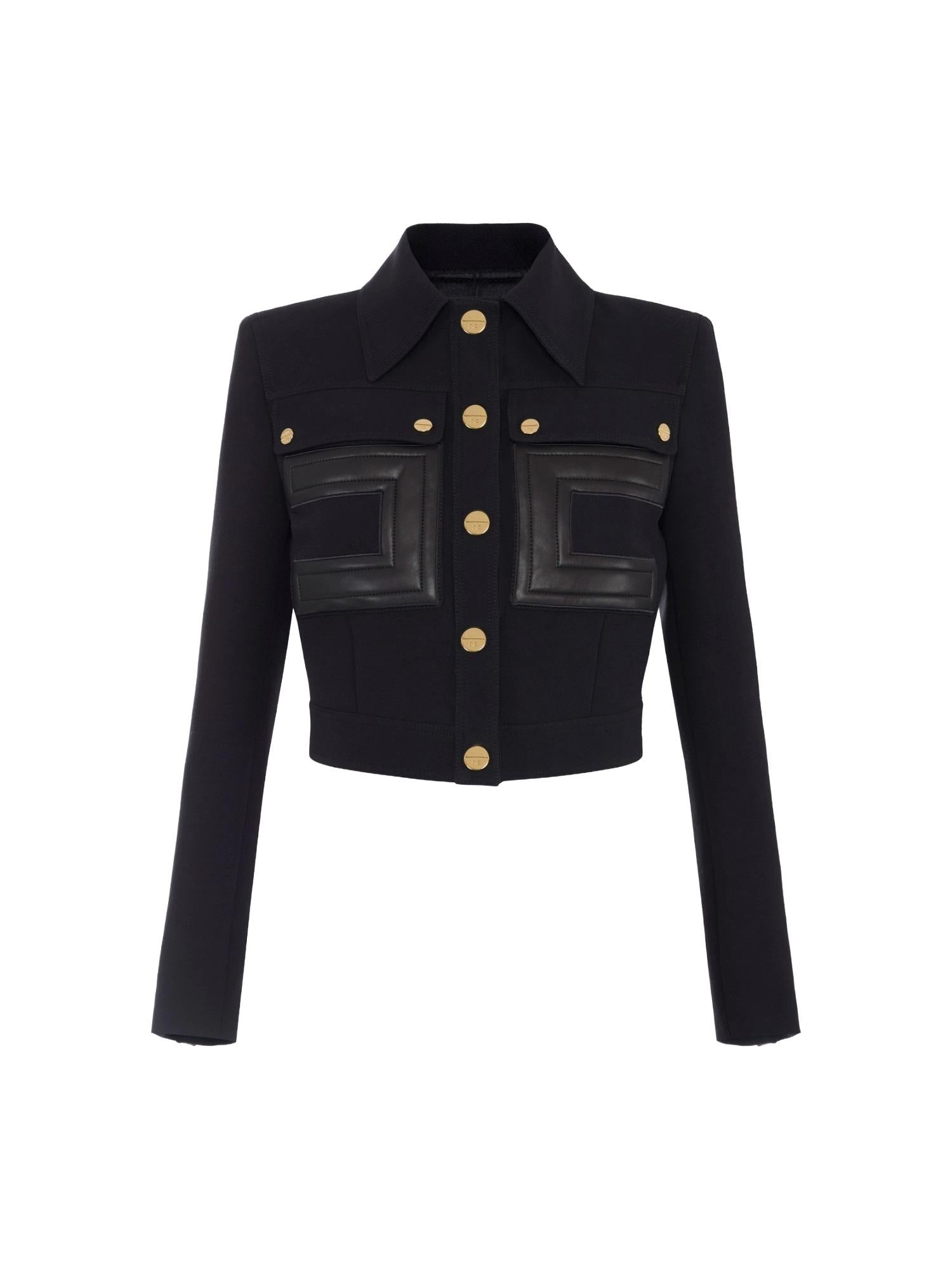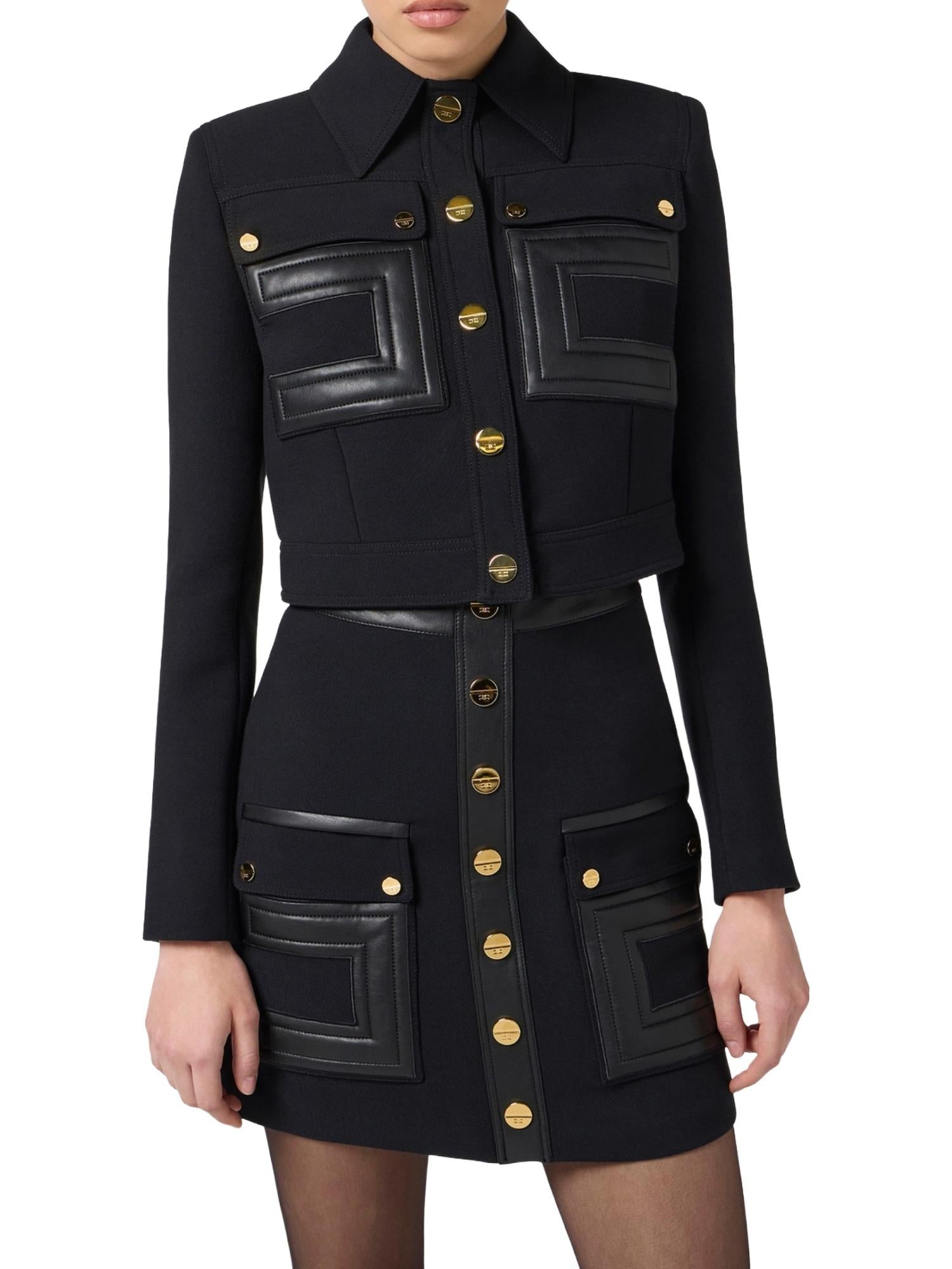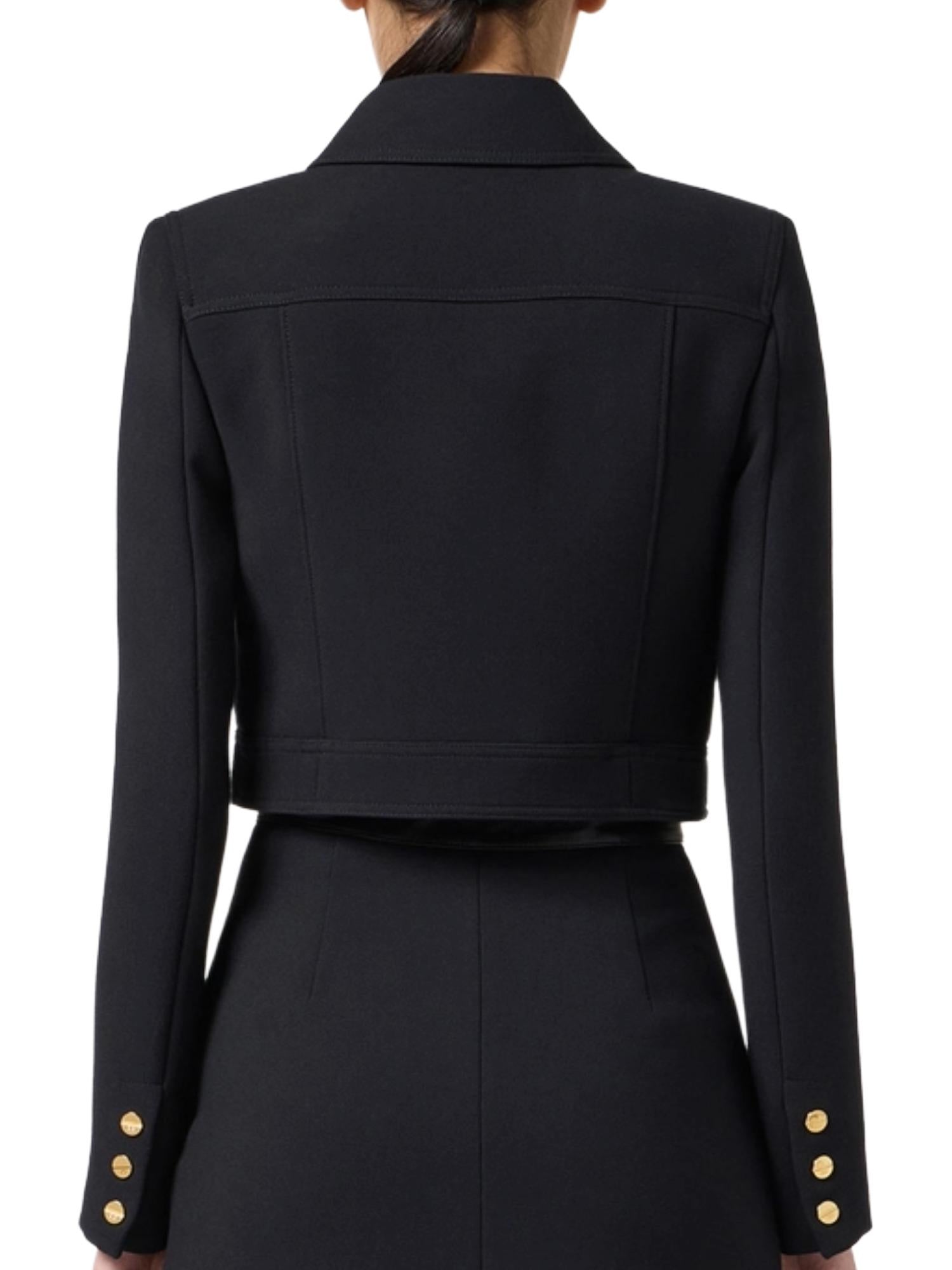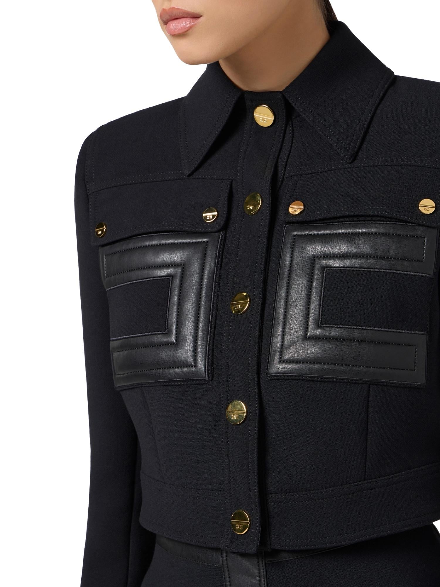 Veste crop Elisabetta Franchi réalisée en crêpe stretch avec fermeture frontale par boutons bijoux, col chemise, poches à rabat sur la poitrine et détails logo embossé.