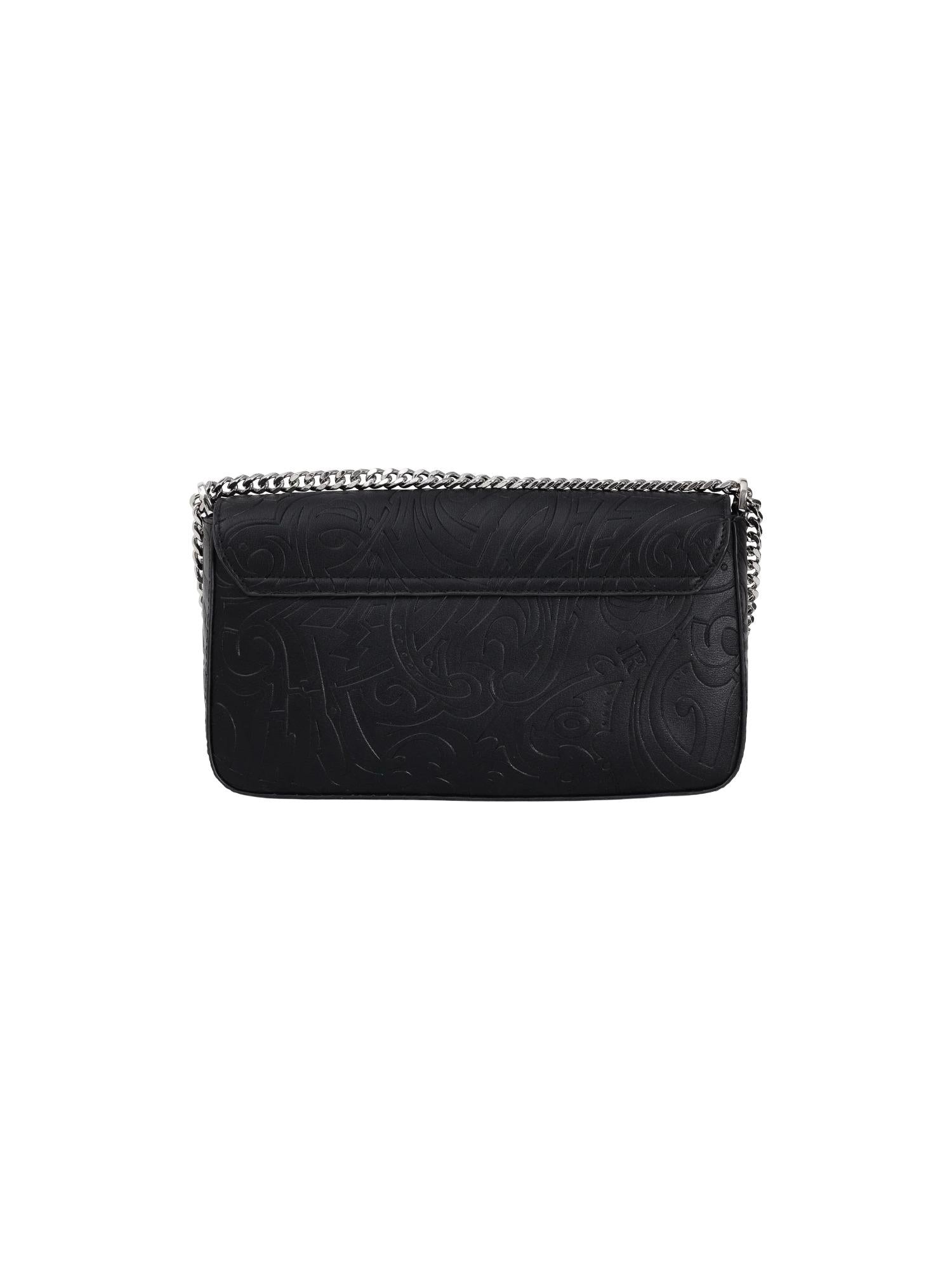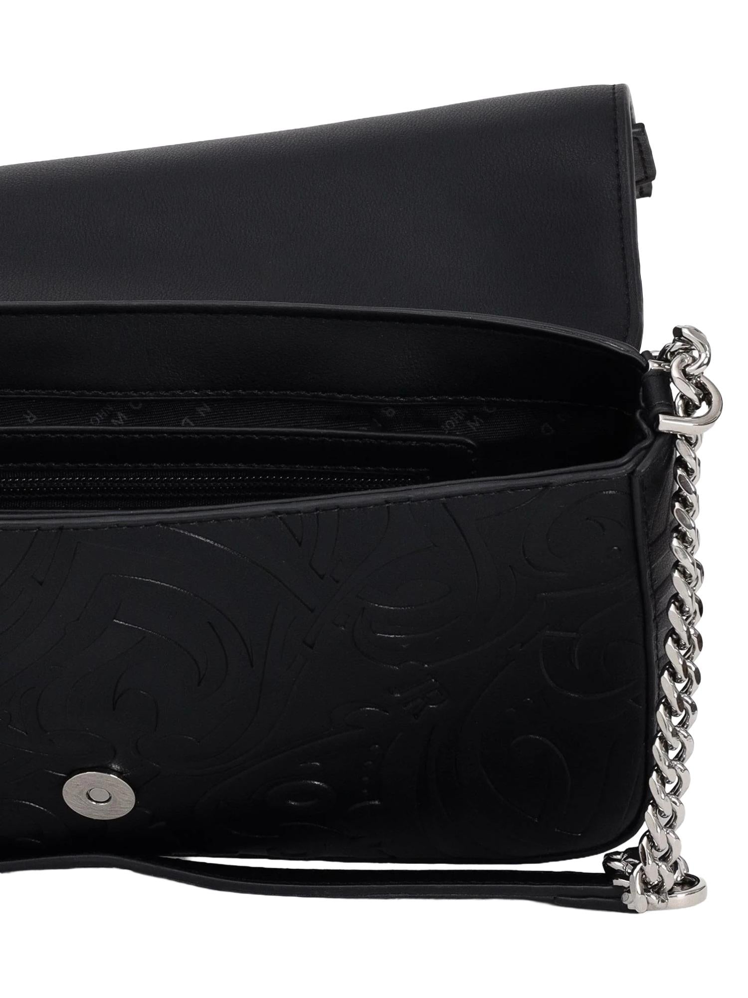 Borsa John Richmond realizzata in ecopelle con motivo astratto inciso, tracolla in catena, chiusura magnetica, tasca interna con zip e placca logo con borchie sul davanti.