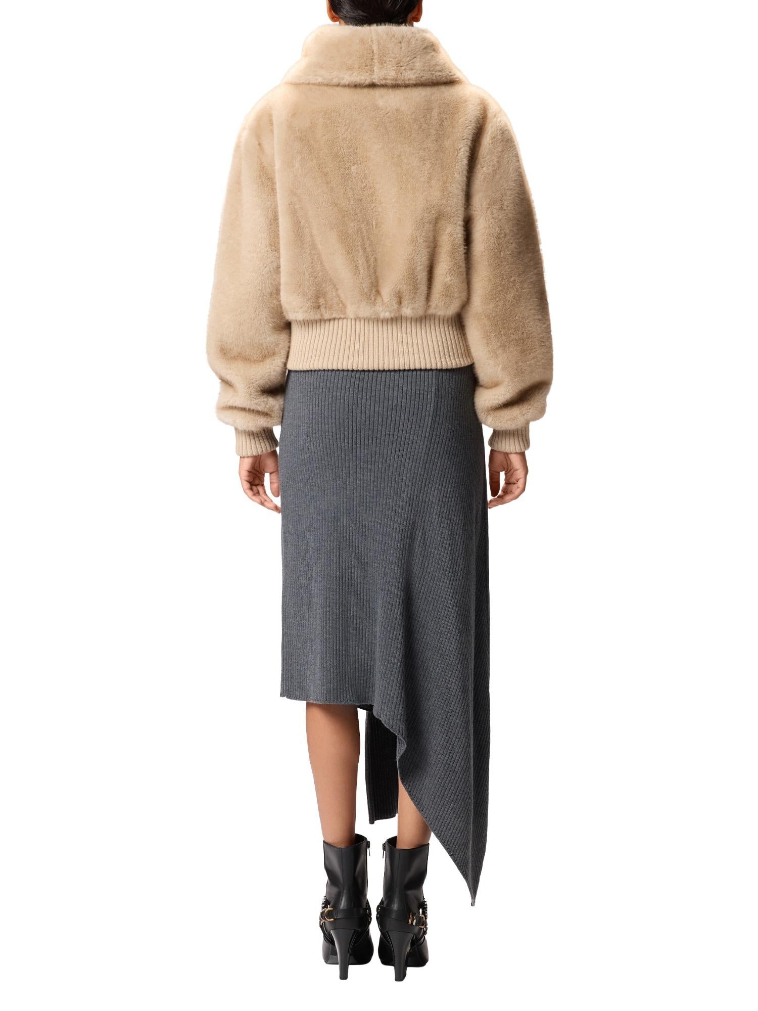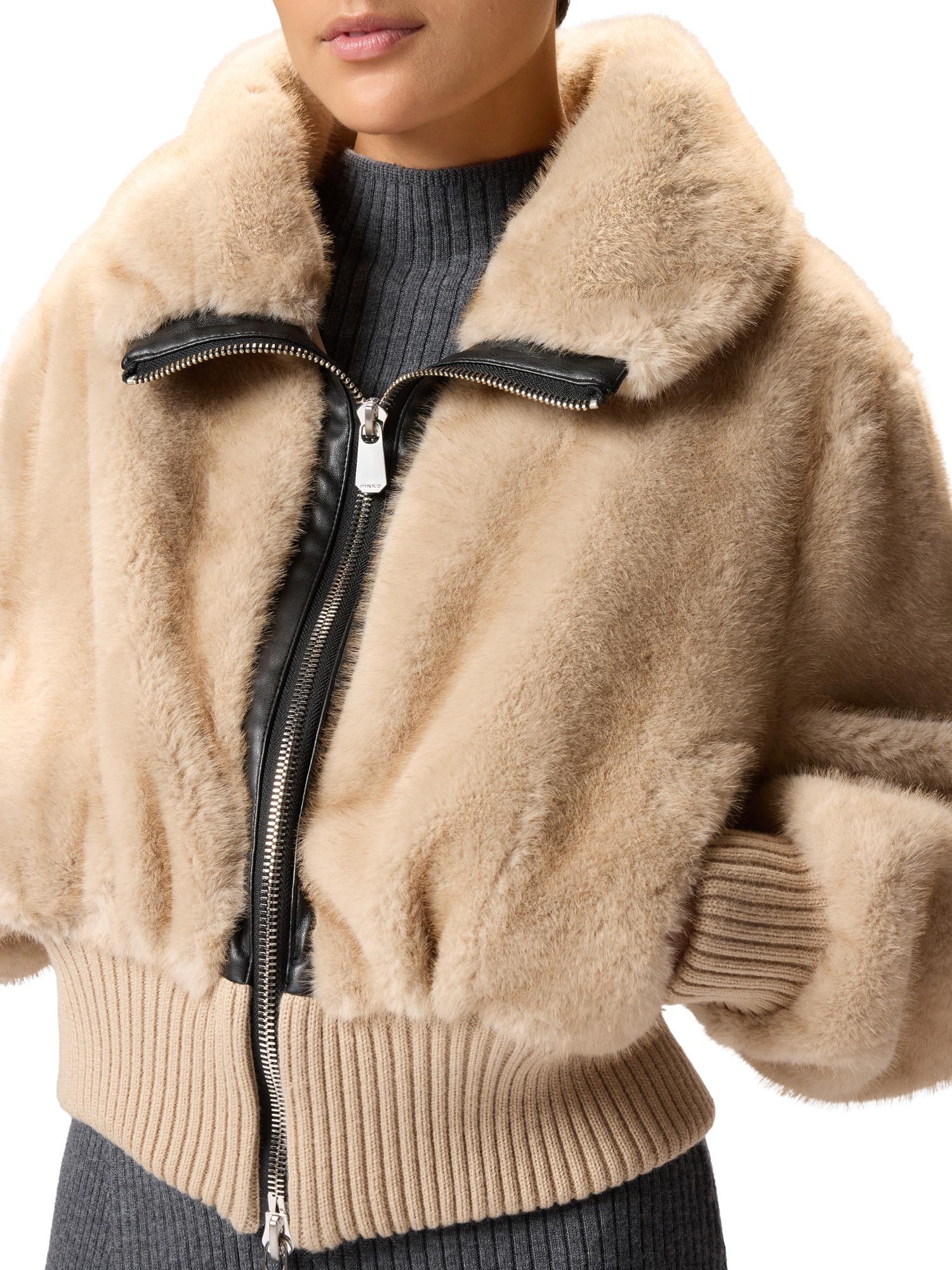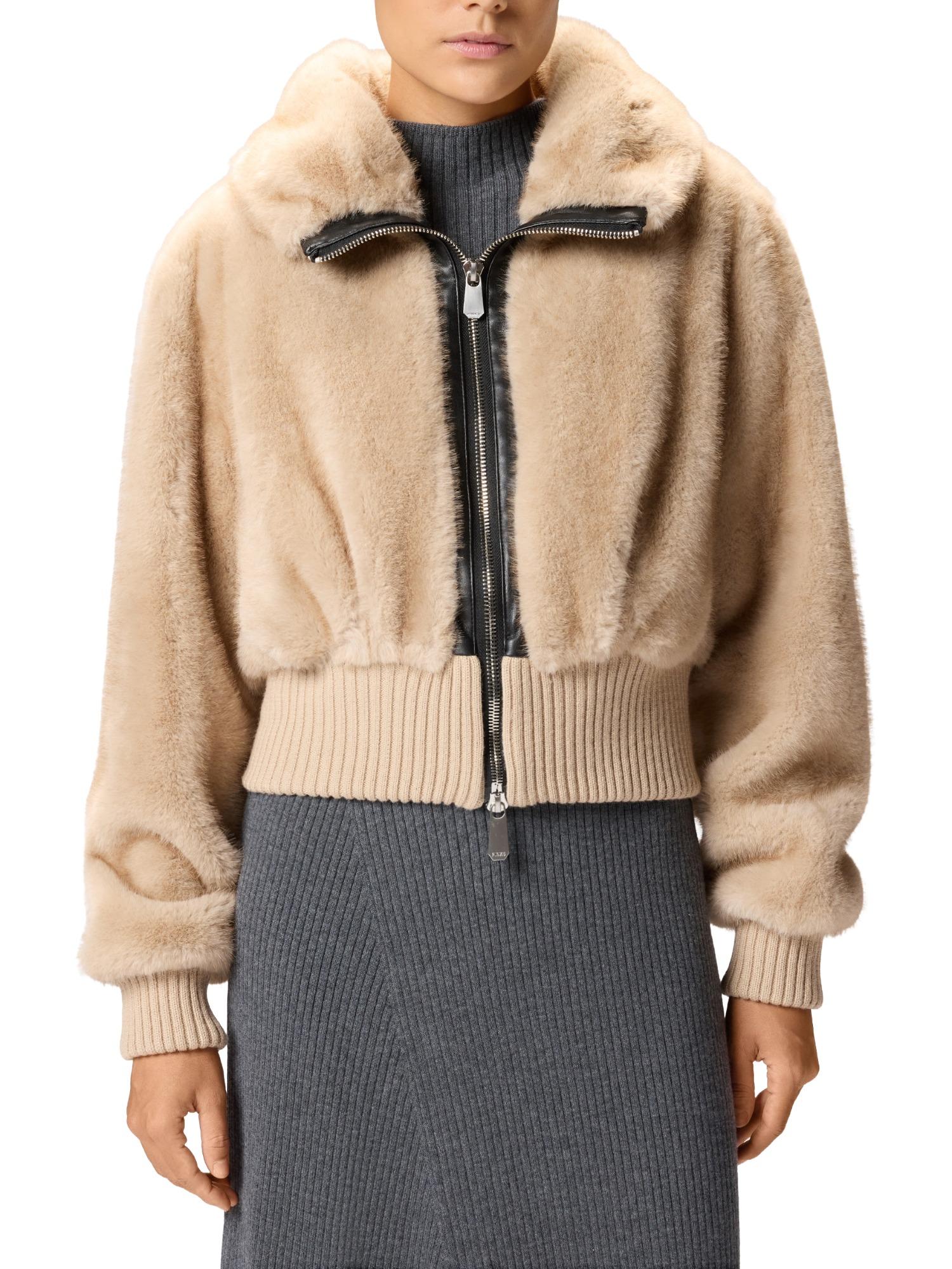 Bomber crop Pinko réalisé en fausse fourrure avec fermeture zippée frontale, bordures en similicuir, ourlet et poignets côtelés en mélange laine et poches latérales.