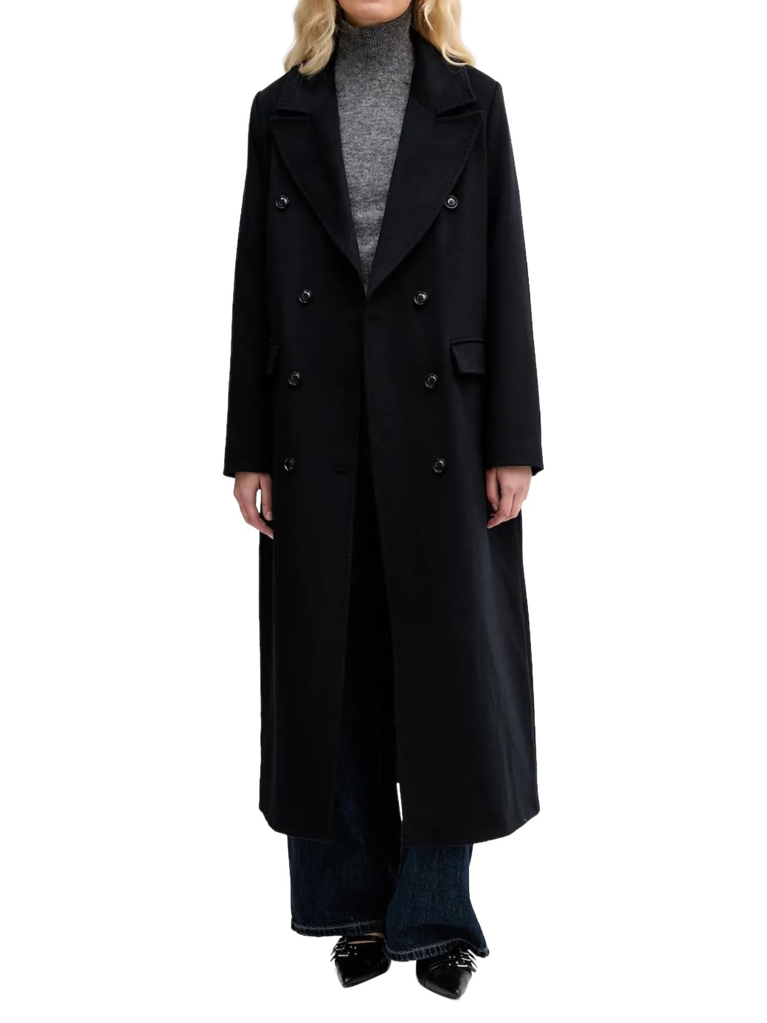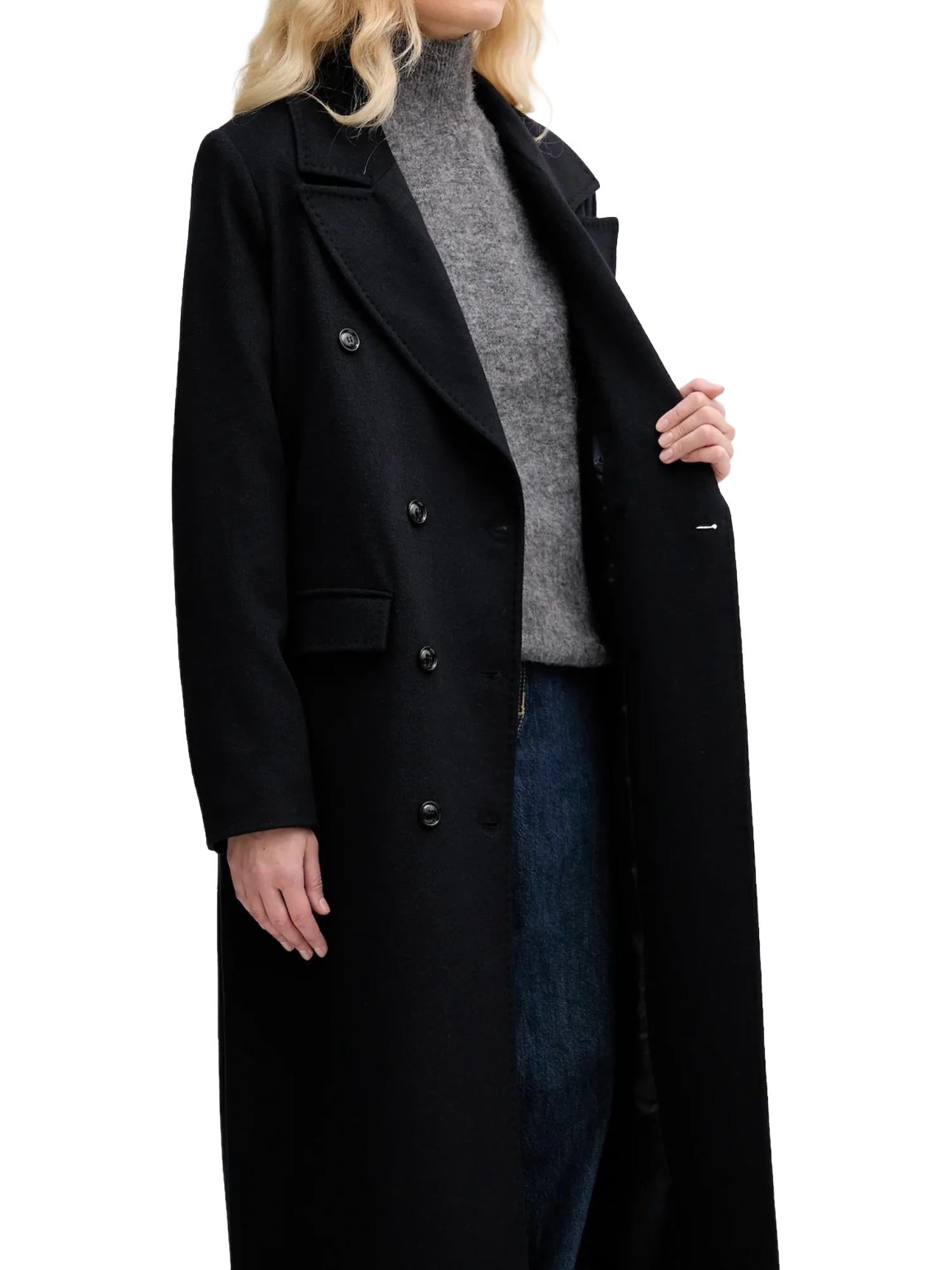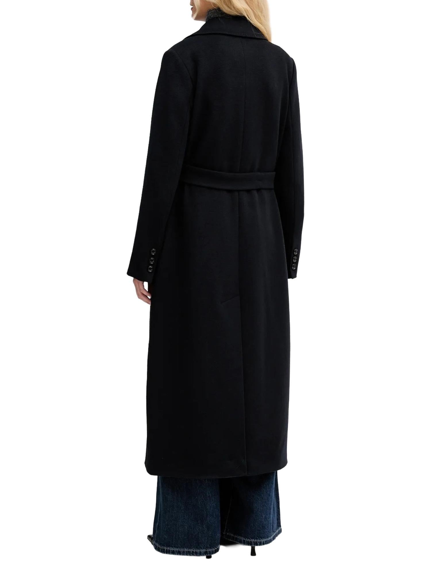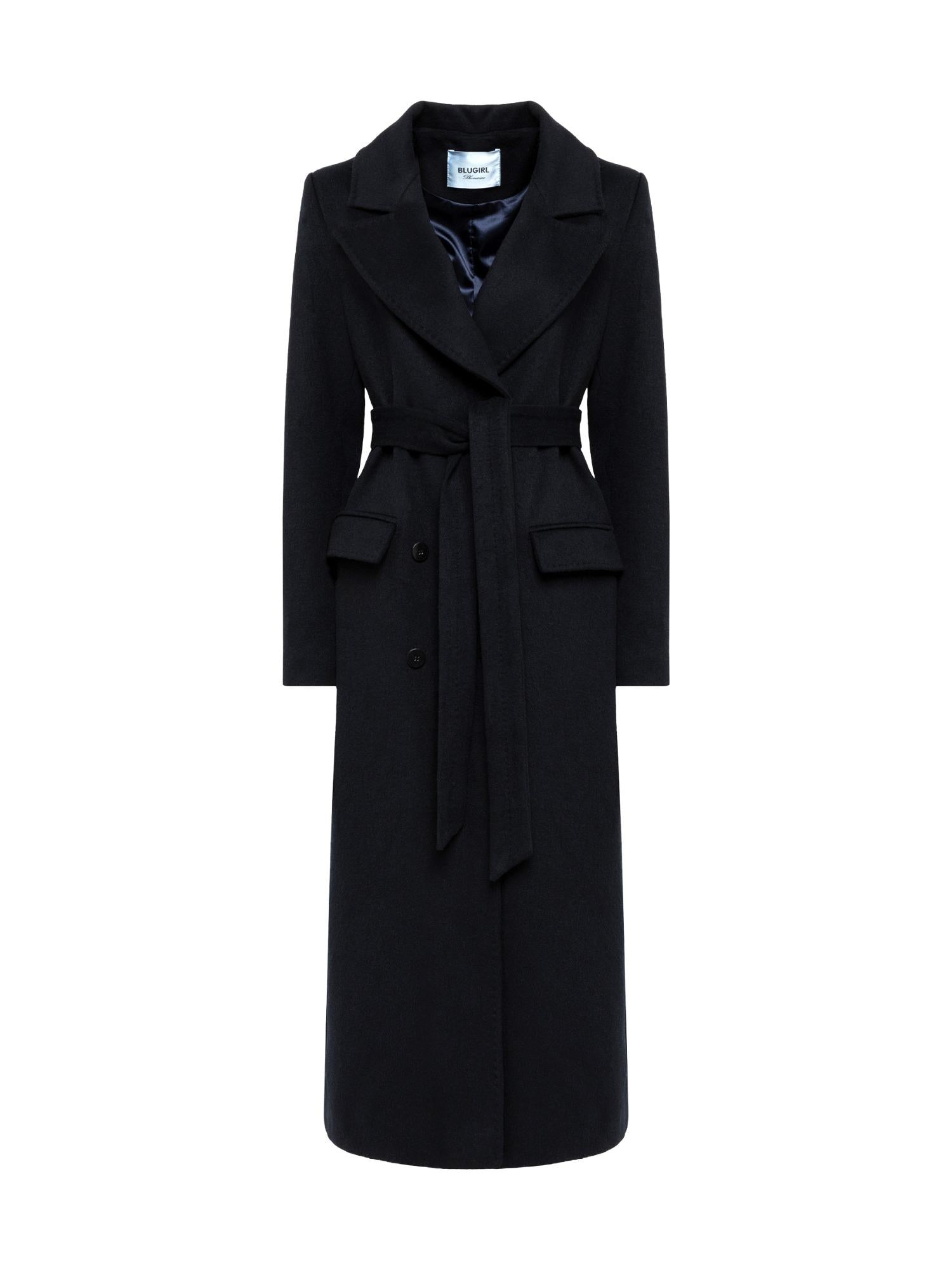 Cappotto Blugirl realizzato in panno di lana con chiusura doppiopetto tramite bottoni, revers a lancia, tasche con patte e cintura sul girovita.