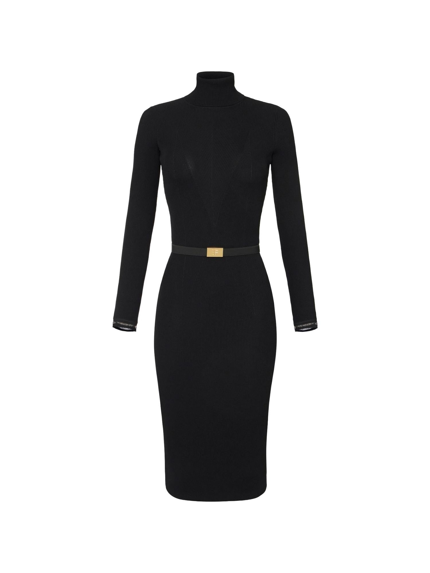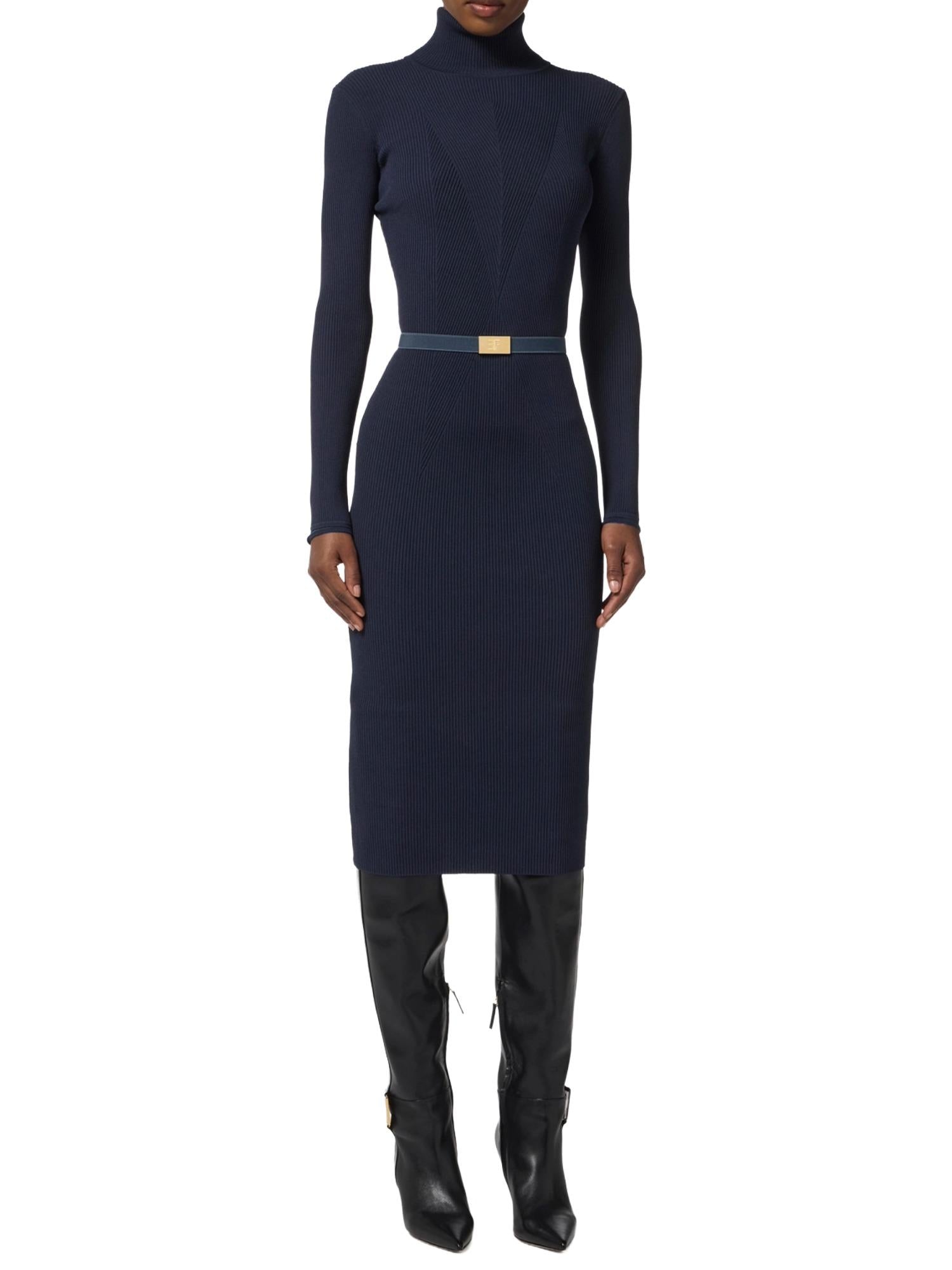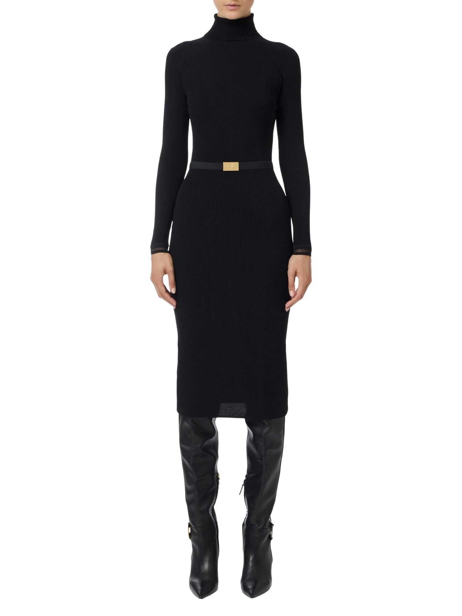 Abito midi a dolcevita Elisabetta Franchi realizzato in maglia di viscosa a costine con cintura sul girovita abbinata e polsini logati.