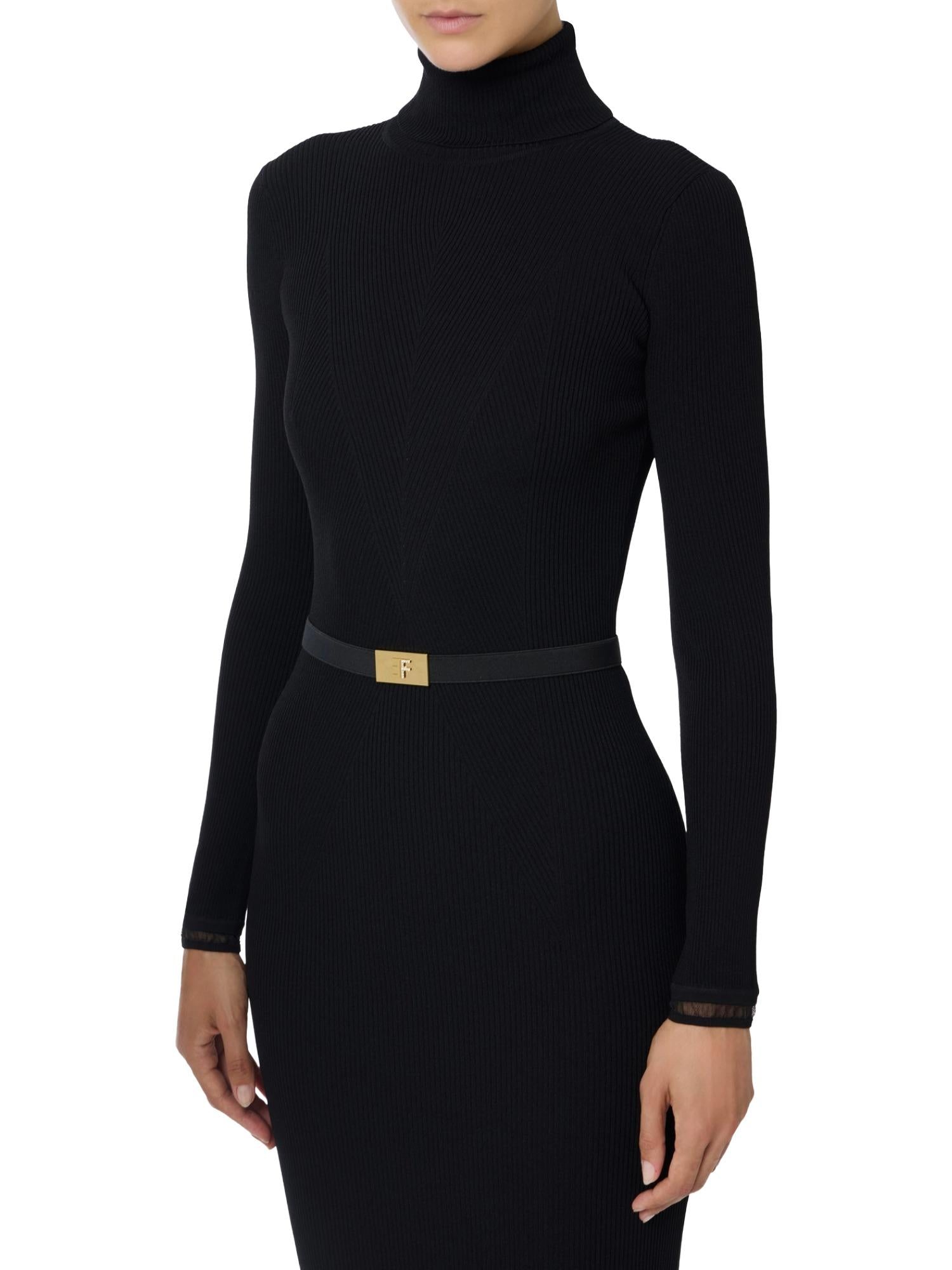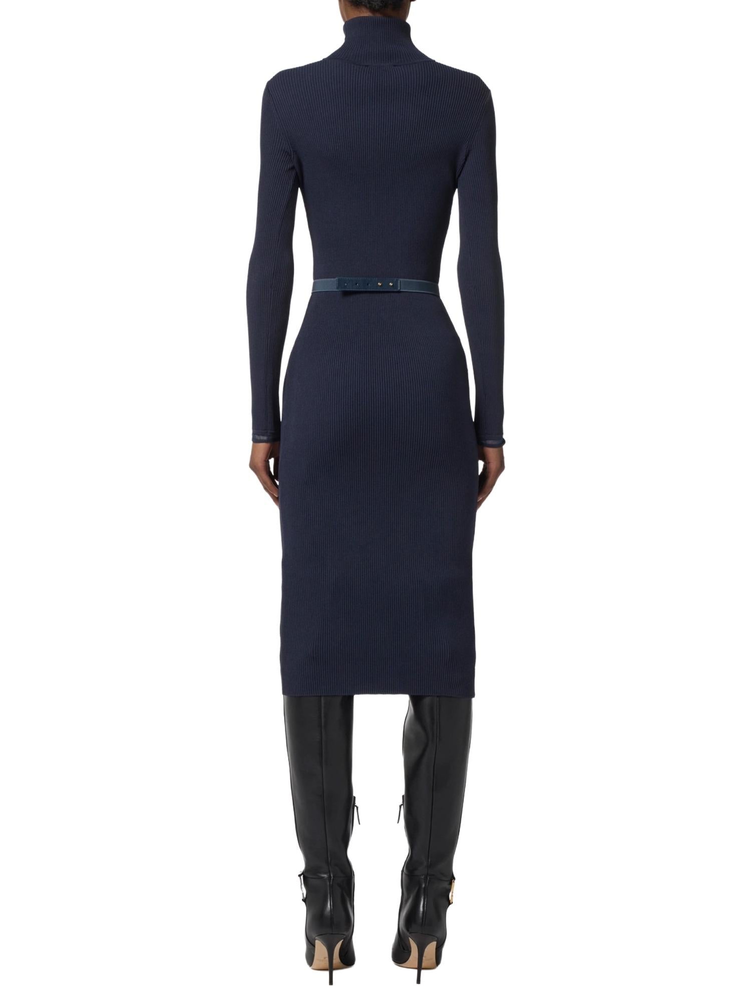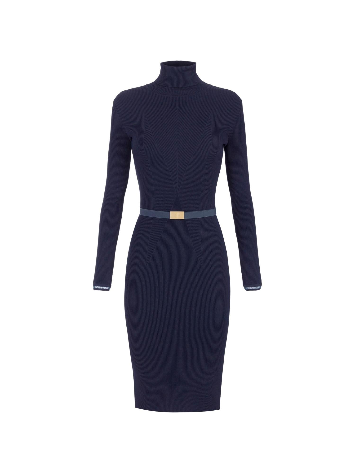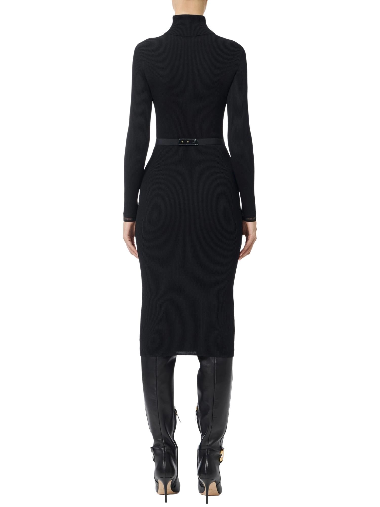 Abito midi a dolcevita Elisabetta Franchi realizzato in maglia di viscosa a costine con cintura sul girovita abbinata e polsini logati.