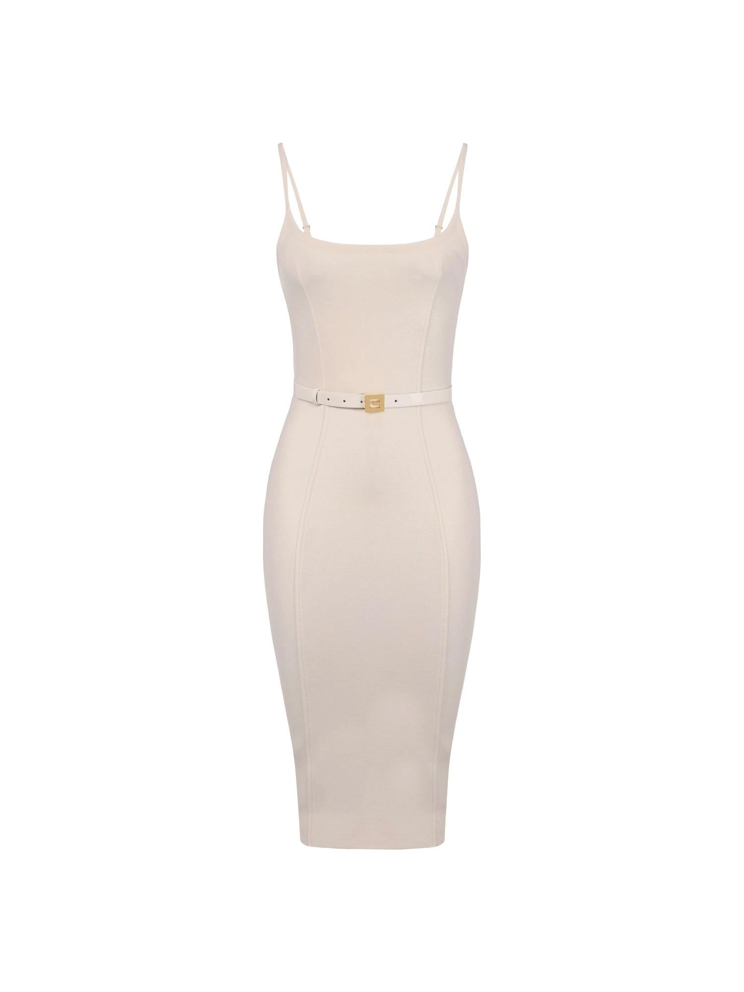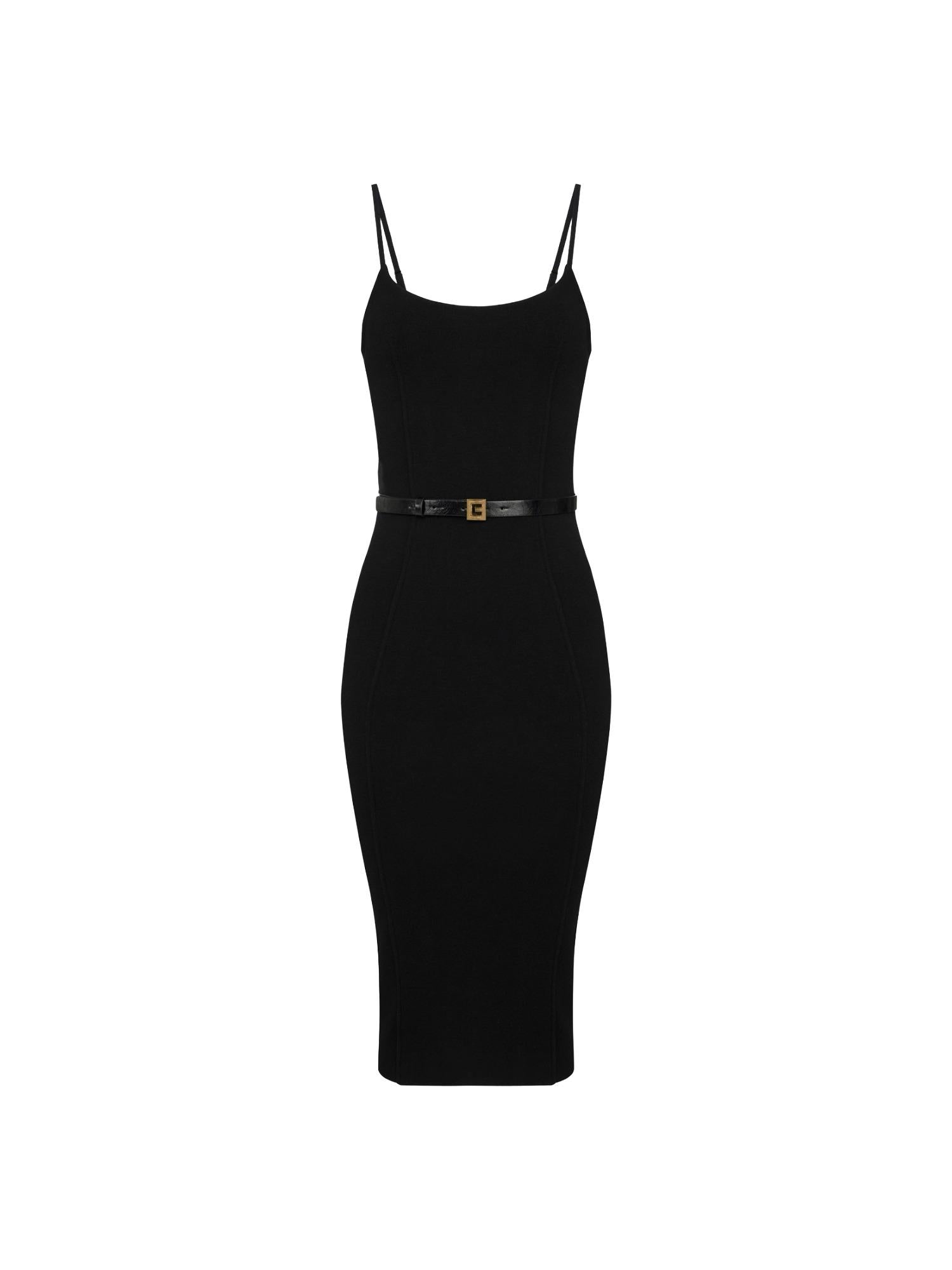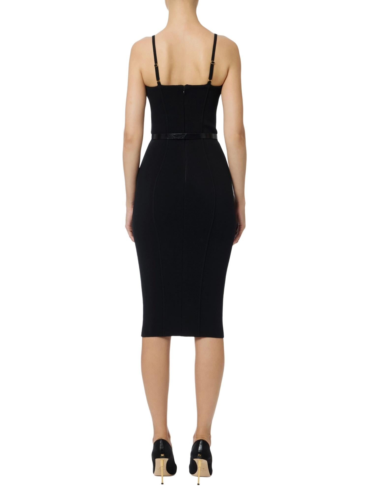 Abito midi Elisabetta Franchi realizzato in maglia di lana con chiusura posteriore tramite zip, design con spalle scoperte e cintura sul girovita abbinata.
