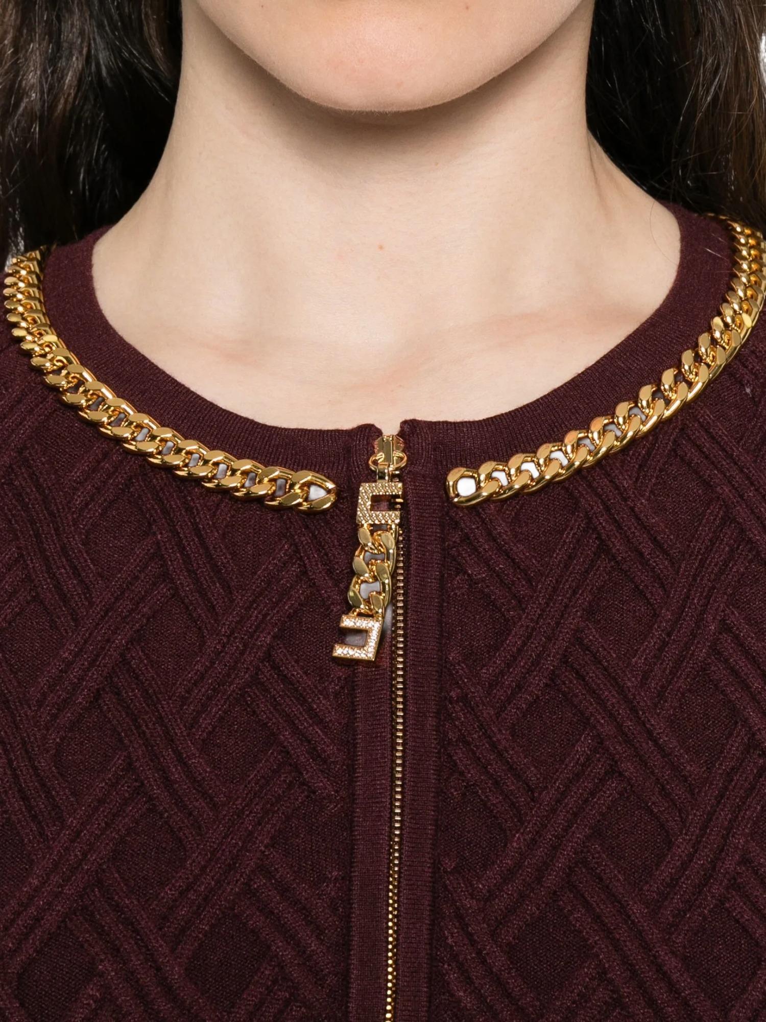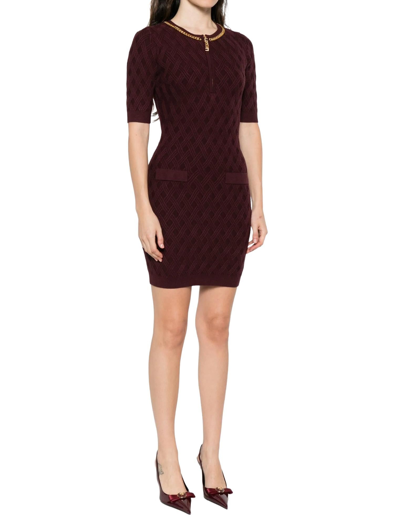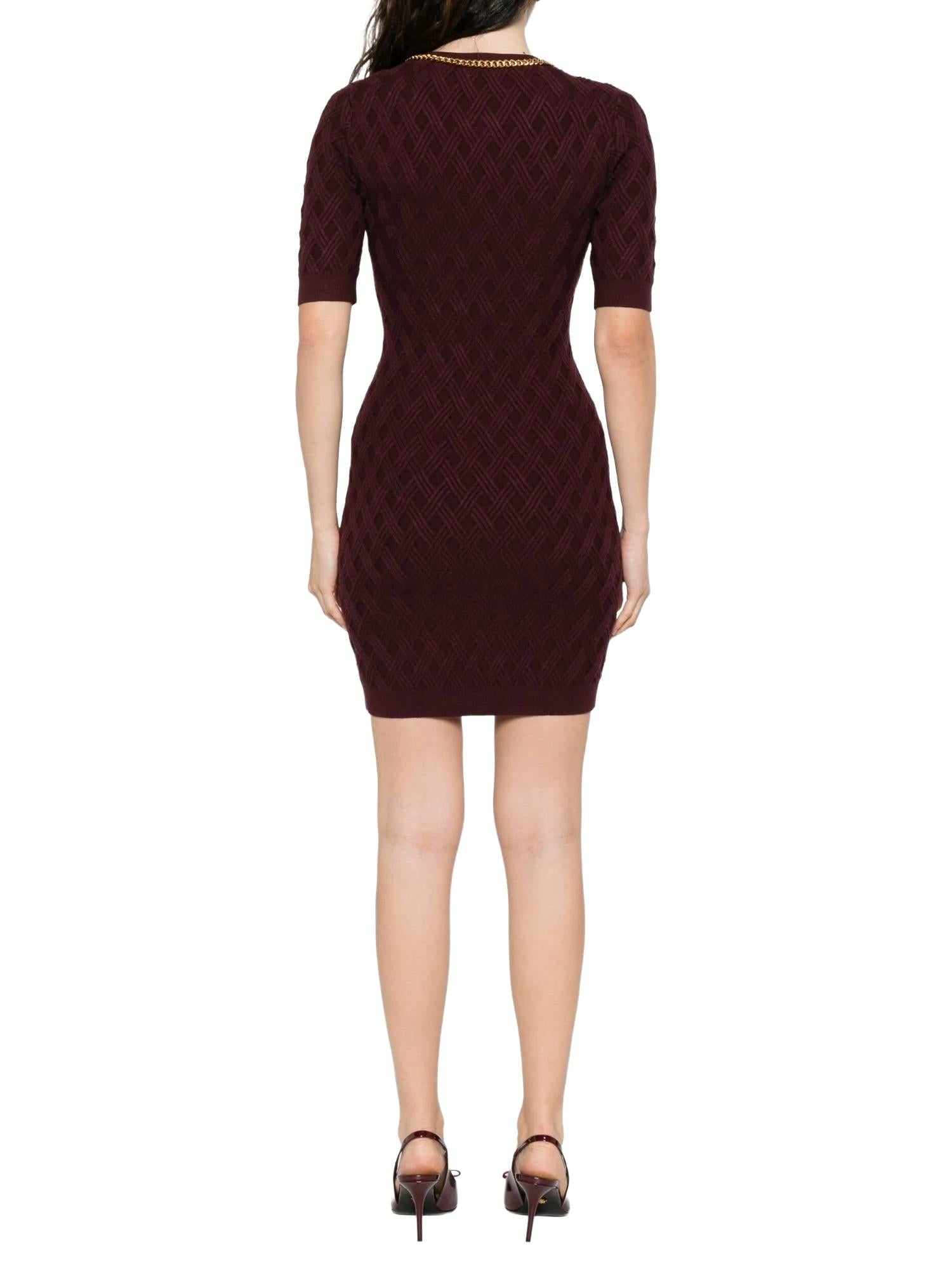 Abito corto Elisabetta Franchi realizzato in maglia a rombi con zip frontale e collana gioiello abbinata.