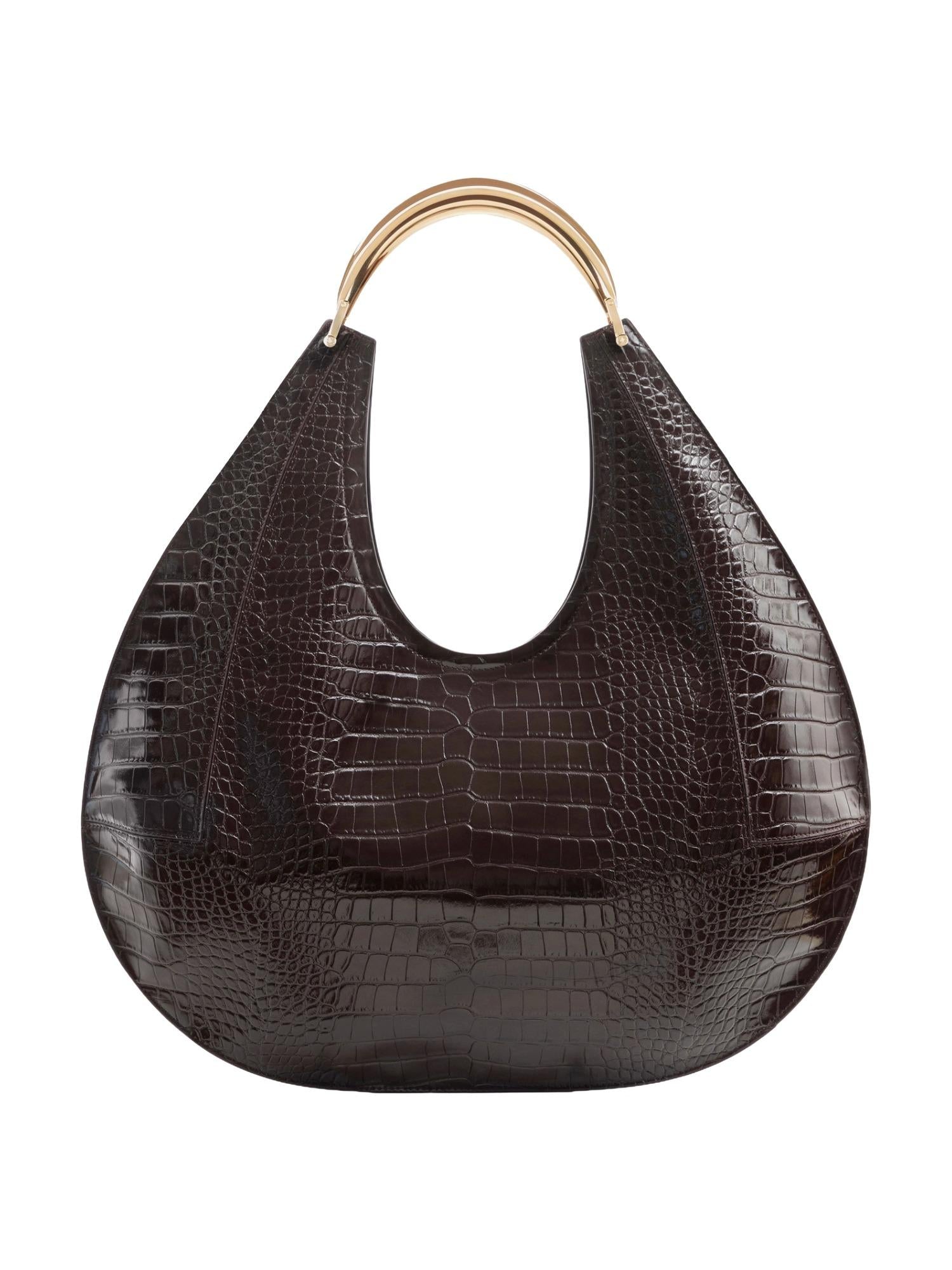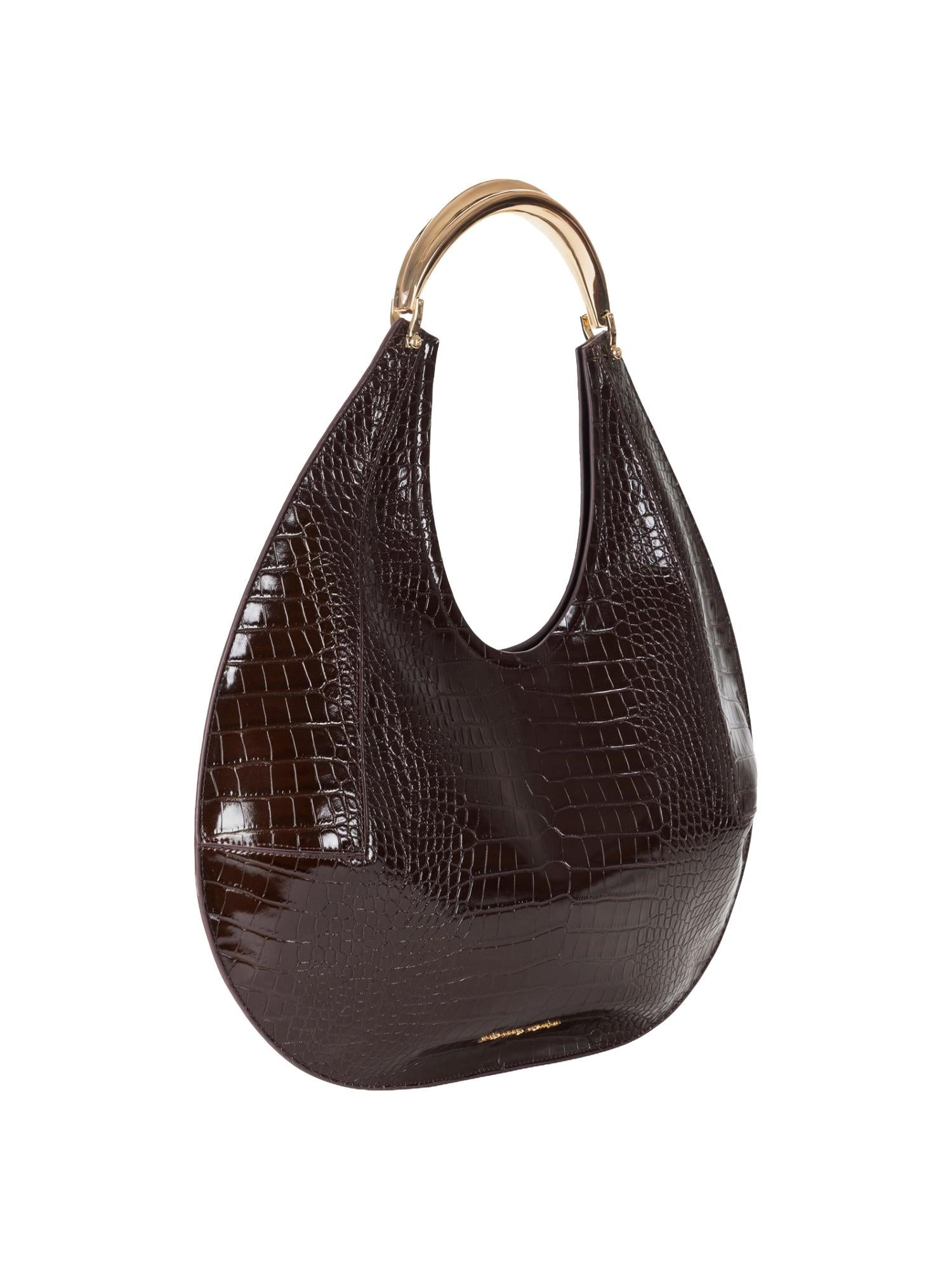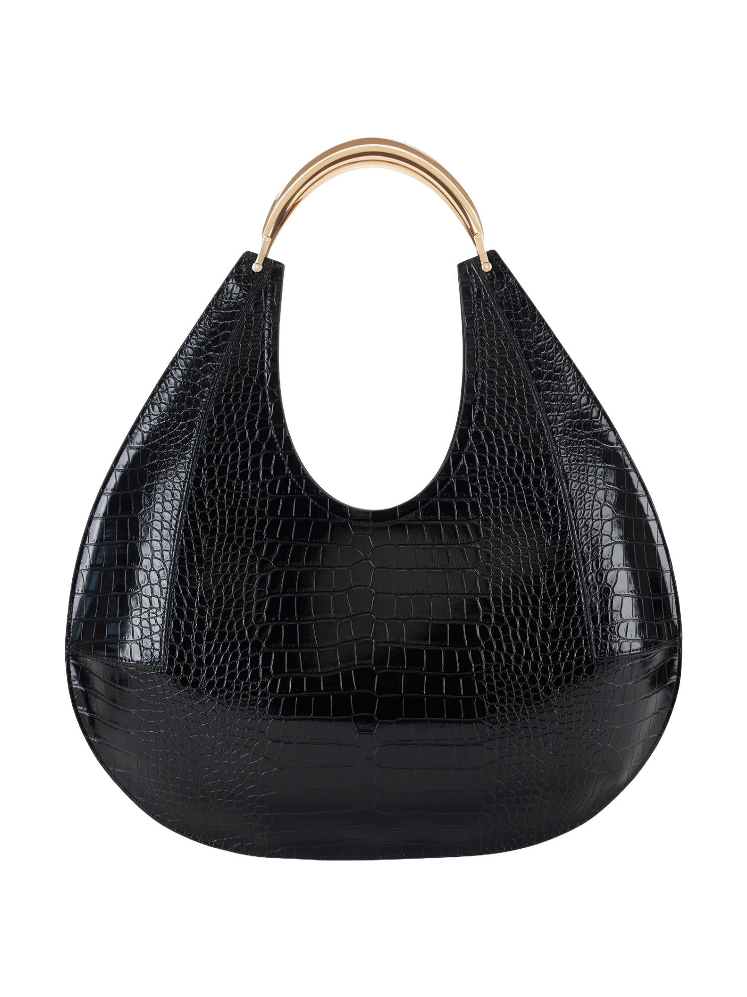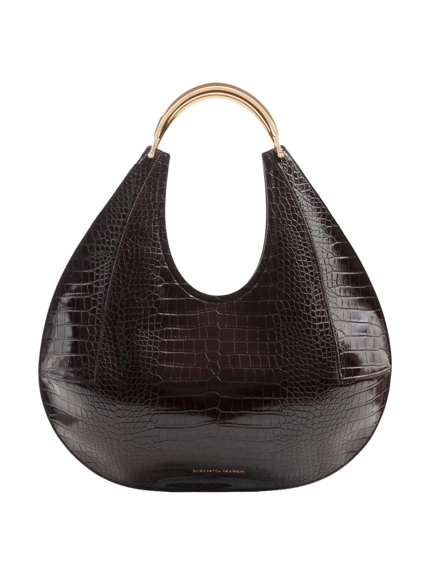 Borsa hobo di grandi dimensioni Elisabetta Franchi realizzata in ecopelle stampa coccodrillo con manico gioiello, chiusura magnetica, tasca interna con zip e logo frontale.