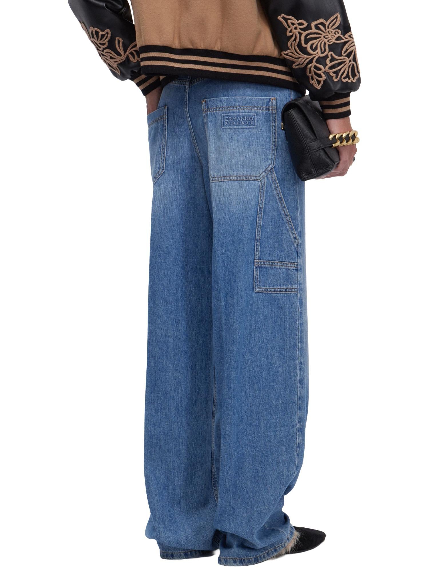 Jeans carpenter Ermanno Firenze realizzato in denim fermo con chiusura tramite zip e bottone, passanti per la cintura, cinturini laterali per la regolazione, 6 tasche e logo sul retro.
