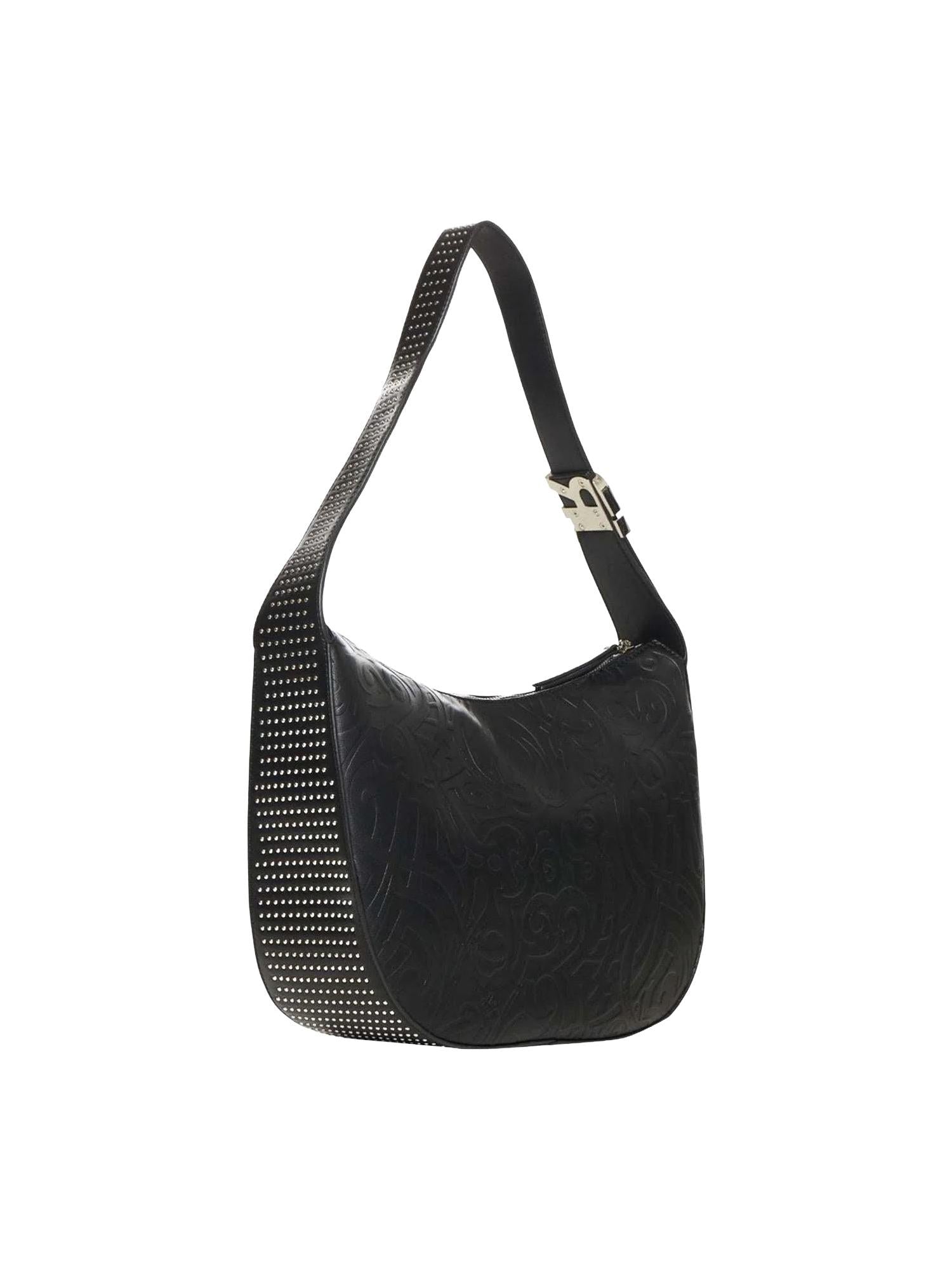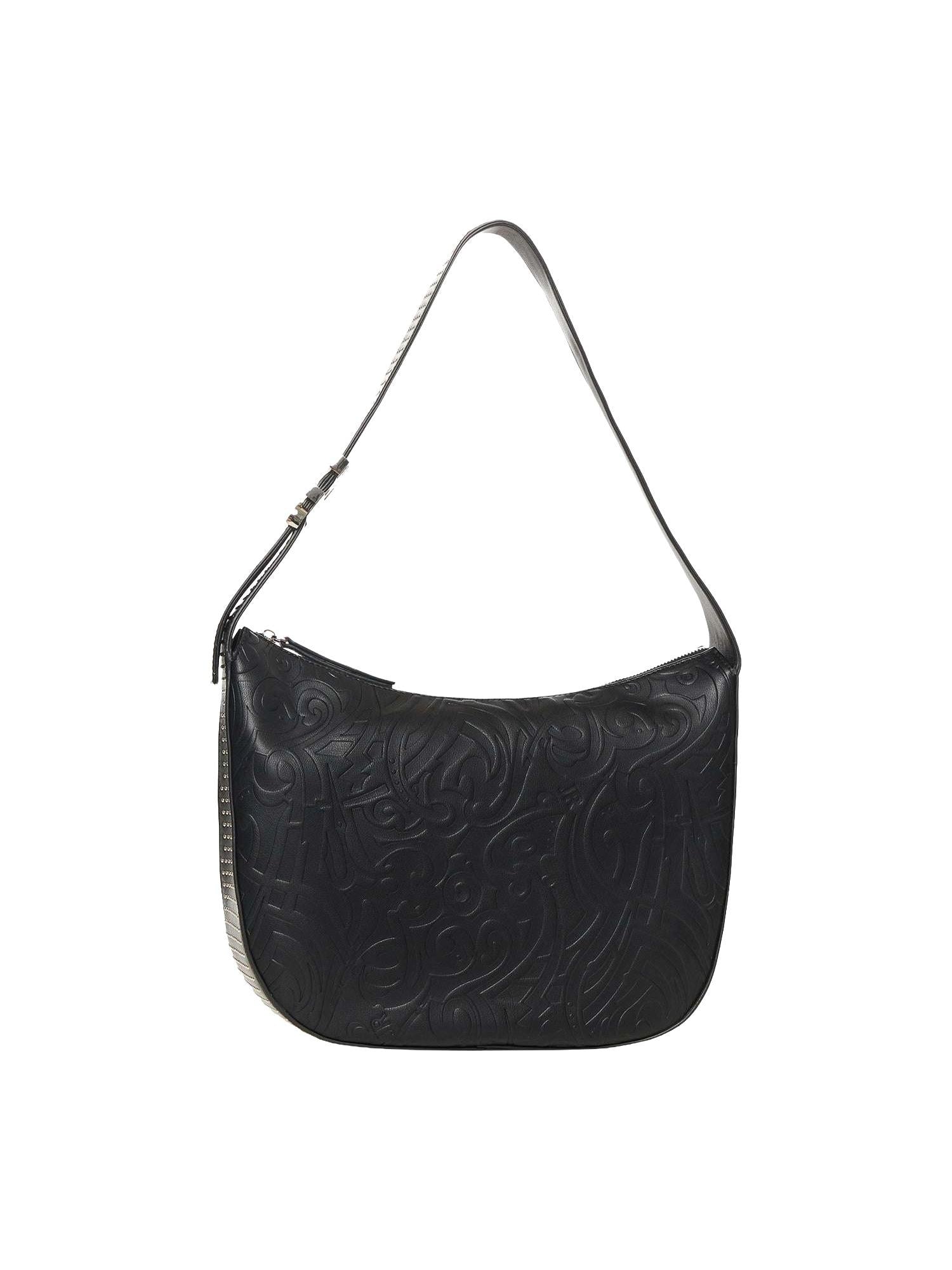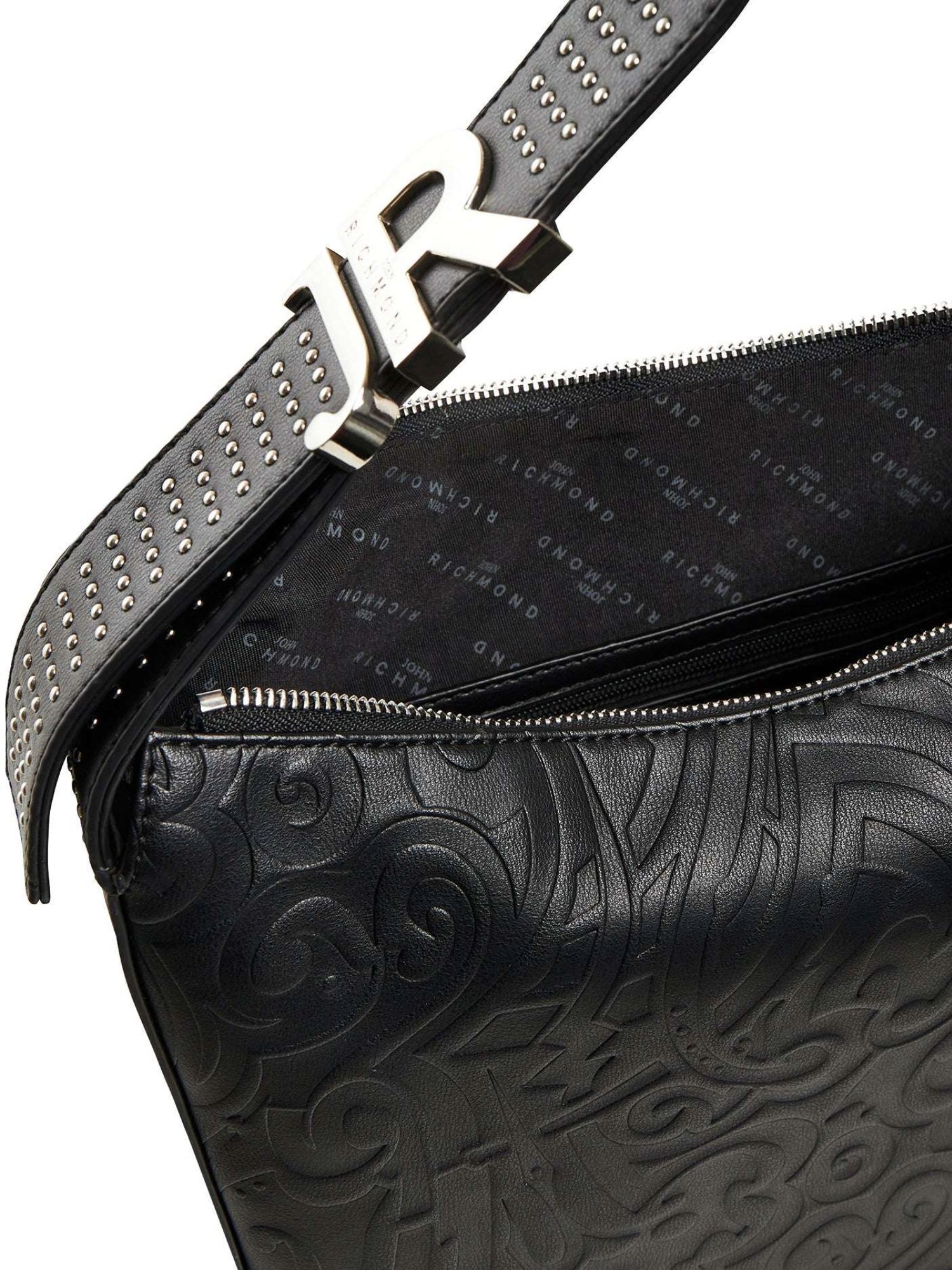 Borsa John Richmond realizzata in ecopelle con design astratto inciso, manico piatto regolabile con placca logo, chiusura tramite zip e borchie applicate.