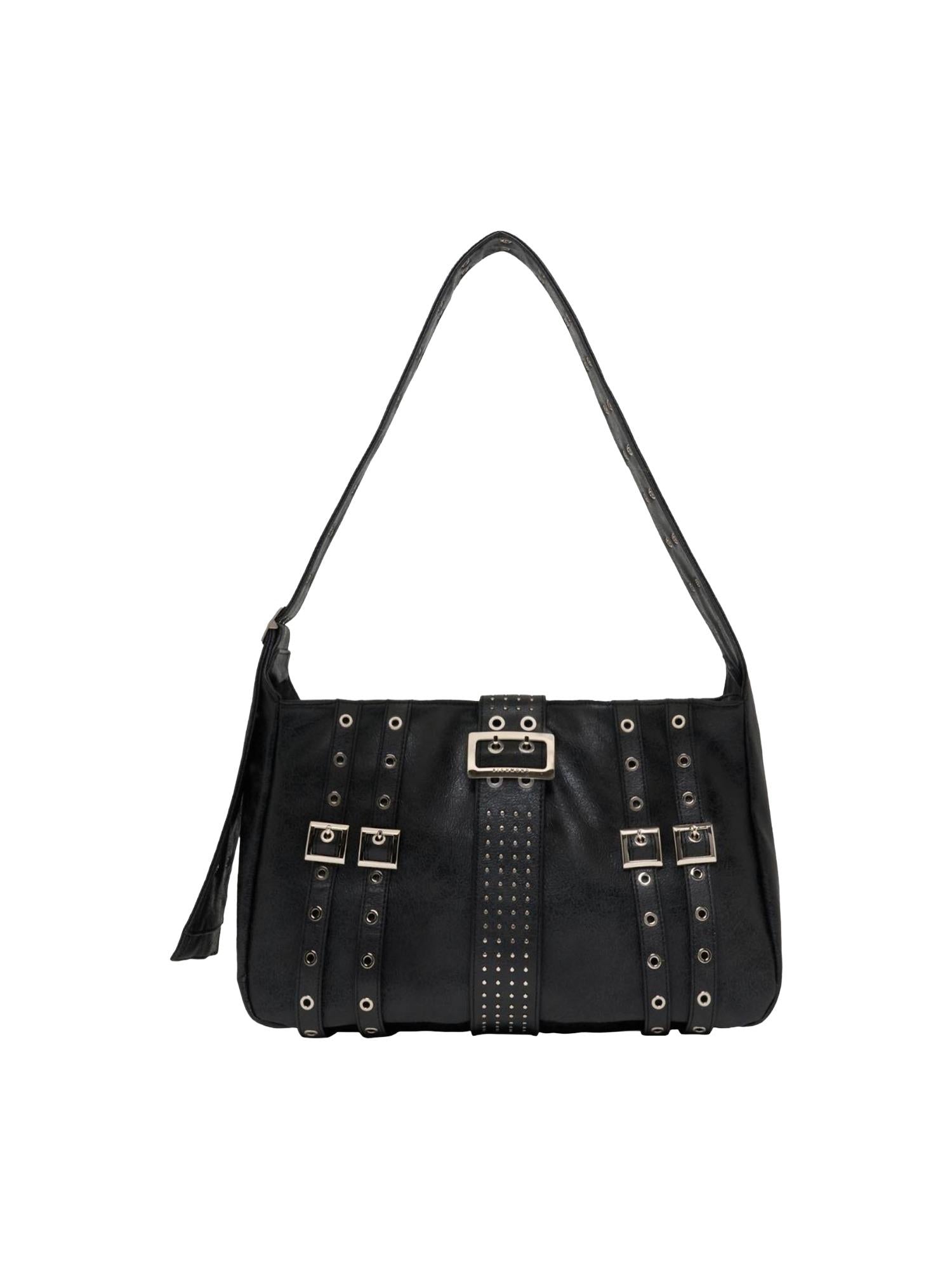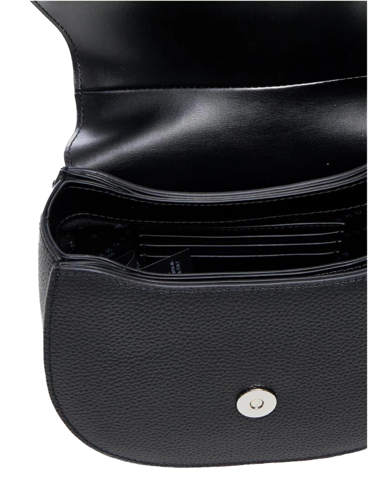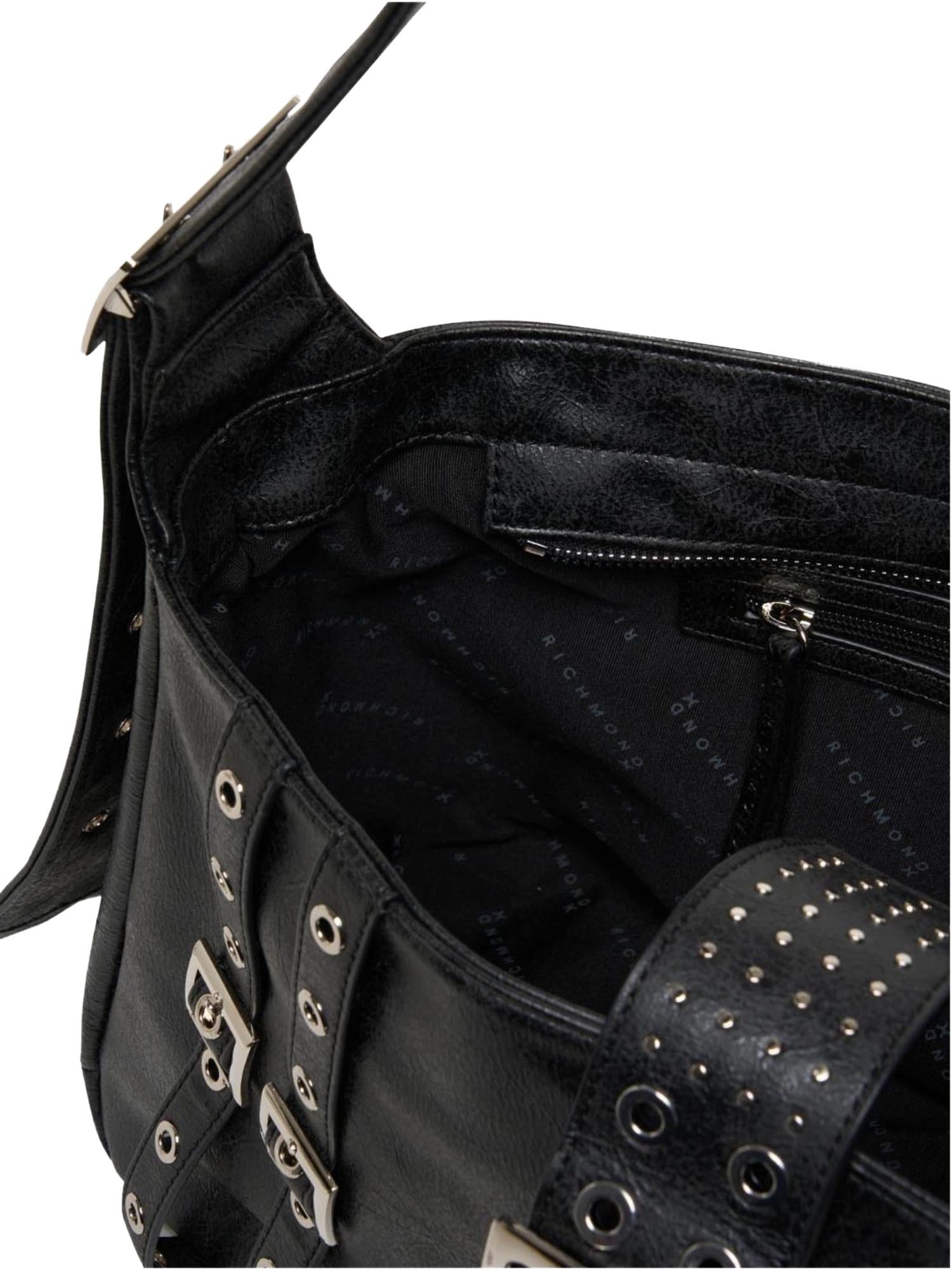 Borsa John Richmond realizzata in ecopelle con chiusura tramite bottone magnetico, manico piatto regolabile, tasca interna con zip e cinturini con fibbie applicati sul davanti.