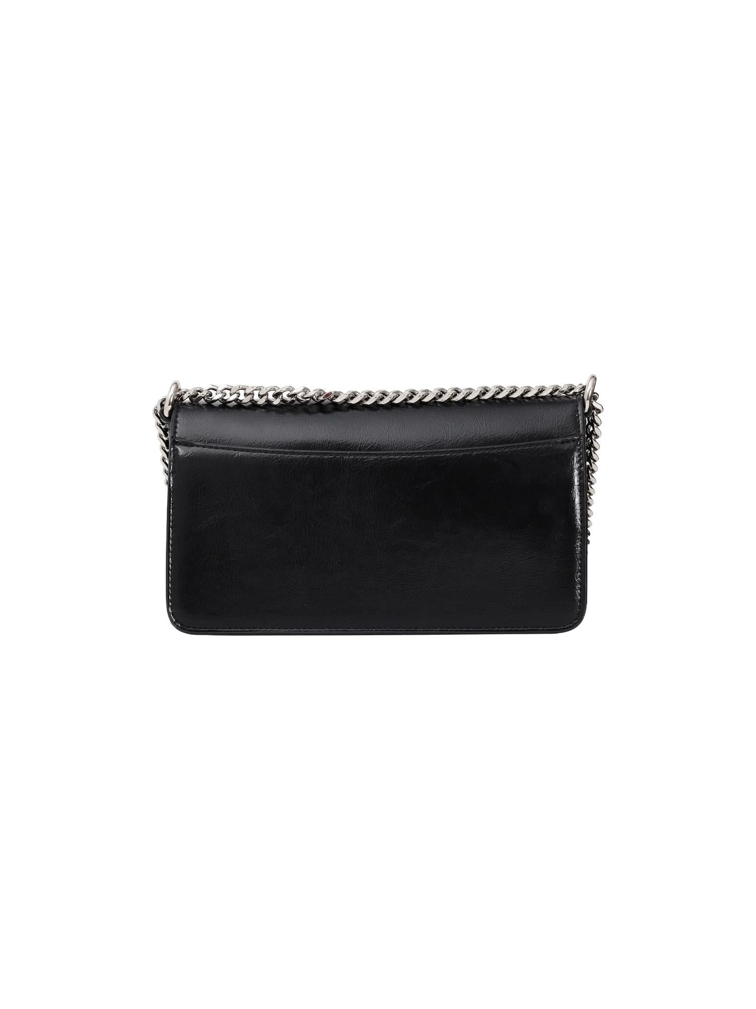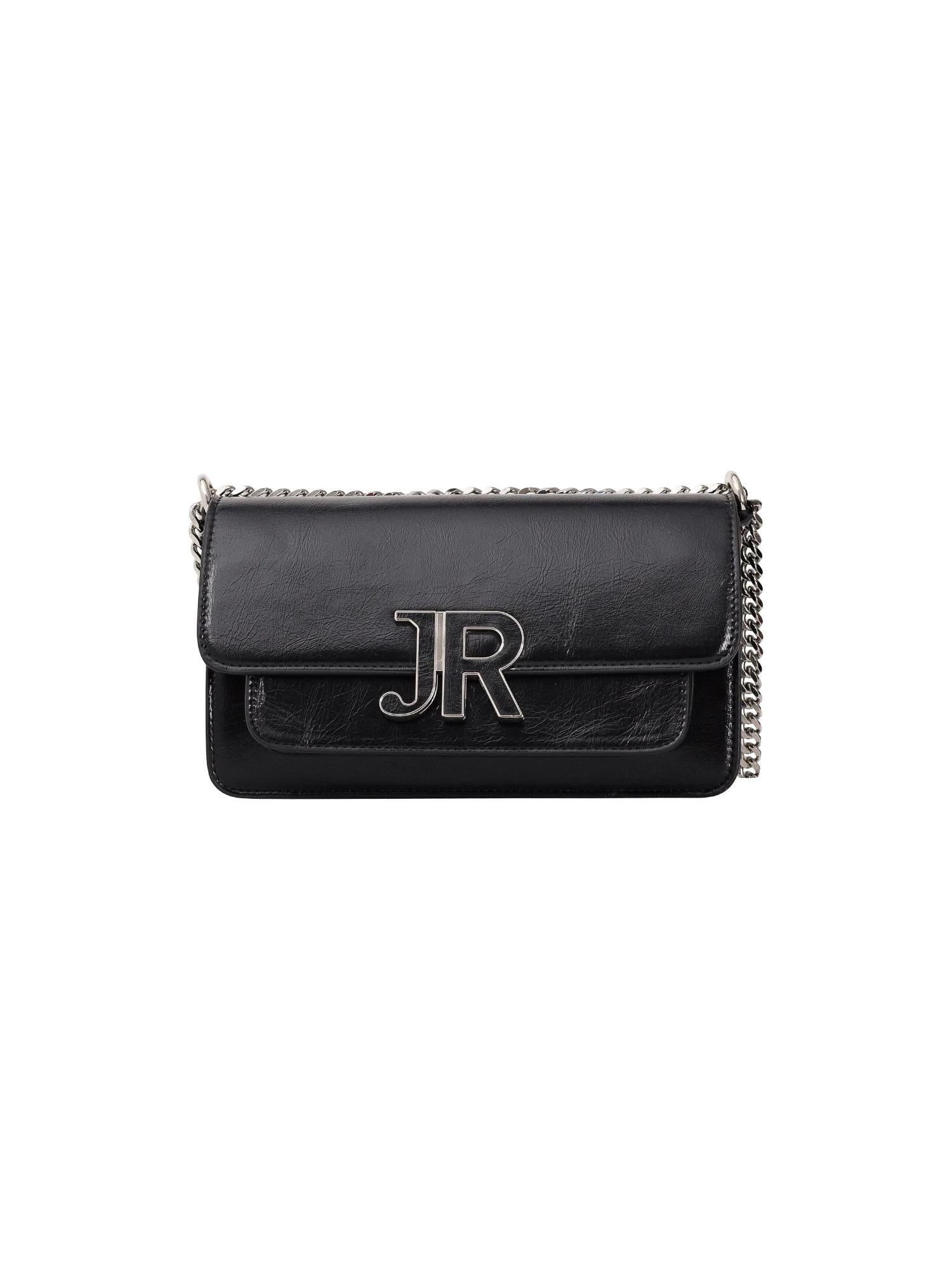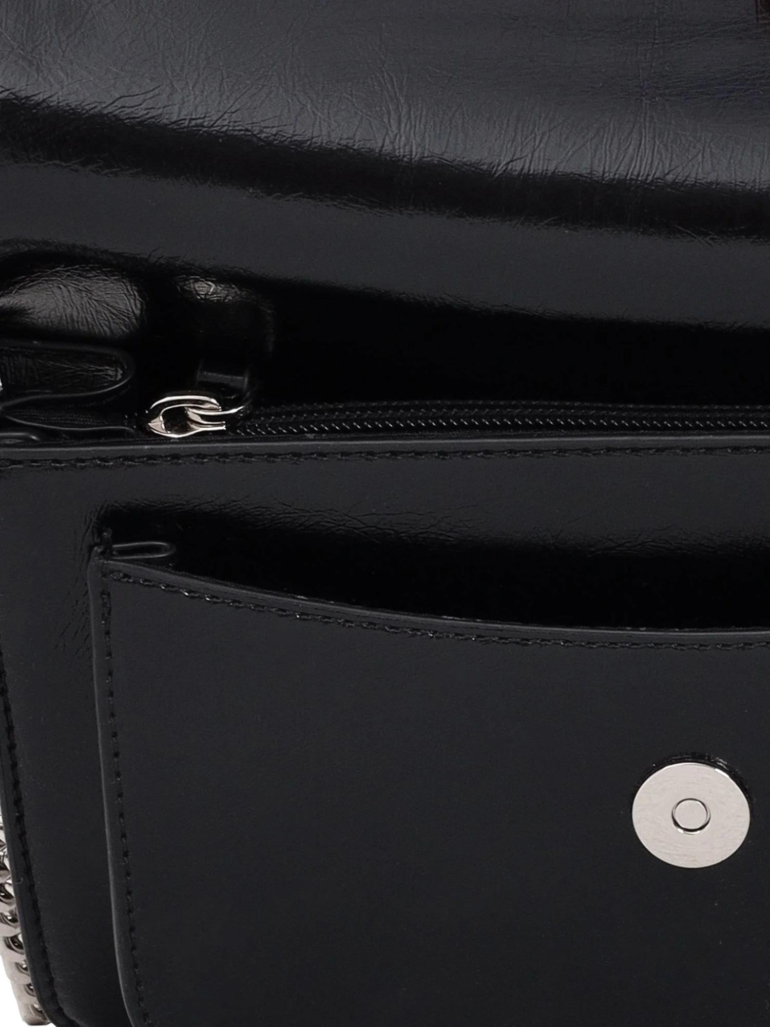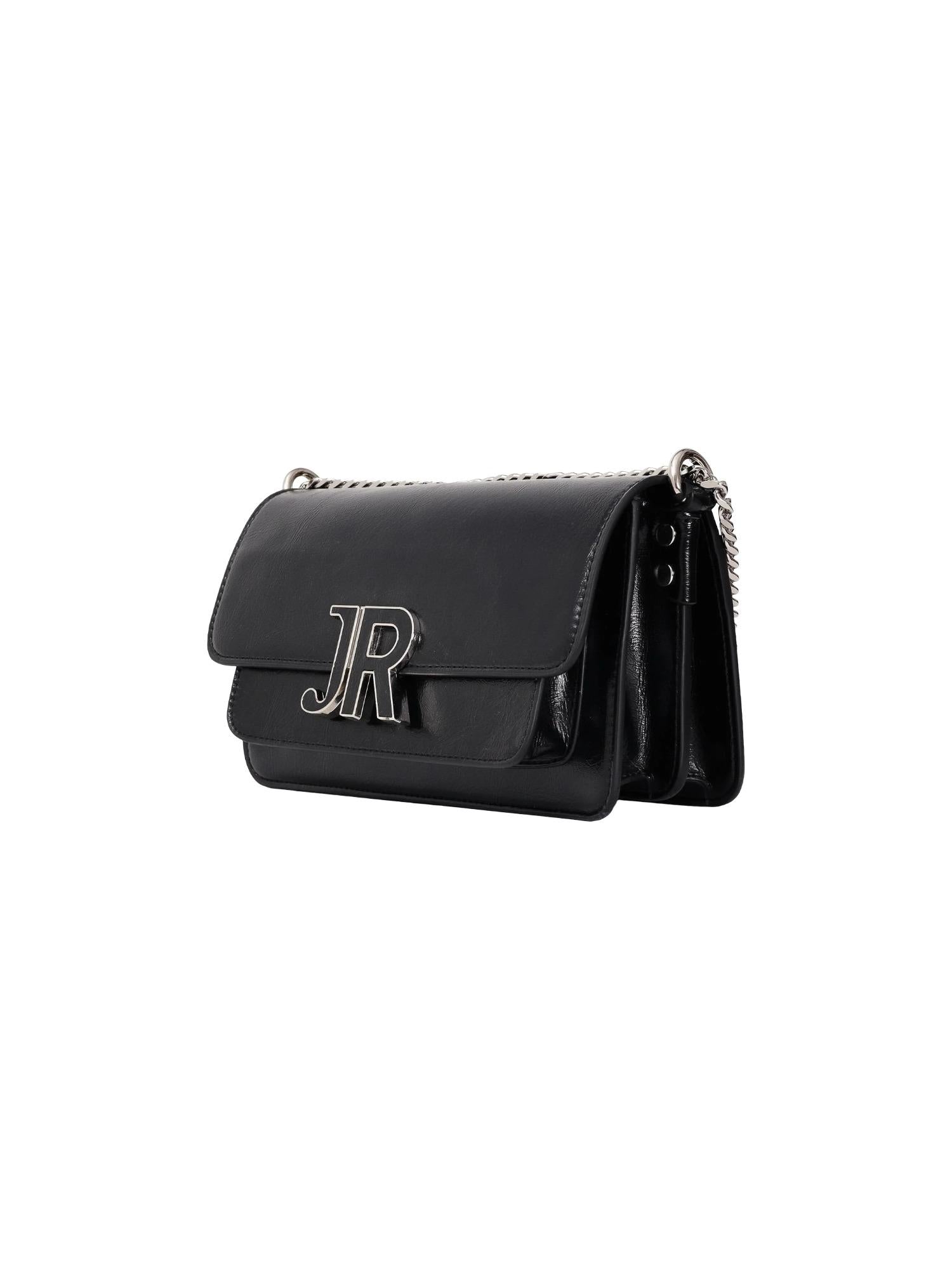 Borsa John Richmond realizzata in ecopelle lucida con chiusura tramite bottone magnetico, tracolla in catena con spallaccio, tasca interna con zip e placca logo frontale.