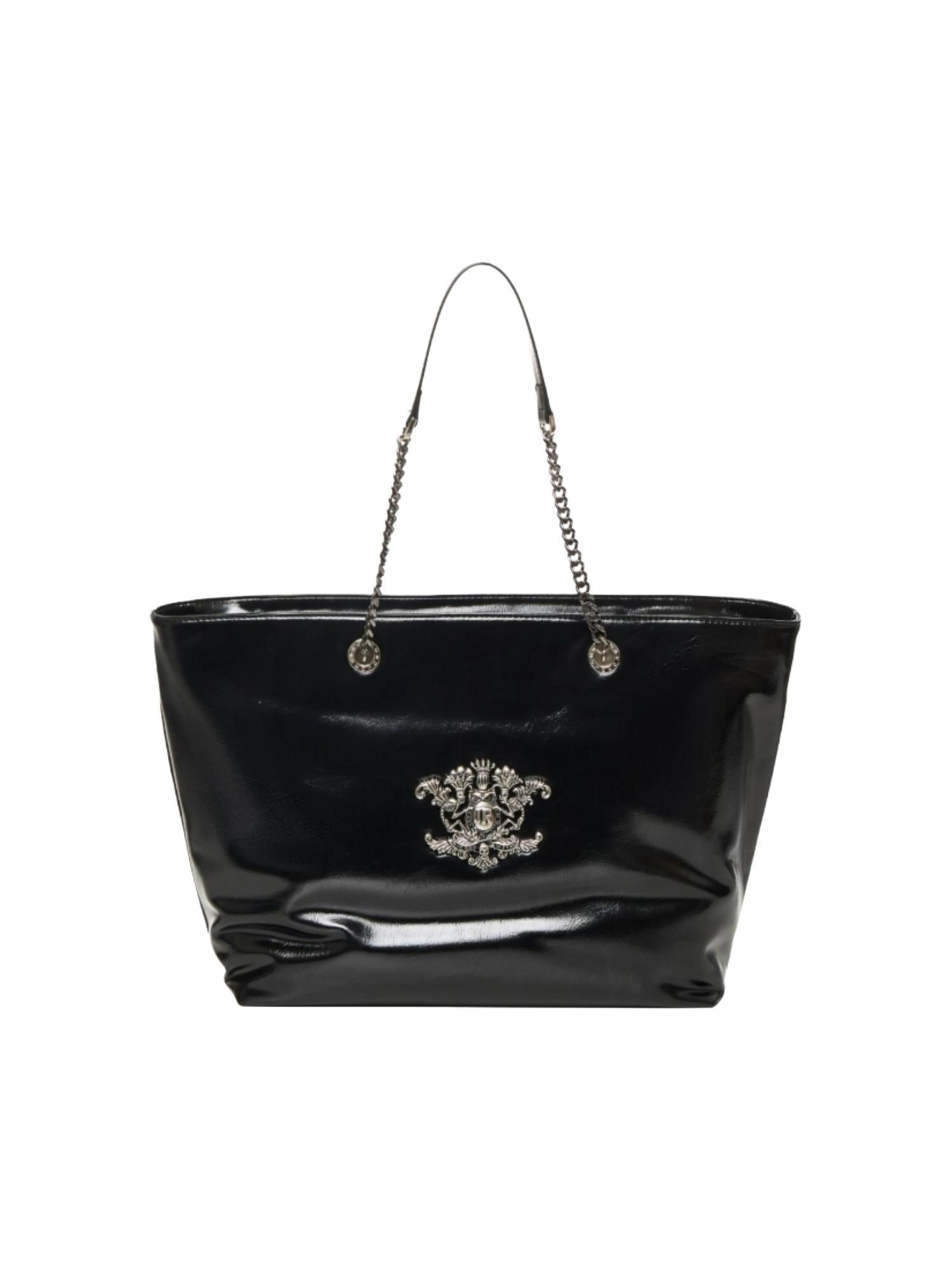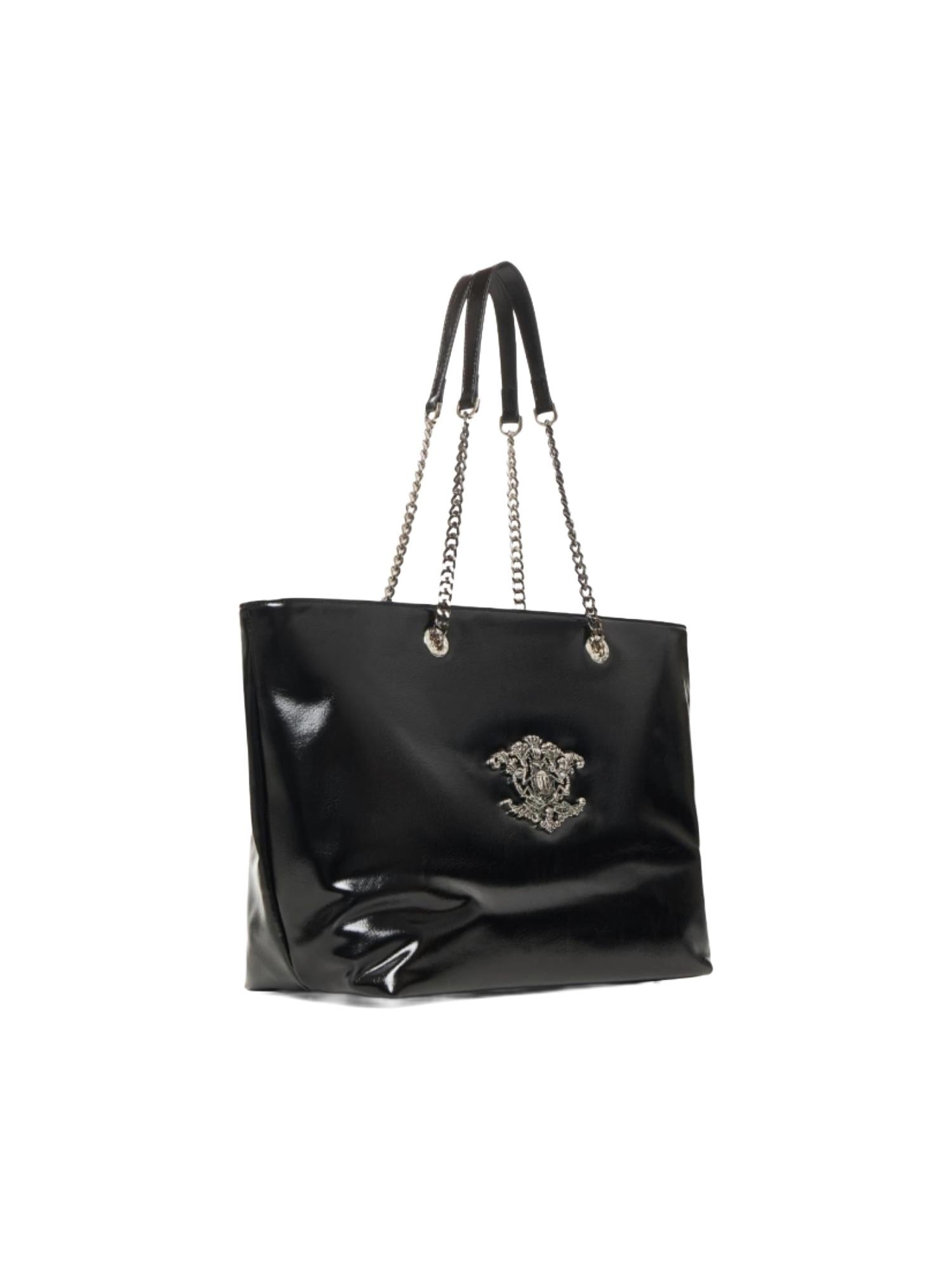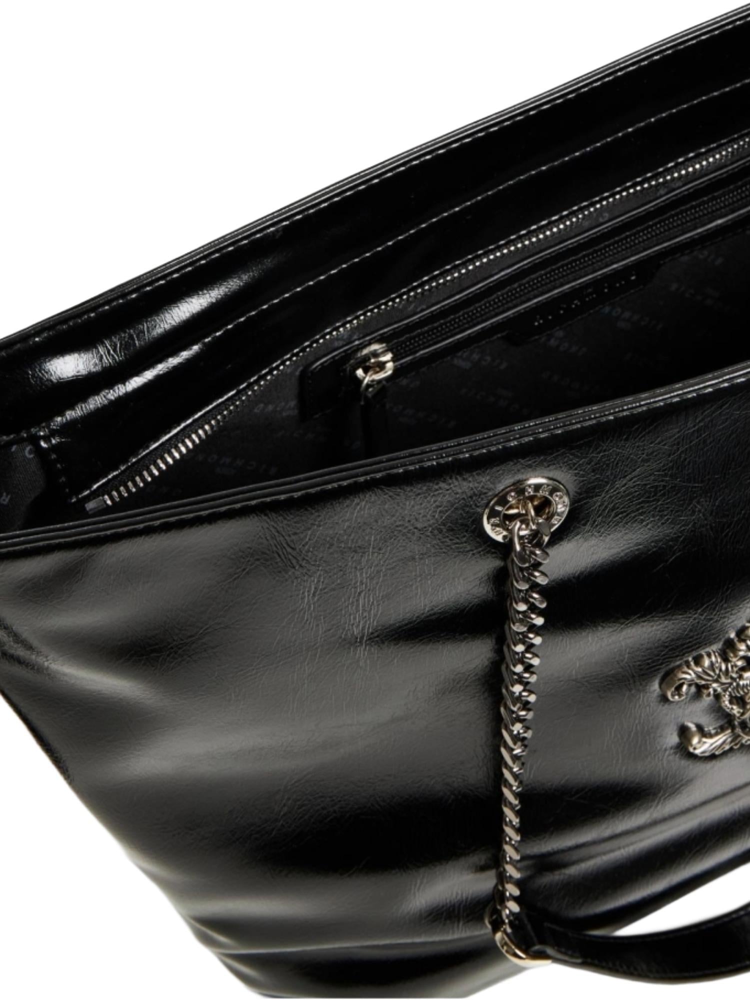 Borsa shopper John Richmond realizzata in ecopelle lucida con chiusura tramite zip, manico in catena con impugnatura e logo frontale.