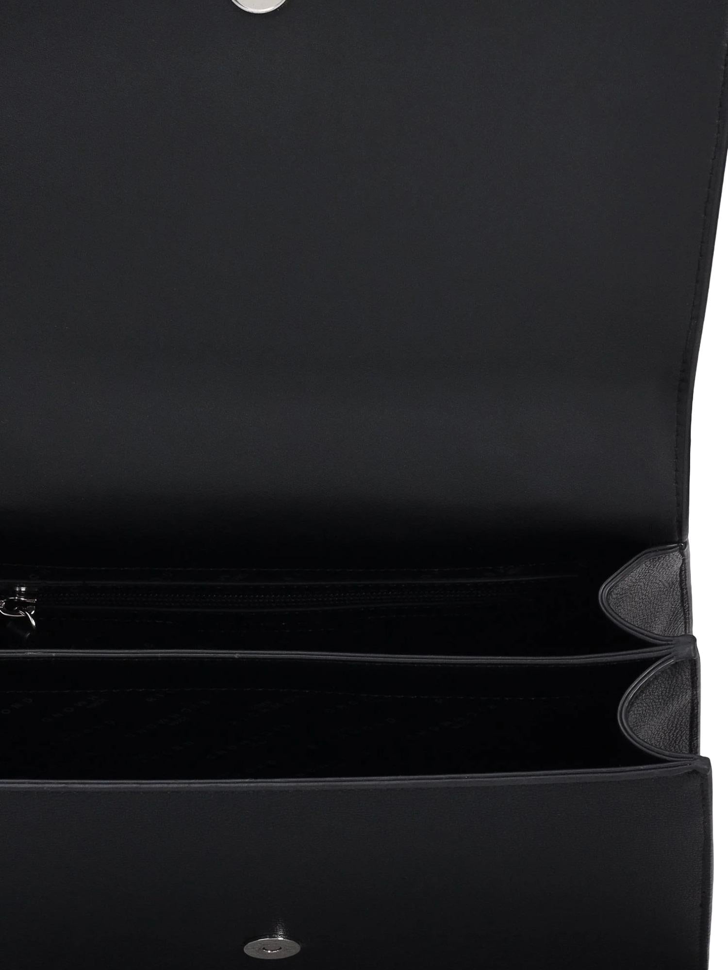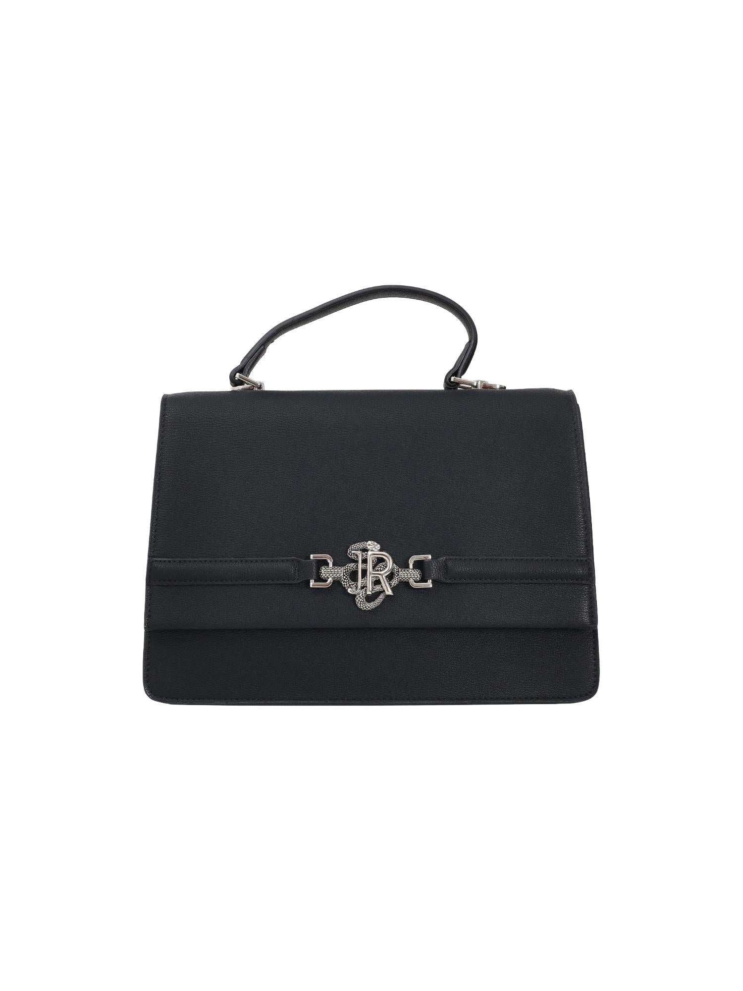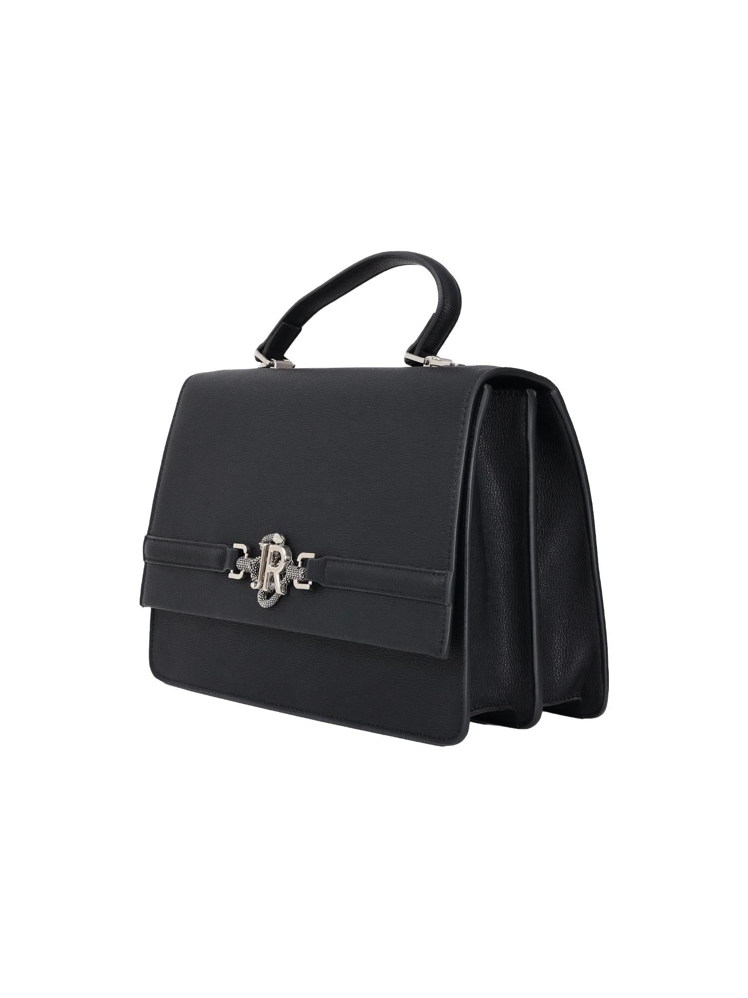 Borsa John Richmond realizzata in ecopelle con chiusura magnetica, manico piatto, doppio scomparto interno, tasca con zip, tracolla removibile e logo con serpente frontale.