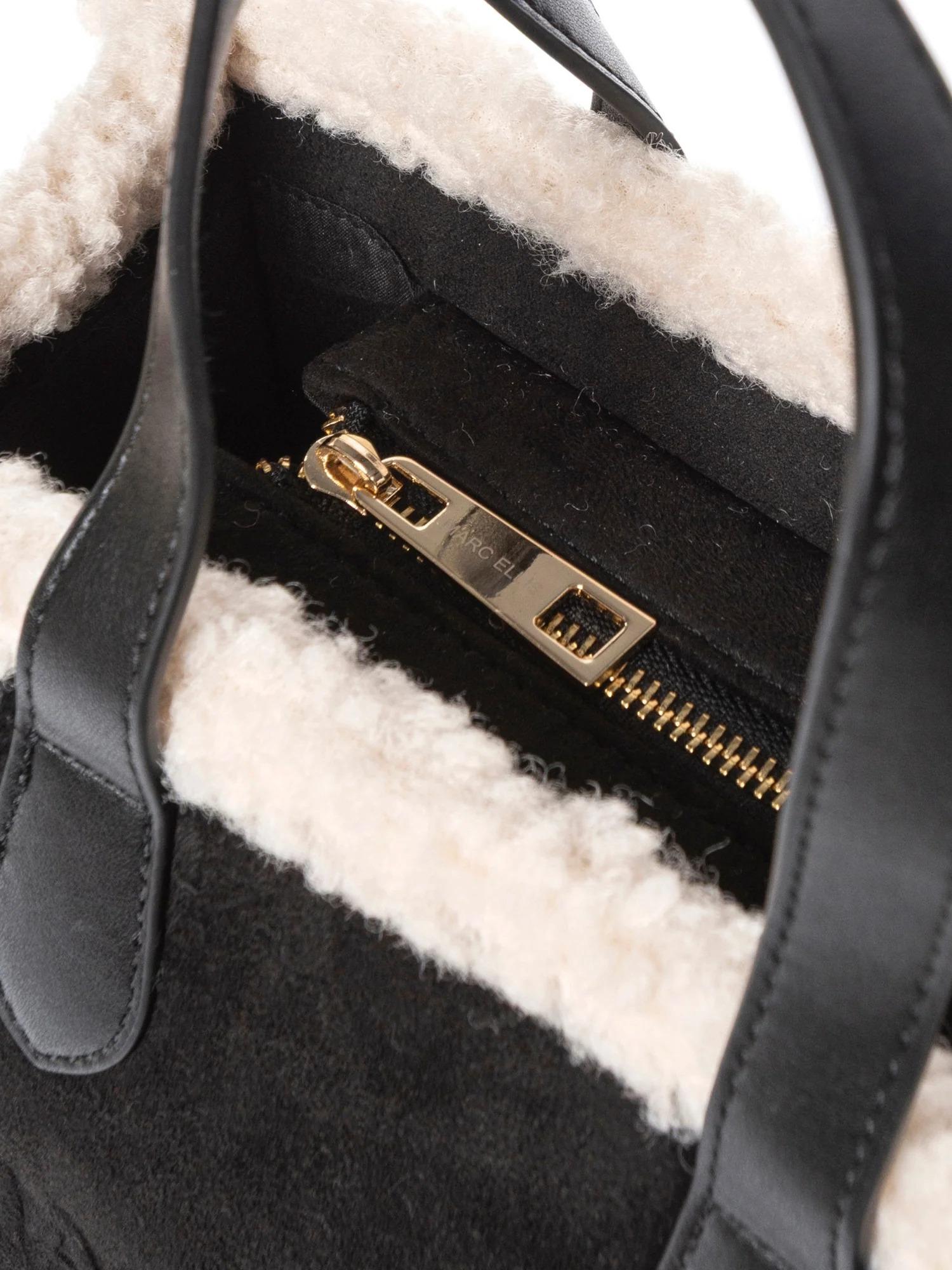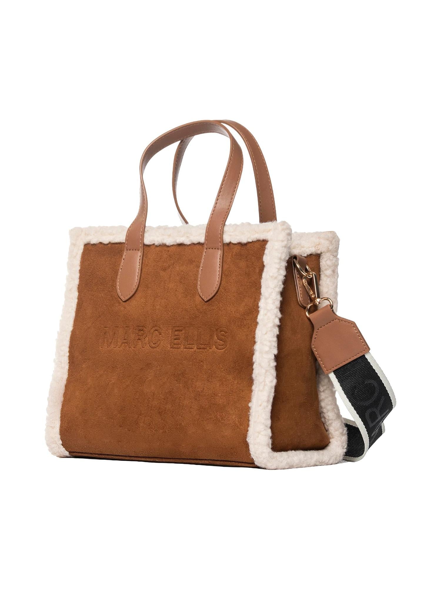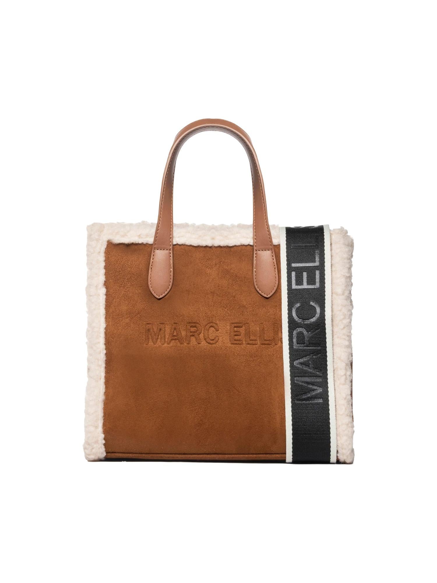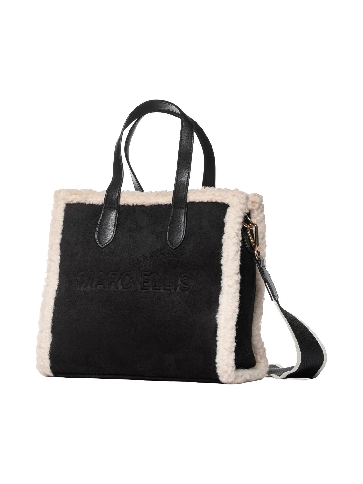 Borsa di medie dimensioni Marc Ellis realizzata in ecosuede con profili in ecopelliccia, chiusura tramite zip superiore, manici piatti, tracolla in tessuto logato removibile e logo tono su tono frontale.