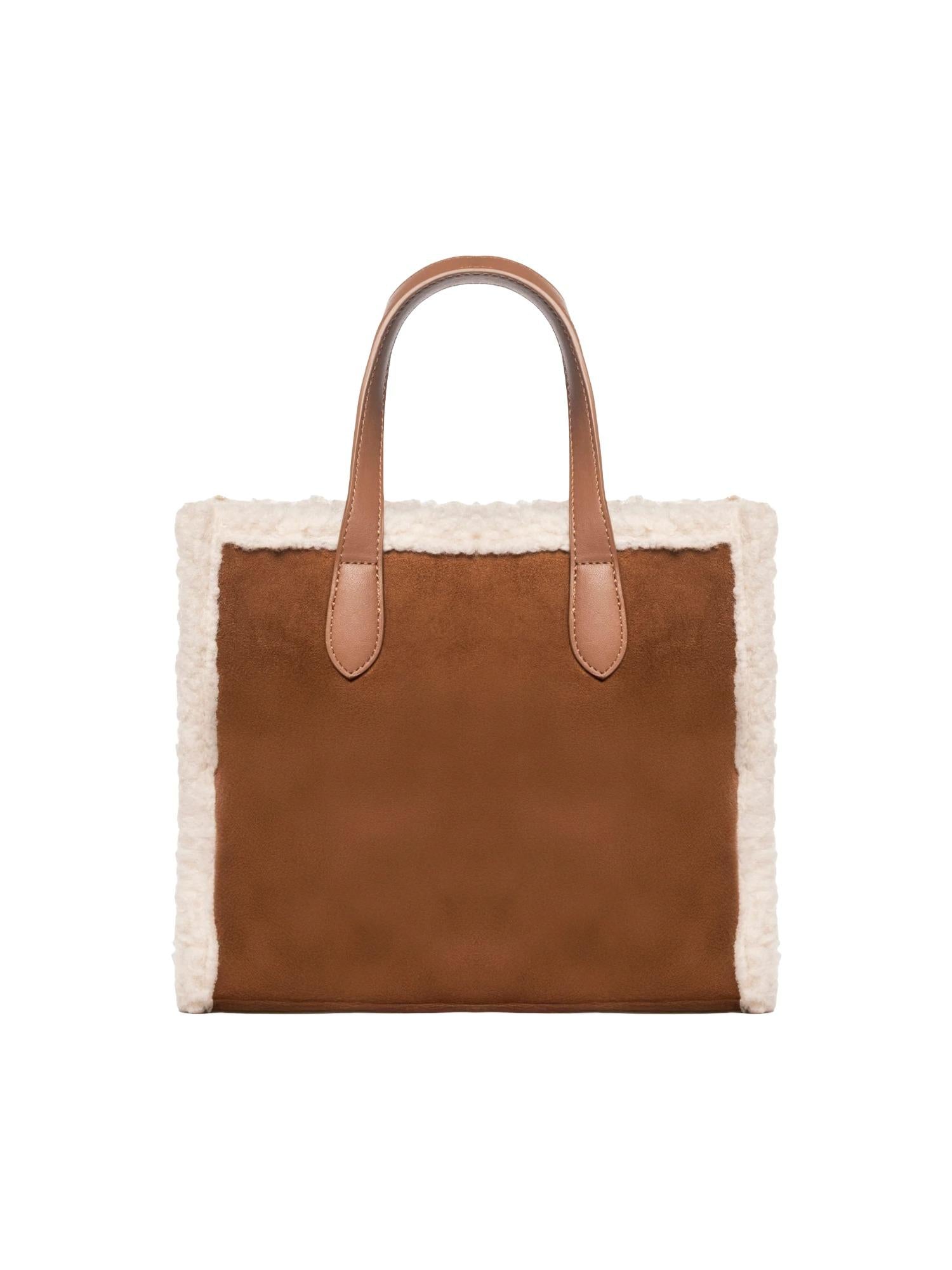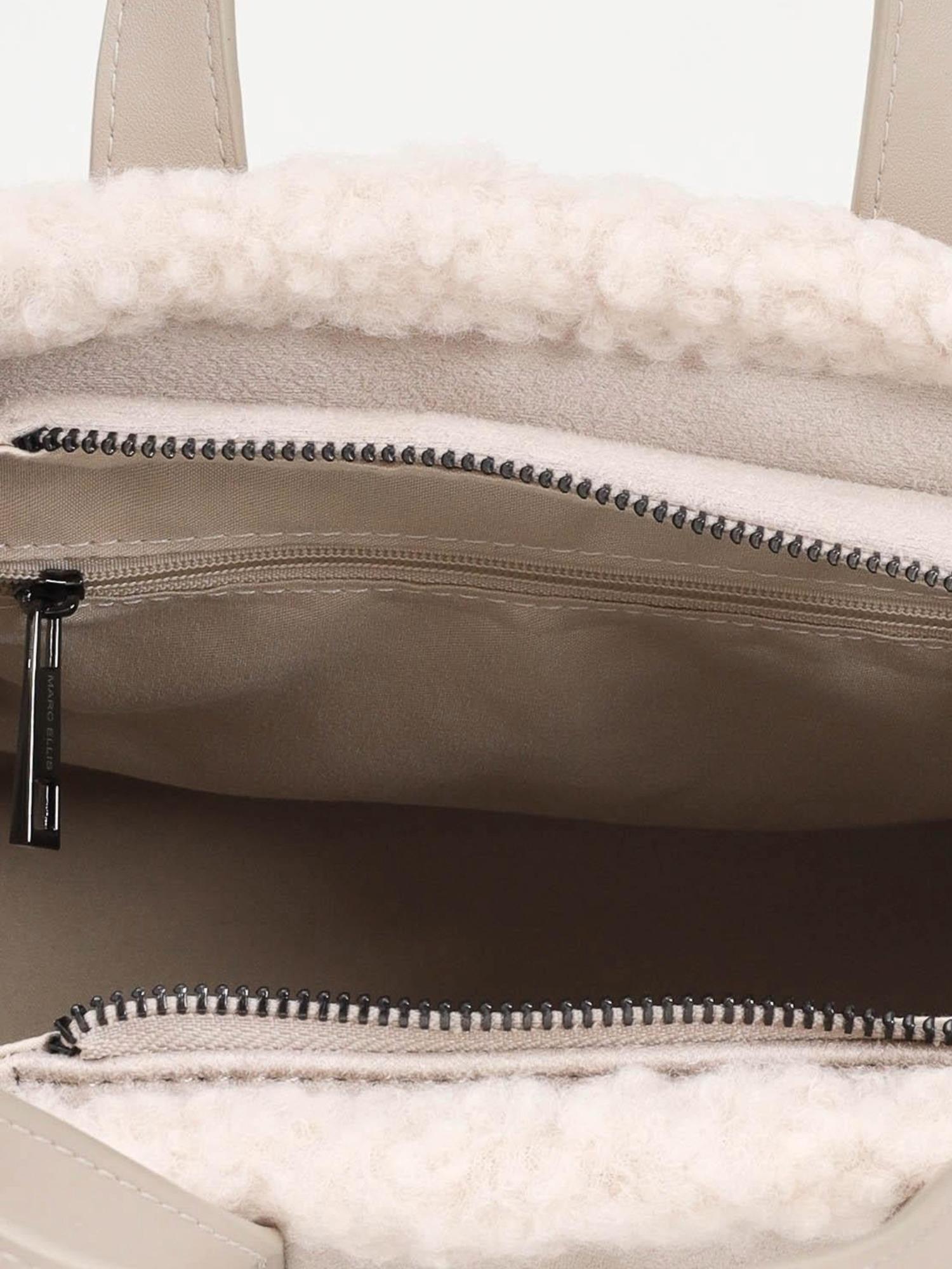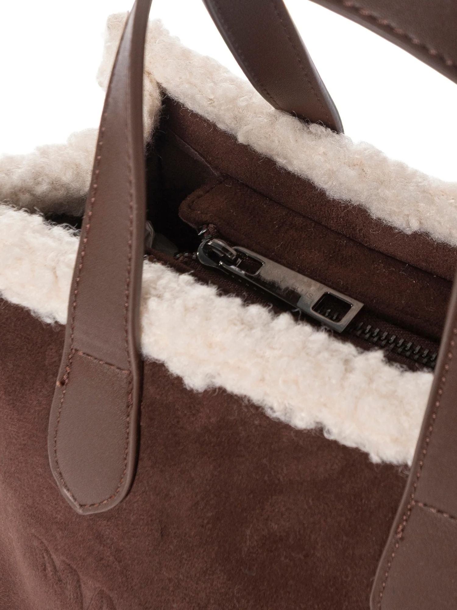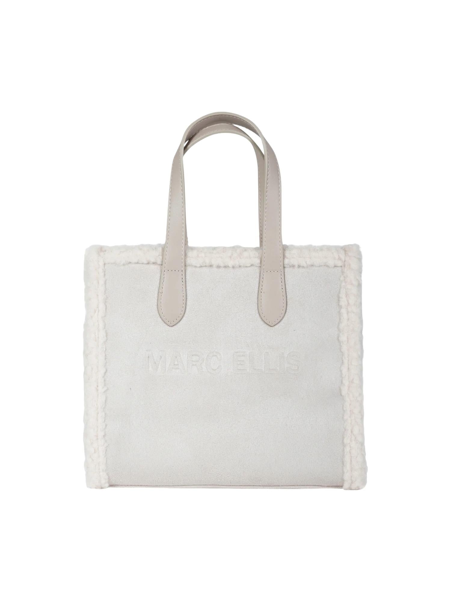 Borsa di medie dimensioni Marc Ellis realizzata in ecosuede con profili in ecopelliccia, chiusura tramite zip superiore, manici piatti, tracolla in tessuto logato removibile e logo tono su tono frontale.