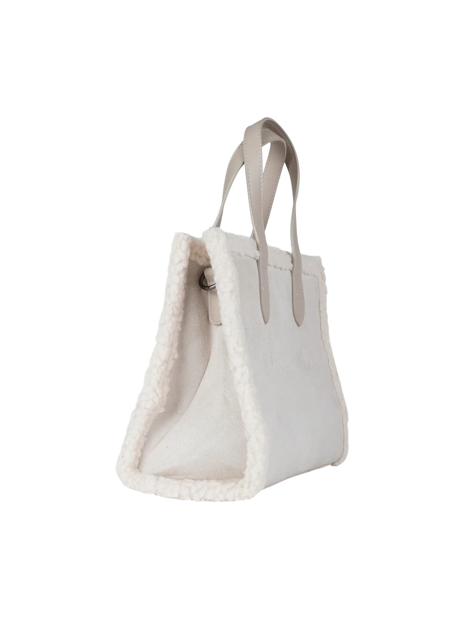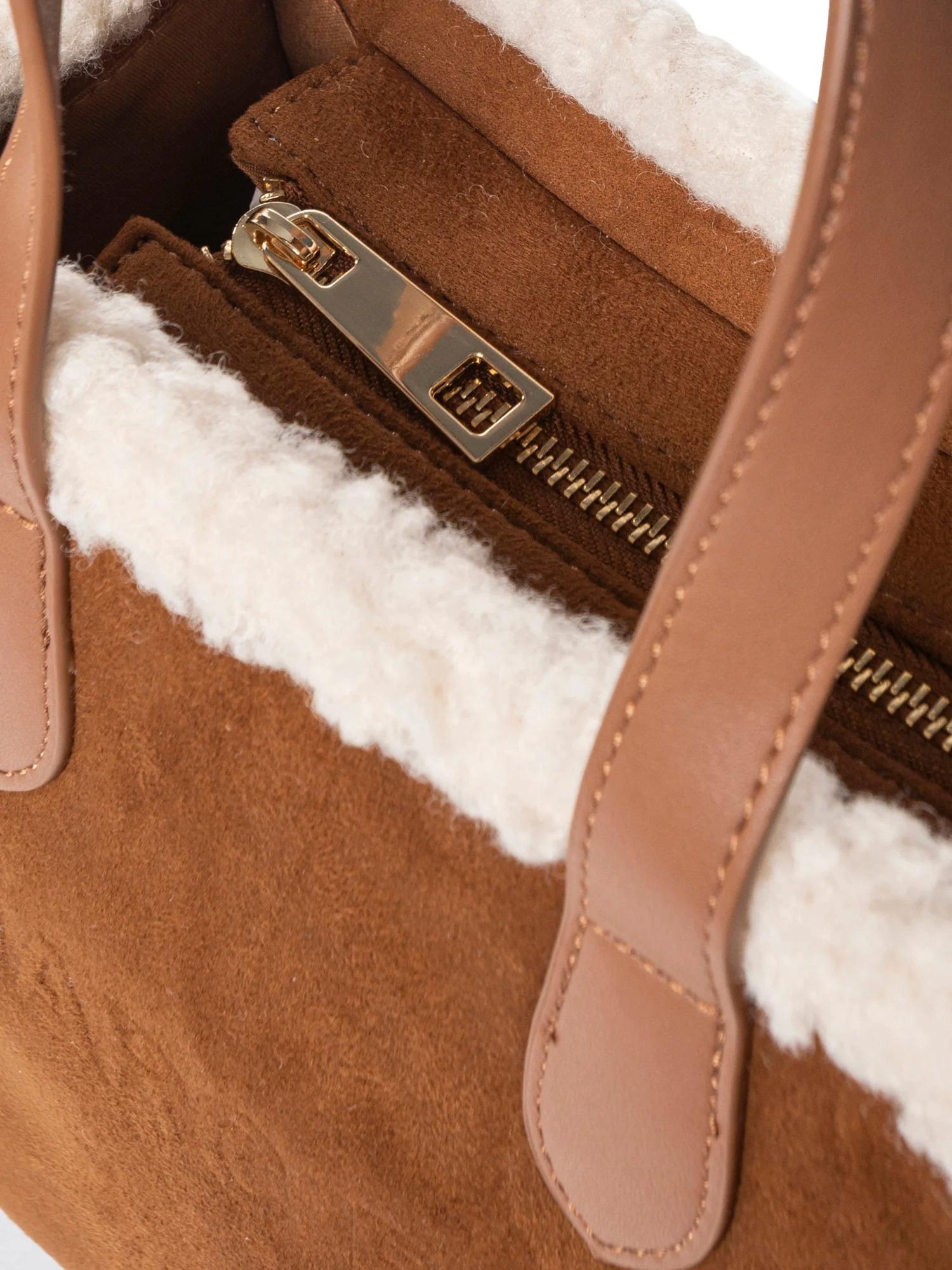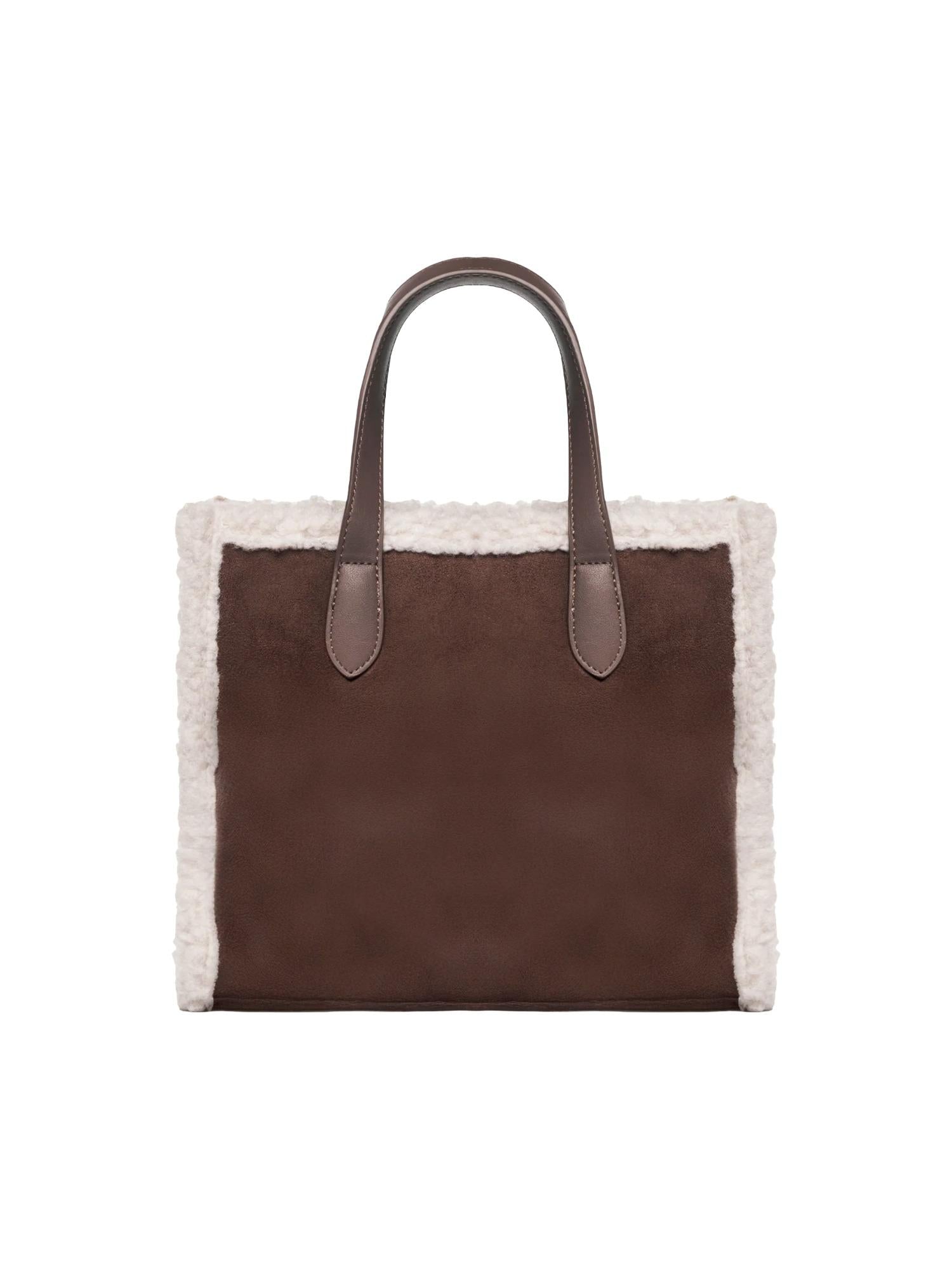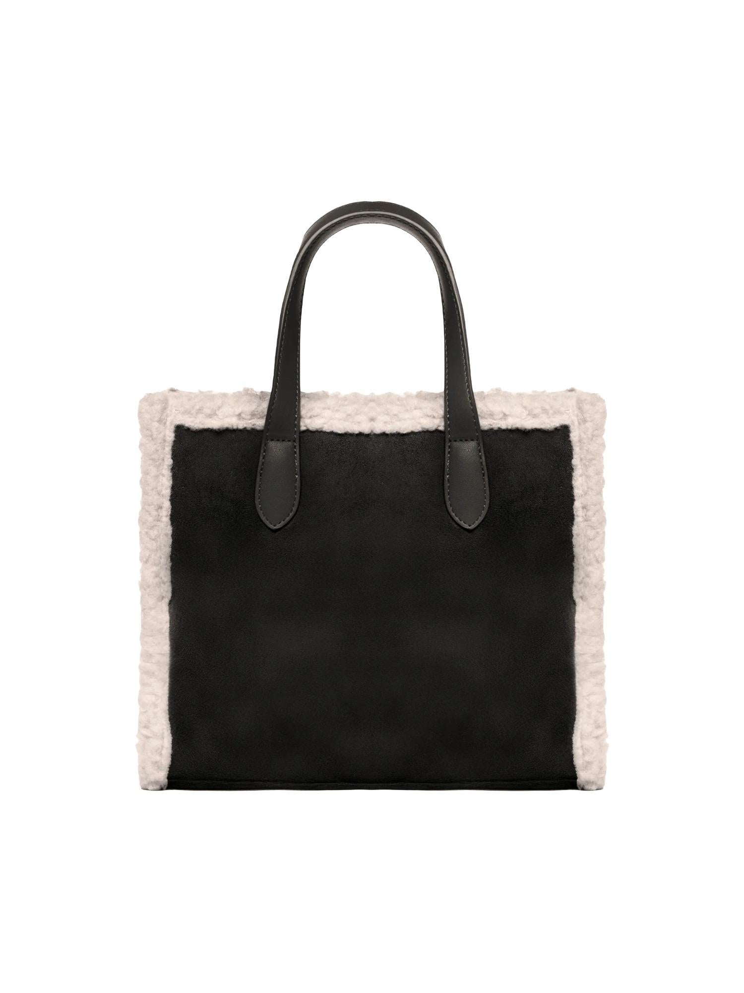 Borsa di medie dimensioni Marc Ellis realizzata in ecosuede con profili in ecopelliccia, chiusura tramite zip superiore, manici piatti, tracolla in tessuto logato removibile e logo tono su tono frontale.