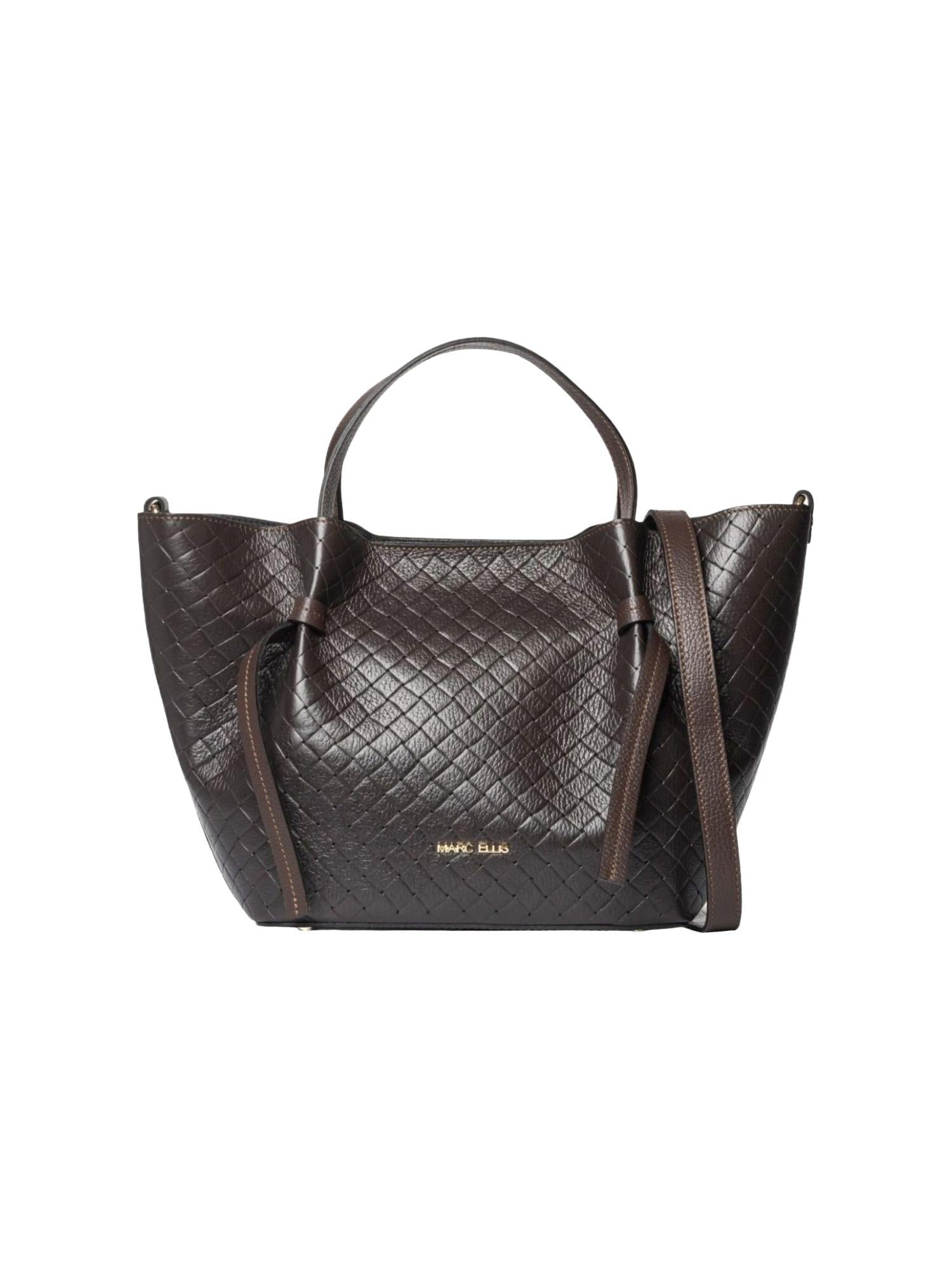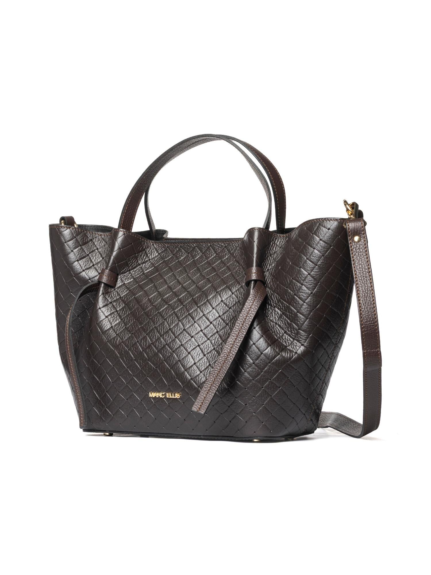 Borsa Marc Ellis realizzata in vera pelle intrecciata con chiusura superiore, manici piatti, tracolla removibile e placca logo frontale.
