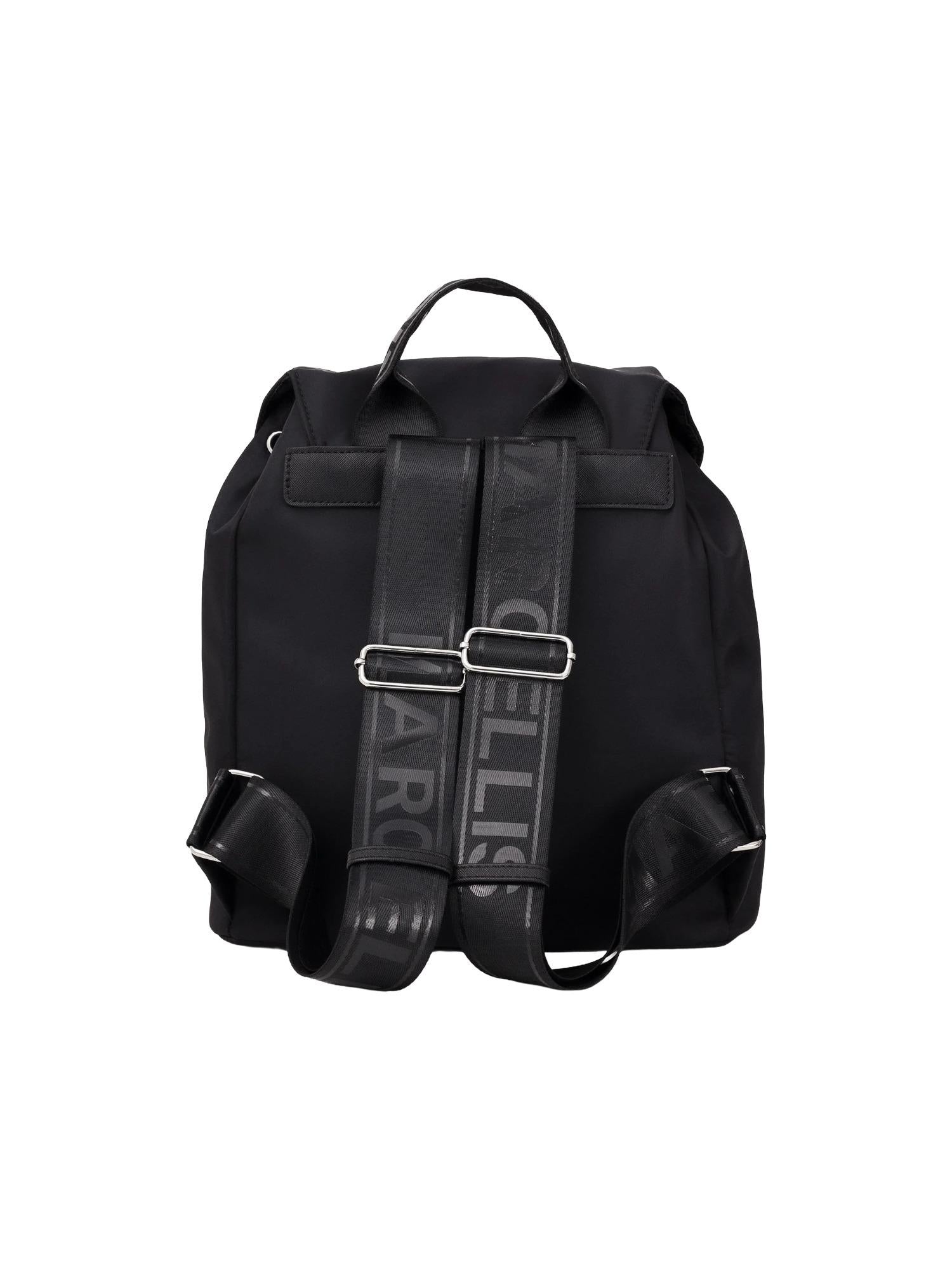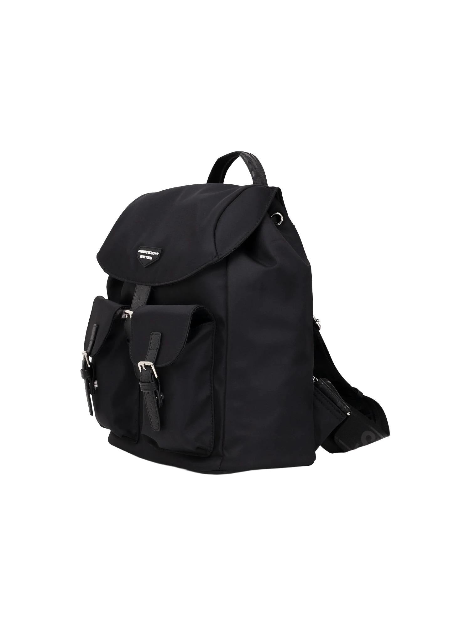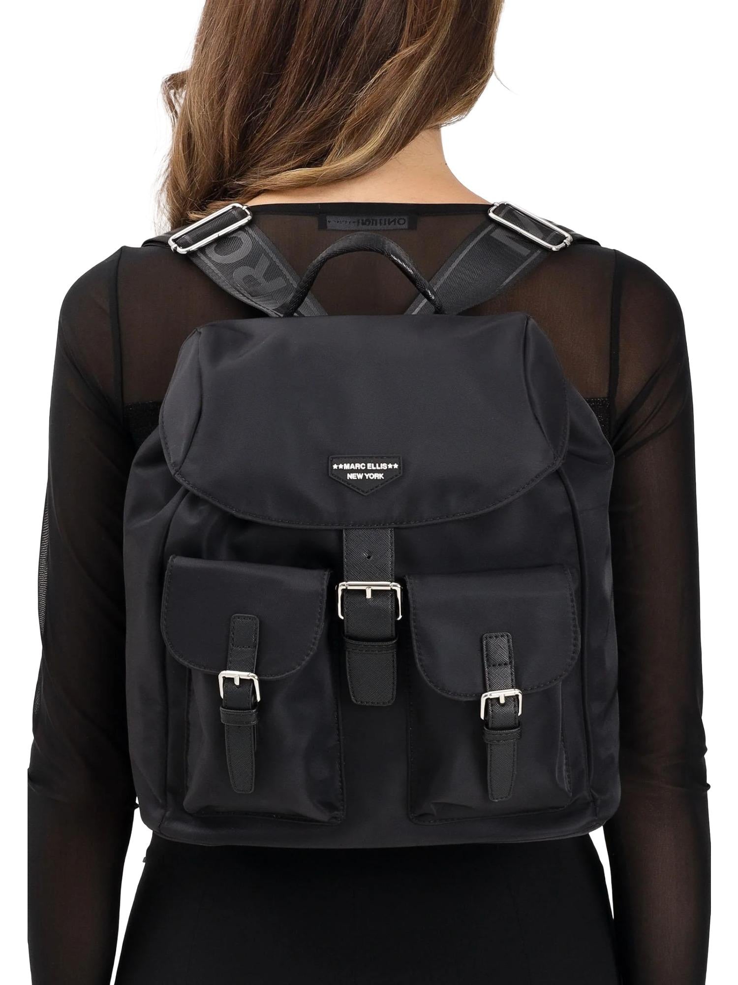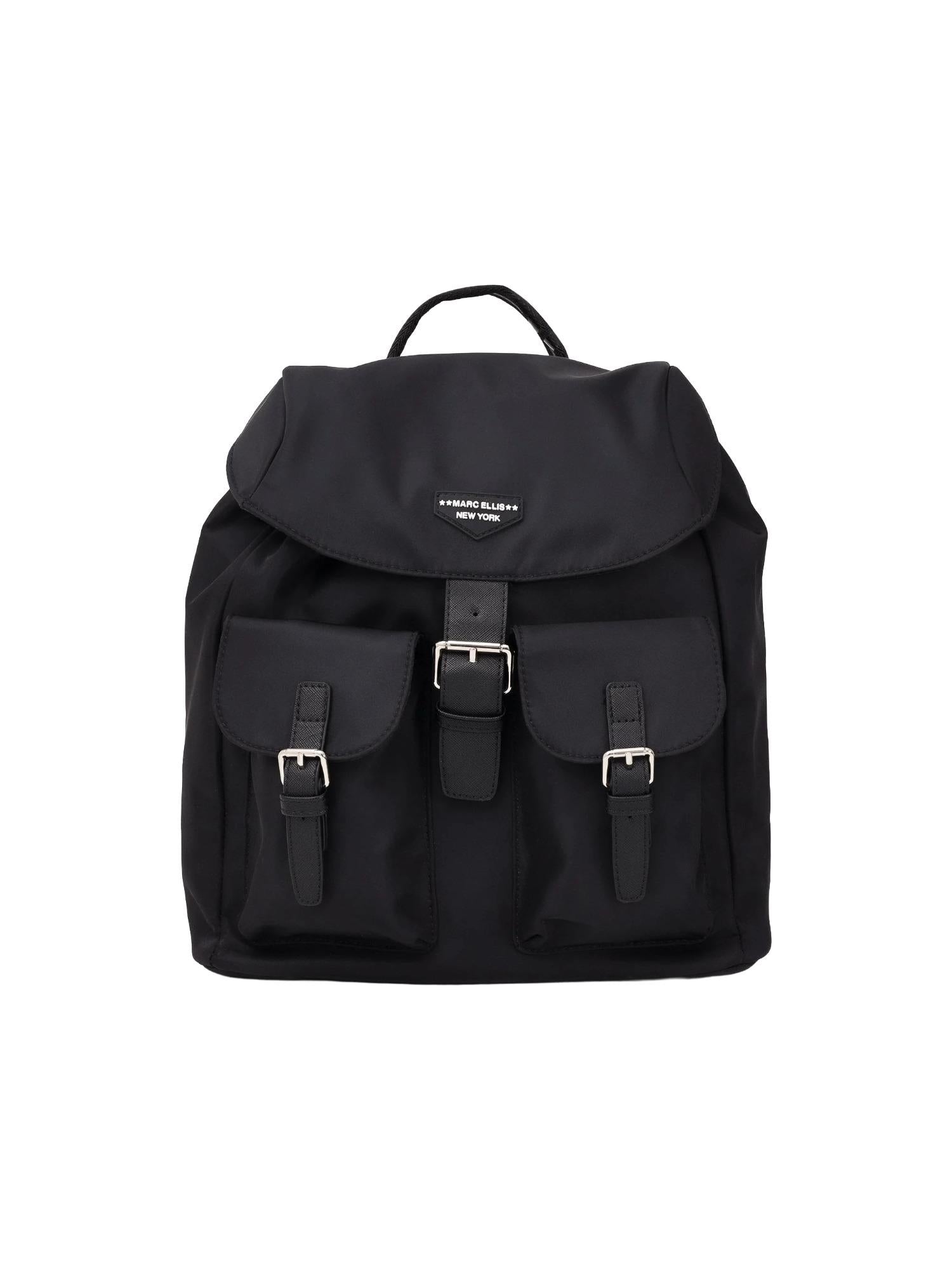 Zaino Marc Ellis realizzato in tessuto tecnico con chiusura tramite patta e fibbia, manico piatto, spallacci regolabili logati e tasche frontali con fibbie.