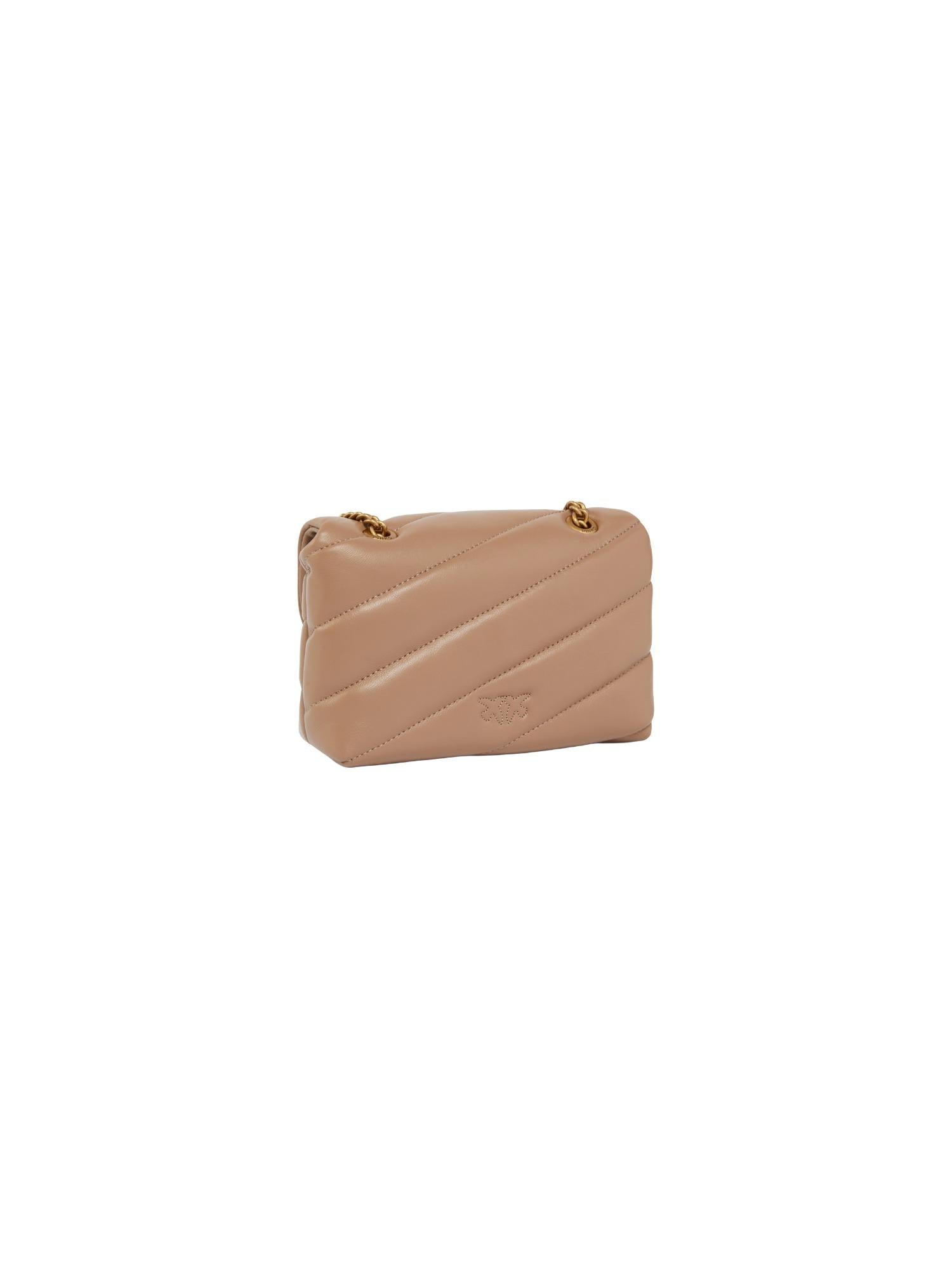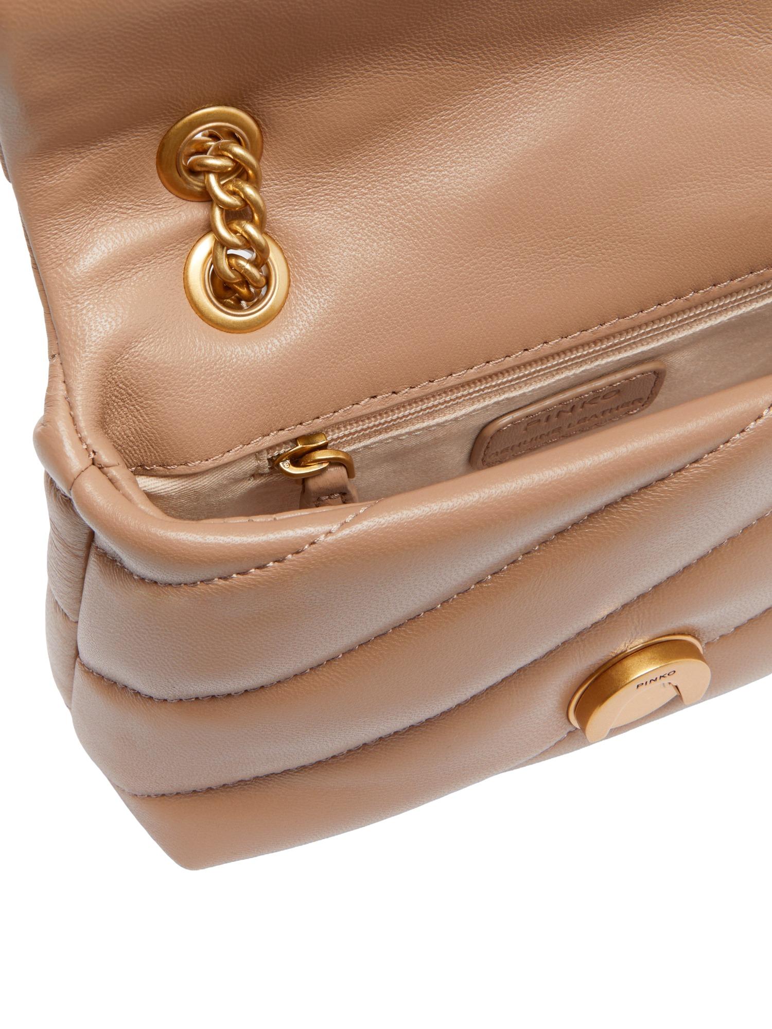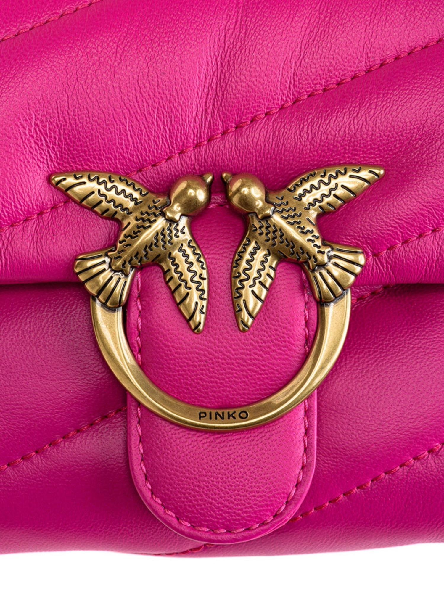 Borsa Puff di piccole dimensioni Pinko realizzata in vera pelle con chiusura tramite fibbia Love Birds, unico scomparto interno, tracolla in catena con spallaccio e design trapuntato.