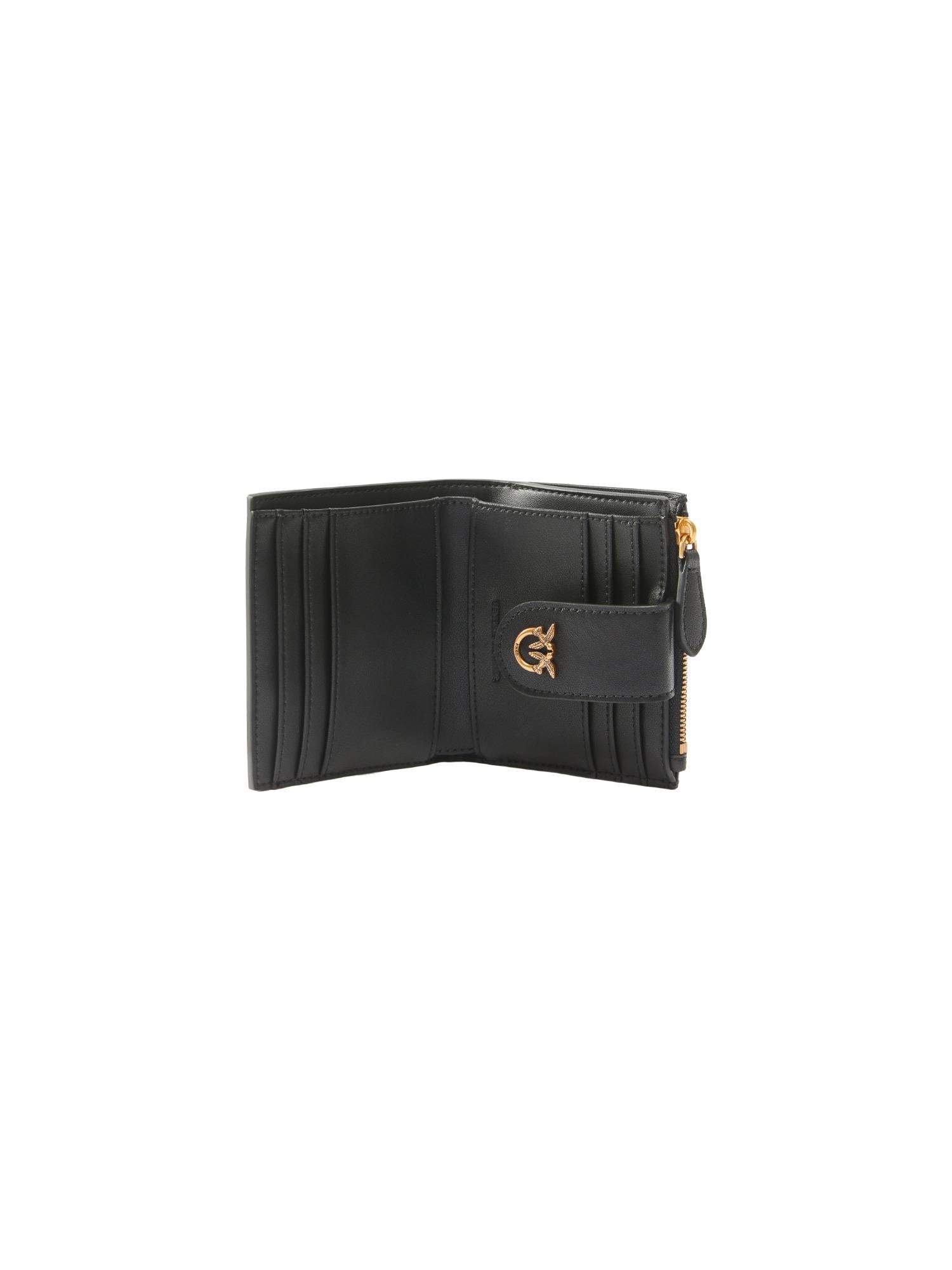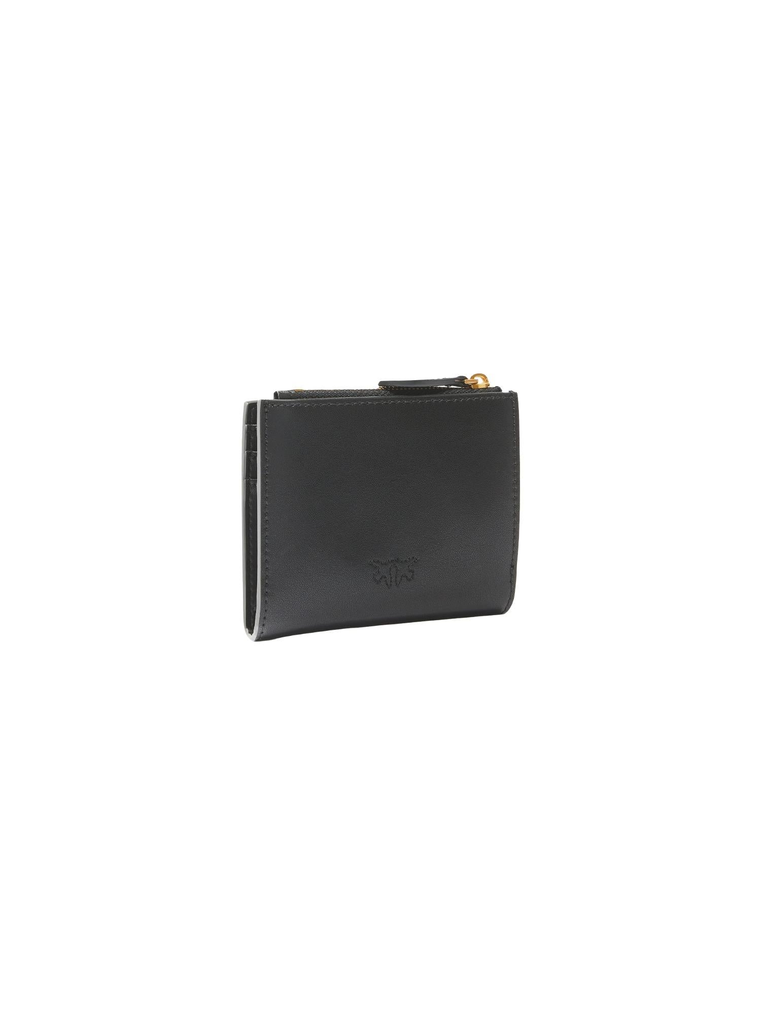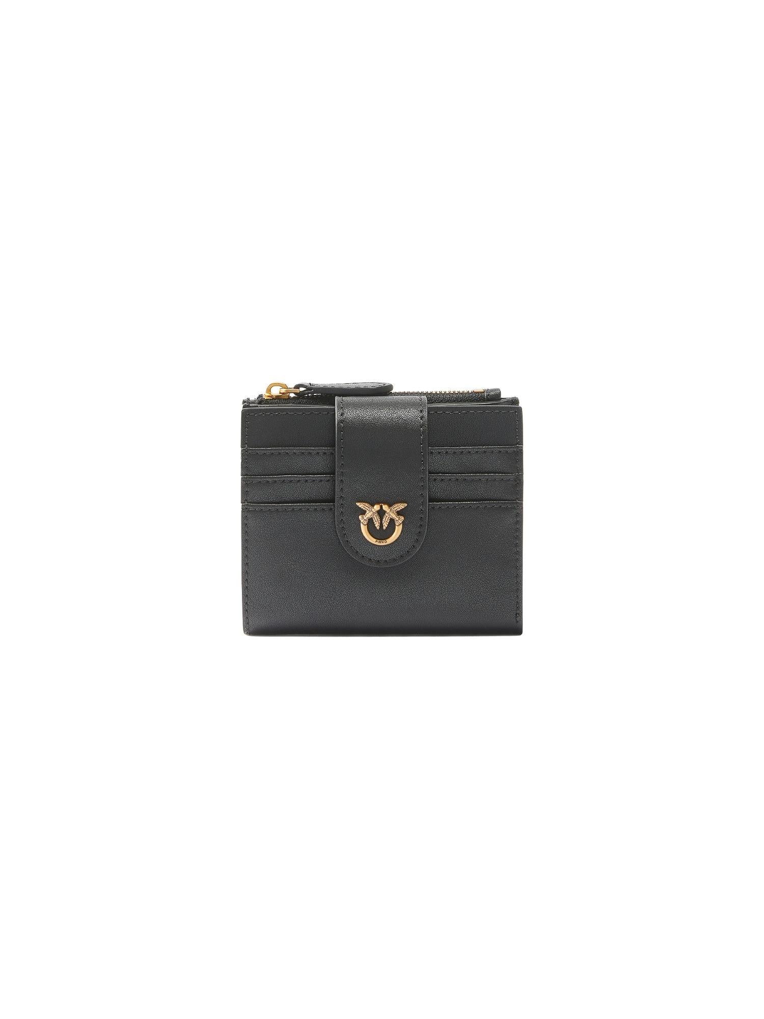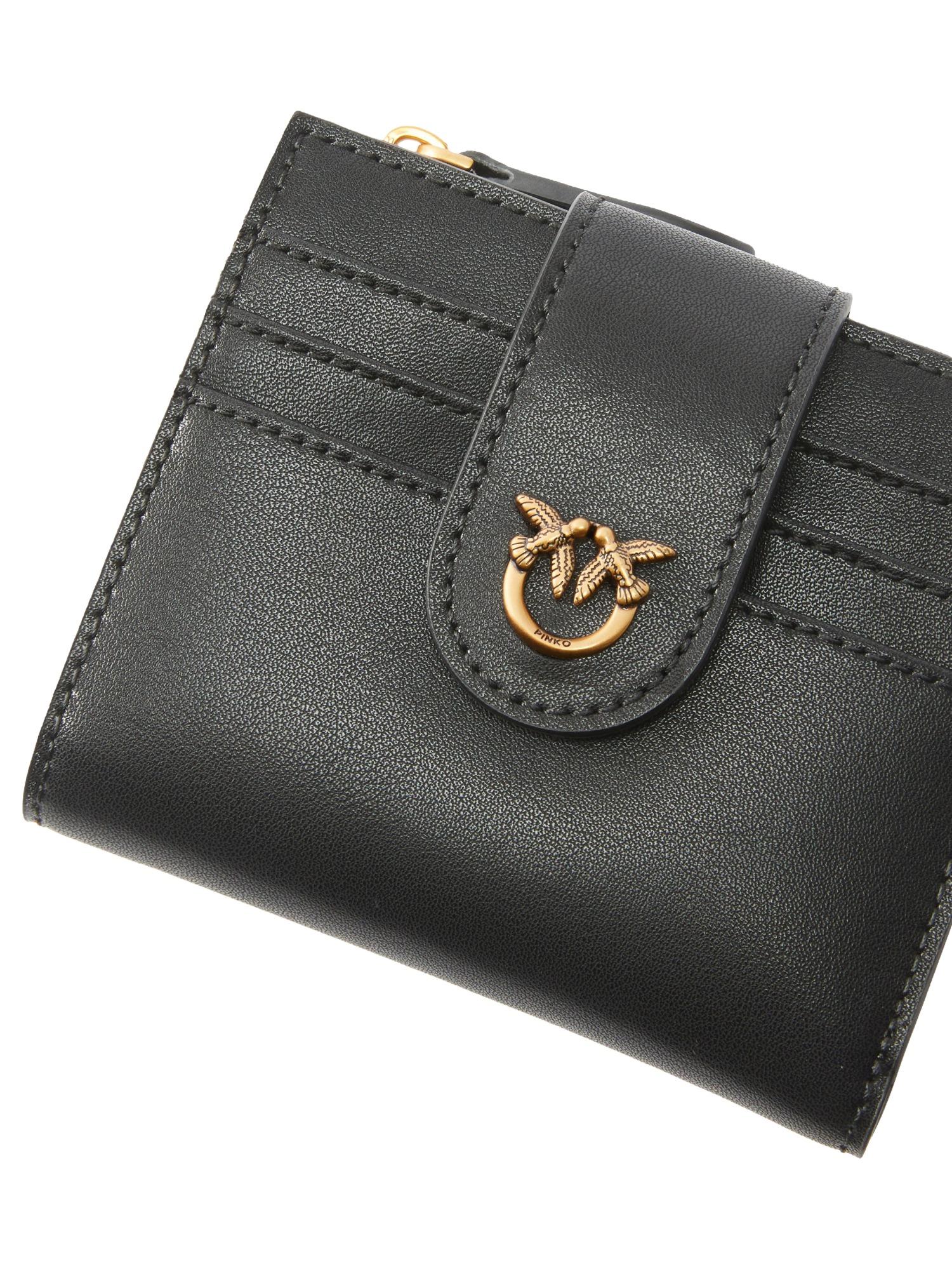 Portafoglio di piccole dimensioni Pinko realizzato in pelle di vitello con chiusura tramite bottone con logo Love Birds, taschino portamonete con zip e vari scomparti portacarte.