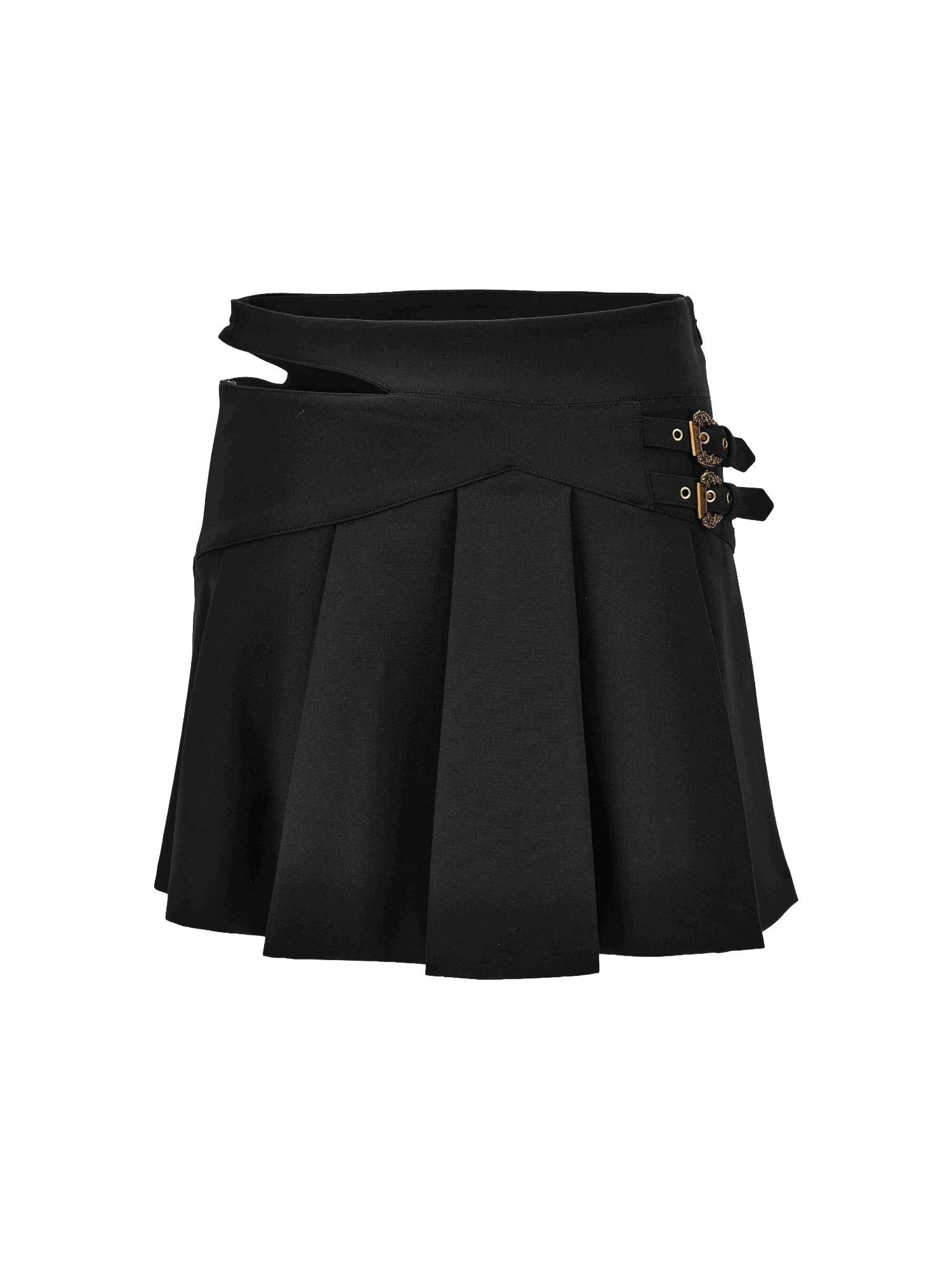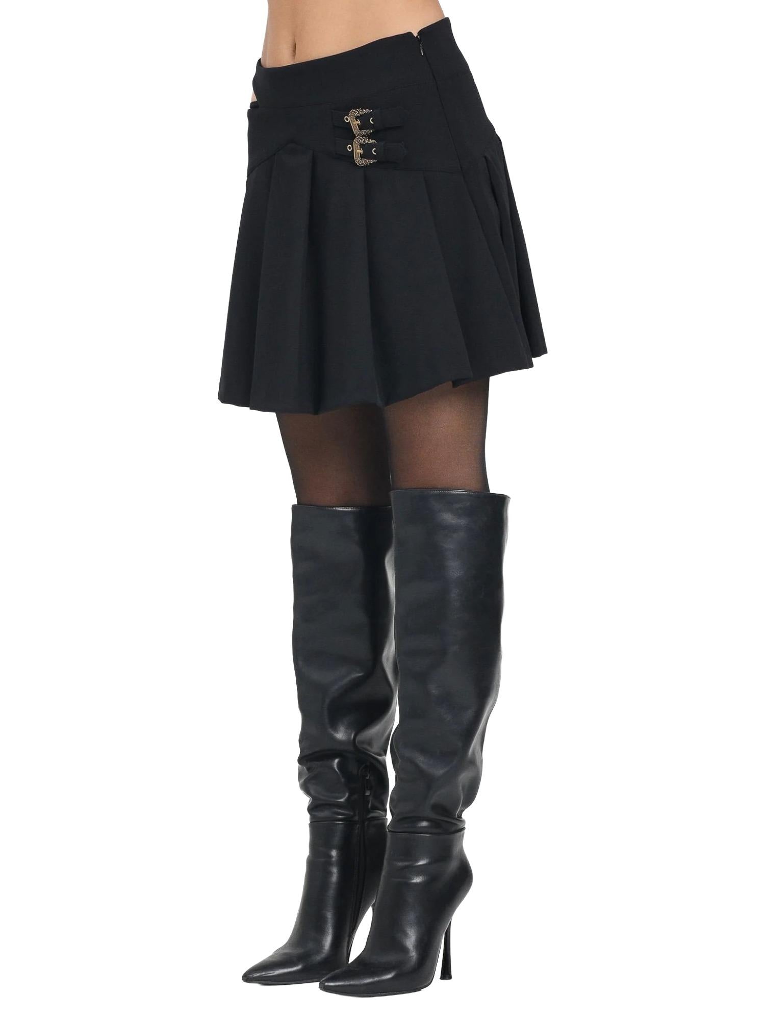 Gonna corta Versace Jeans Couture realizzata in misto viscosa con chiusura tramite zip laterale, design a pieghe, dettaglio cut-out e fibbie Baroque.