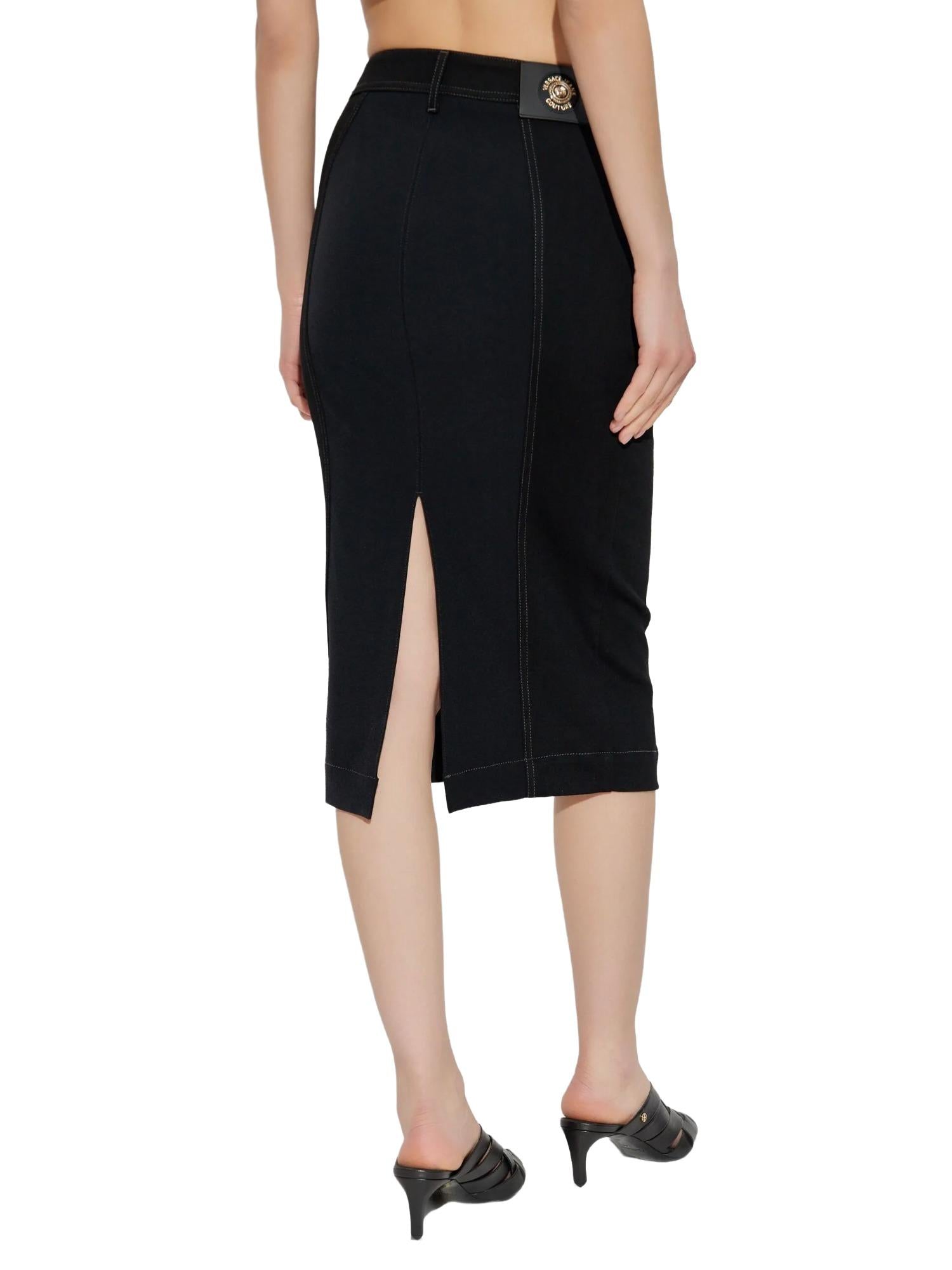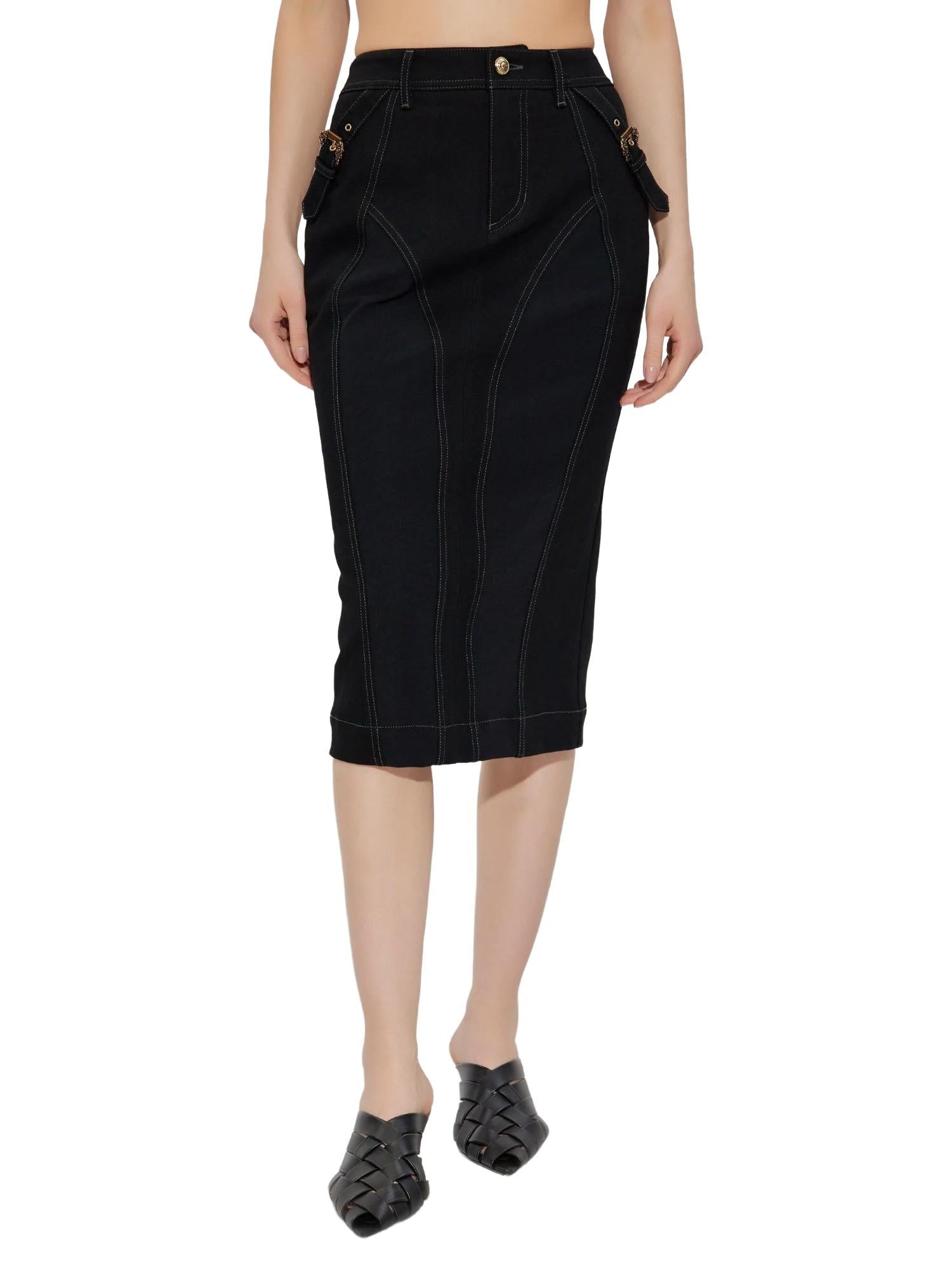 Gonna midi Versace Jeans Couture realizzata in denim elasticizzato con chiusura tramite zip e bottone, tasche con fibbie Baroque e spacco sul retro.