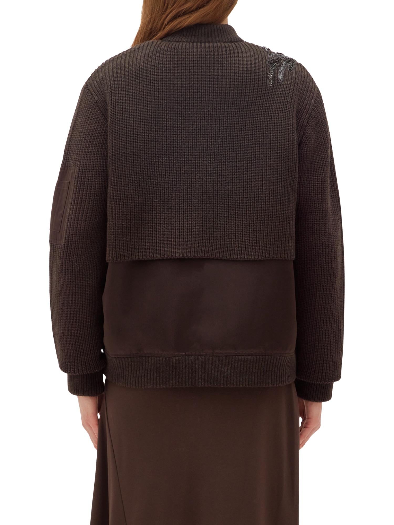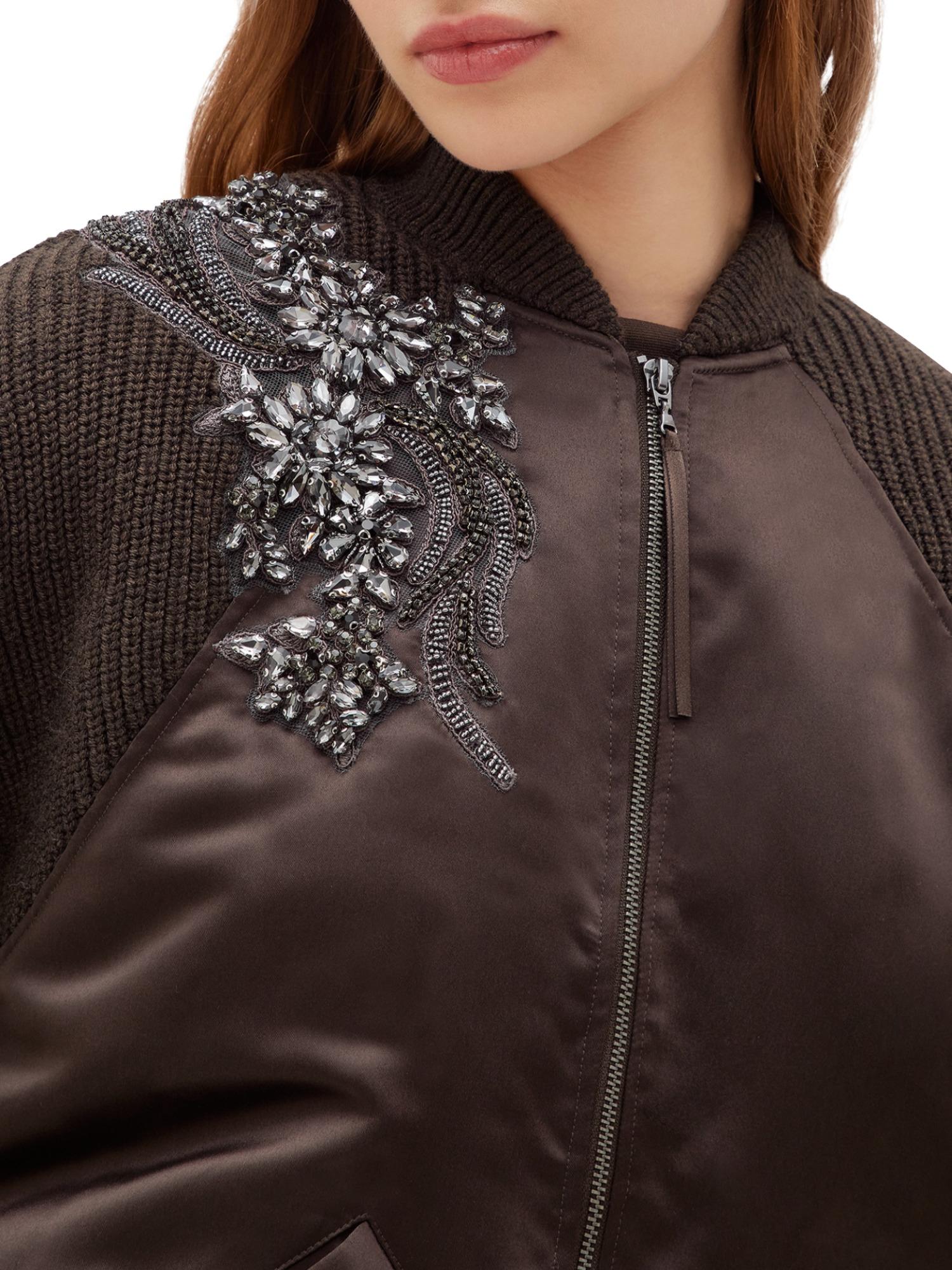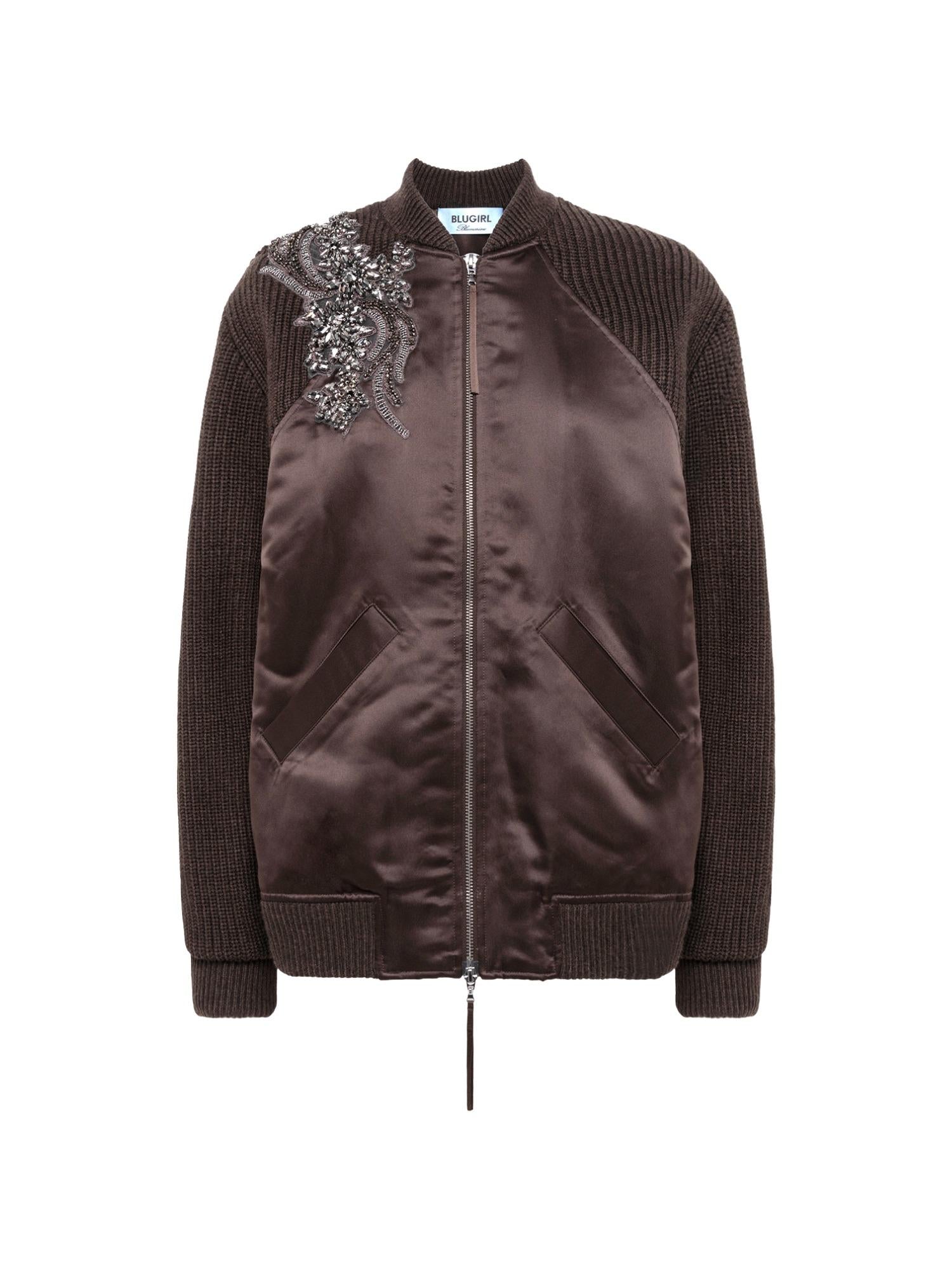 Bomber Blugirl realizzato in misto lana con parte frontale in duchesse, chiusura tramite zip a doppio cursore, tasche laterali e applicazione di cristalli sulla spalla.