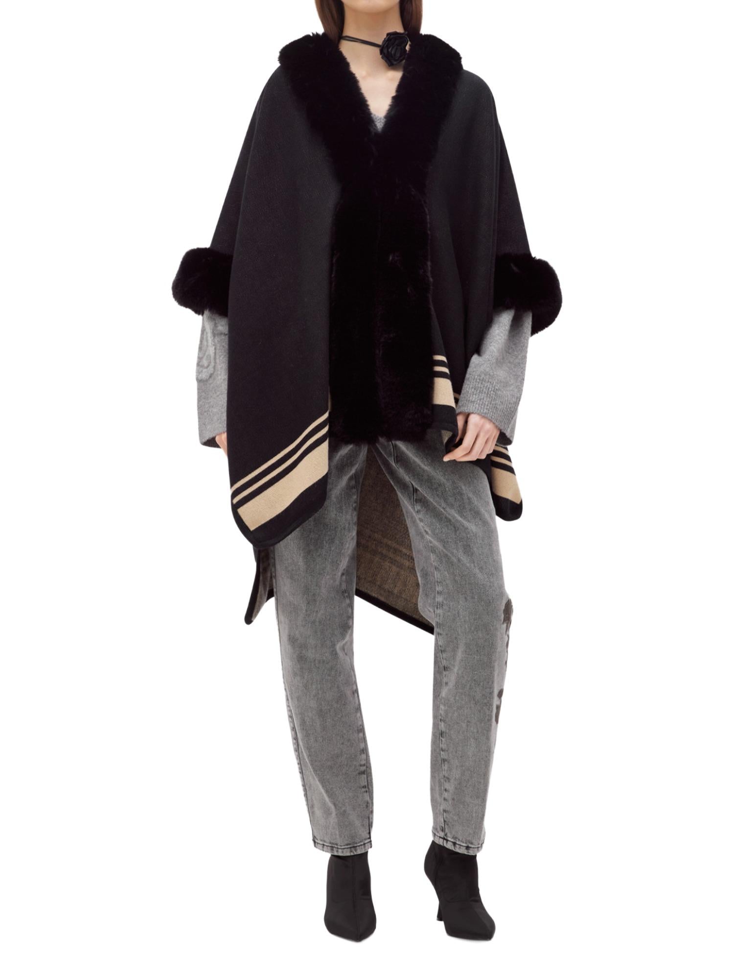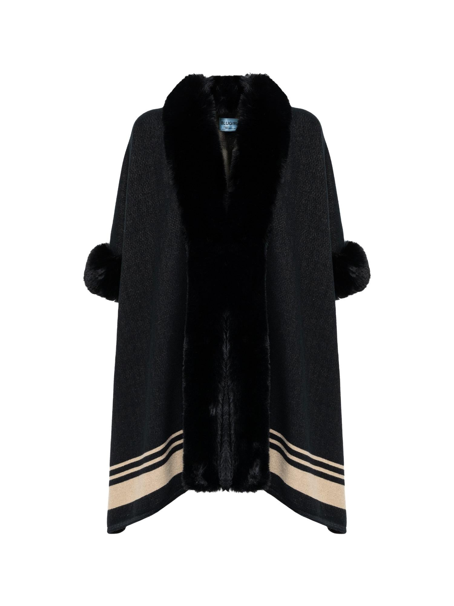 Cappa Blugirl realizzata in maglia con bande a contrasto ed ecopelliccia sui profili.