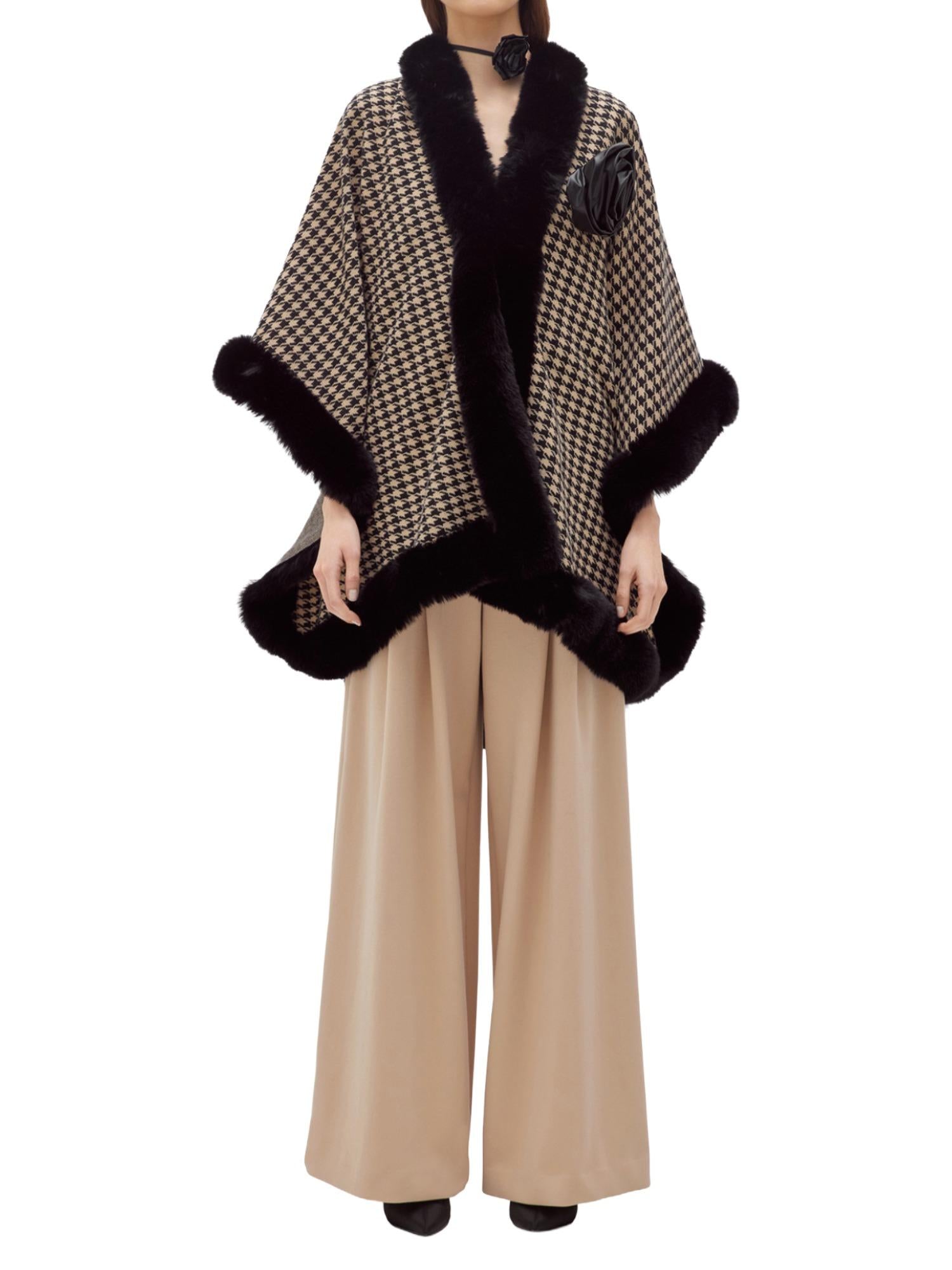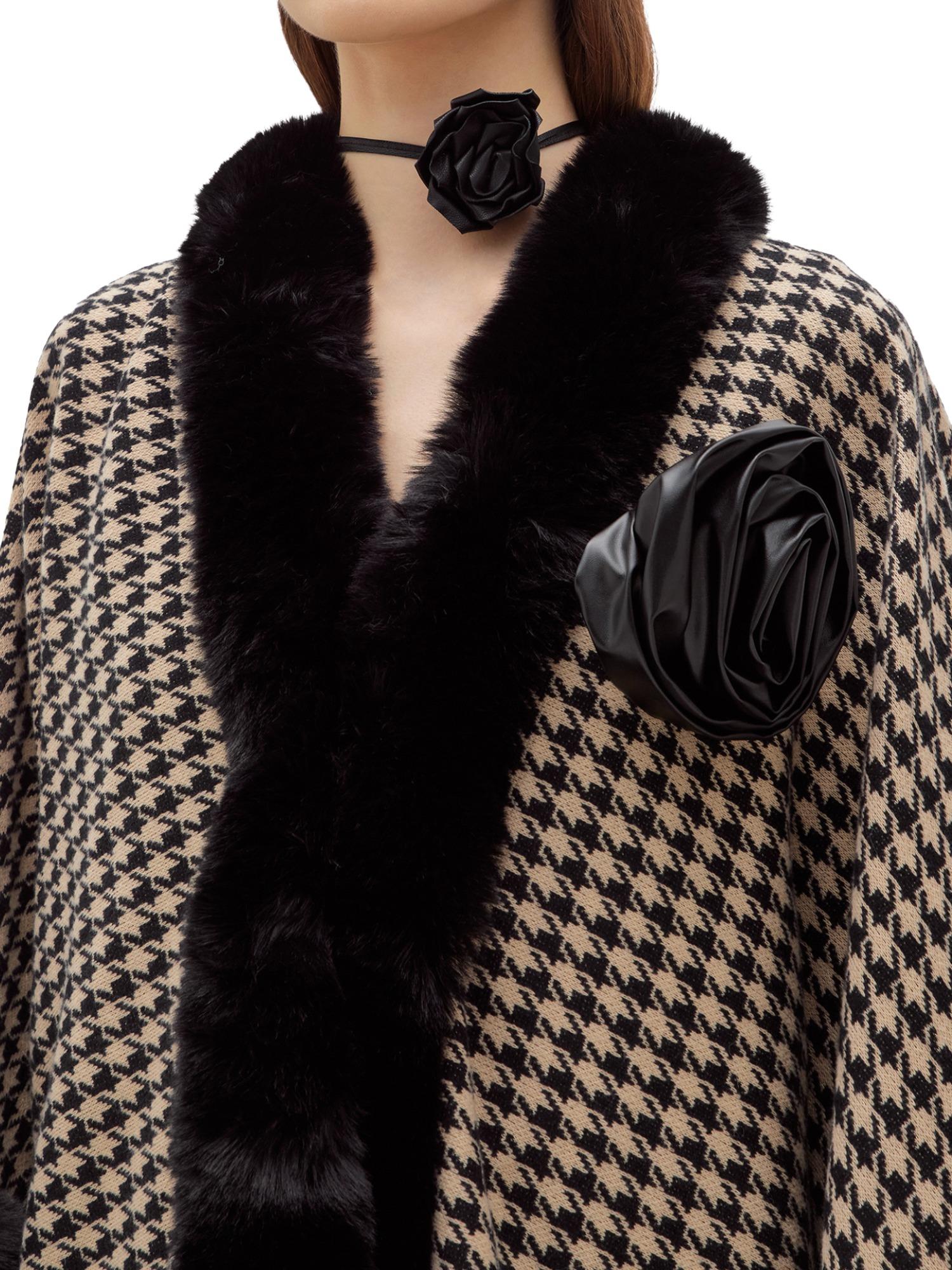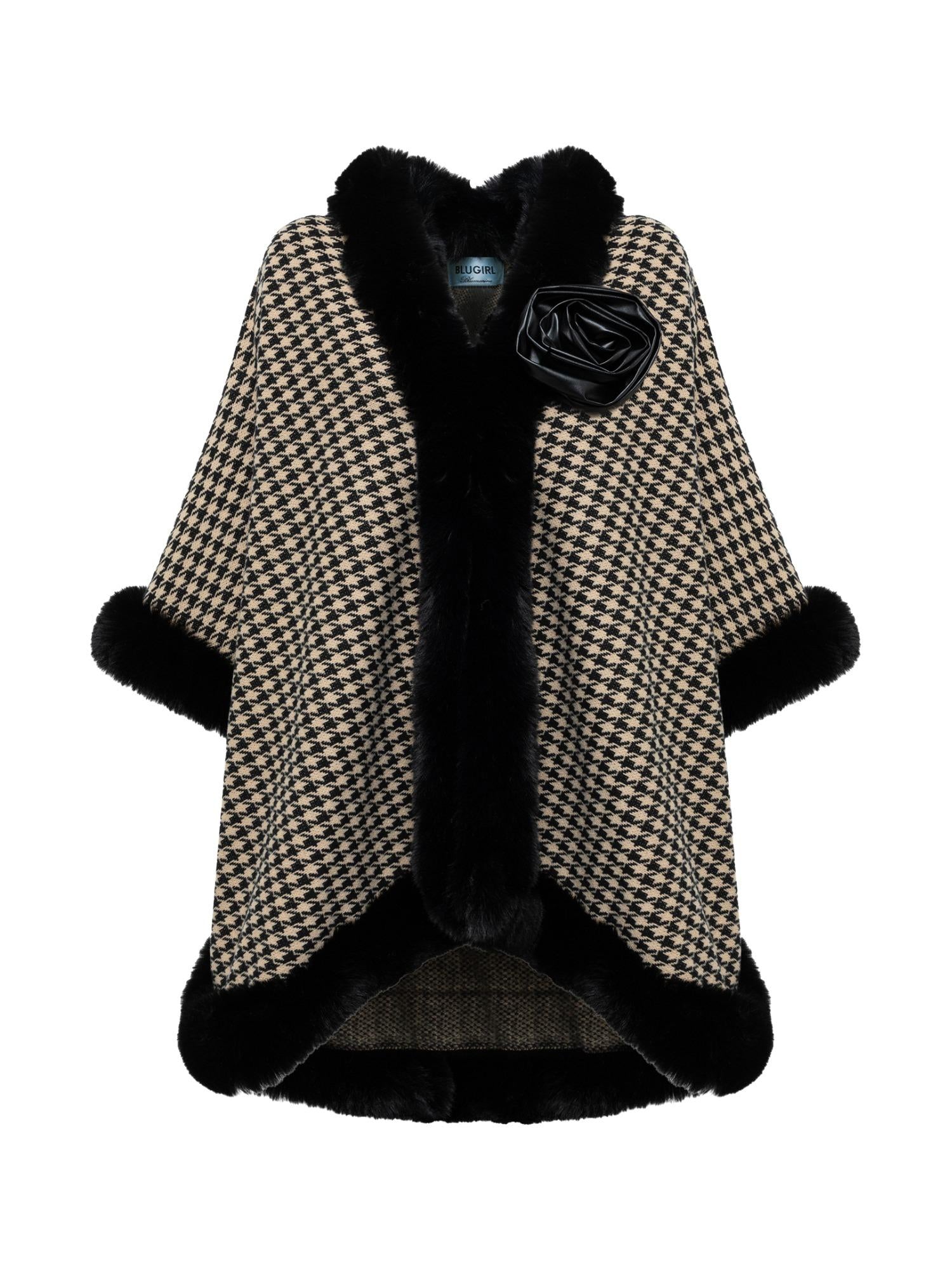 Cappa Blugirl realizzata in maglia pied de poule con profili in ecopelliccia e rosa applicata sul petto.