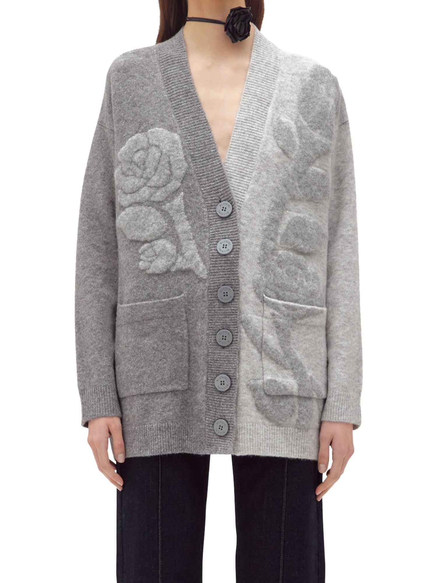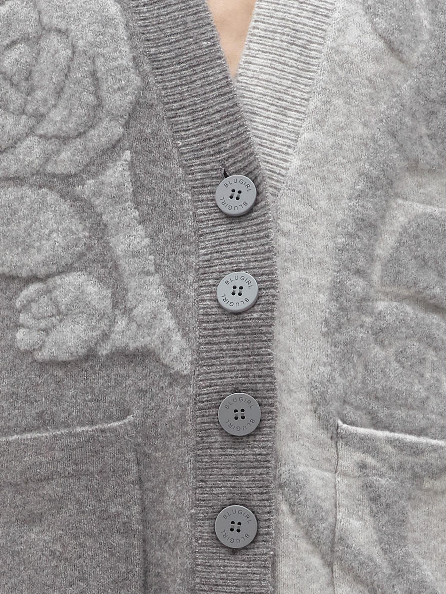 Cardigan Blugirl realizzato in misto lana con abbottonatura frontale, tasche a toppa e rose a intarsio a contrasto sul davanti.