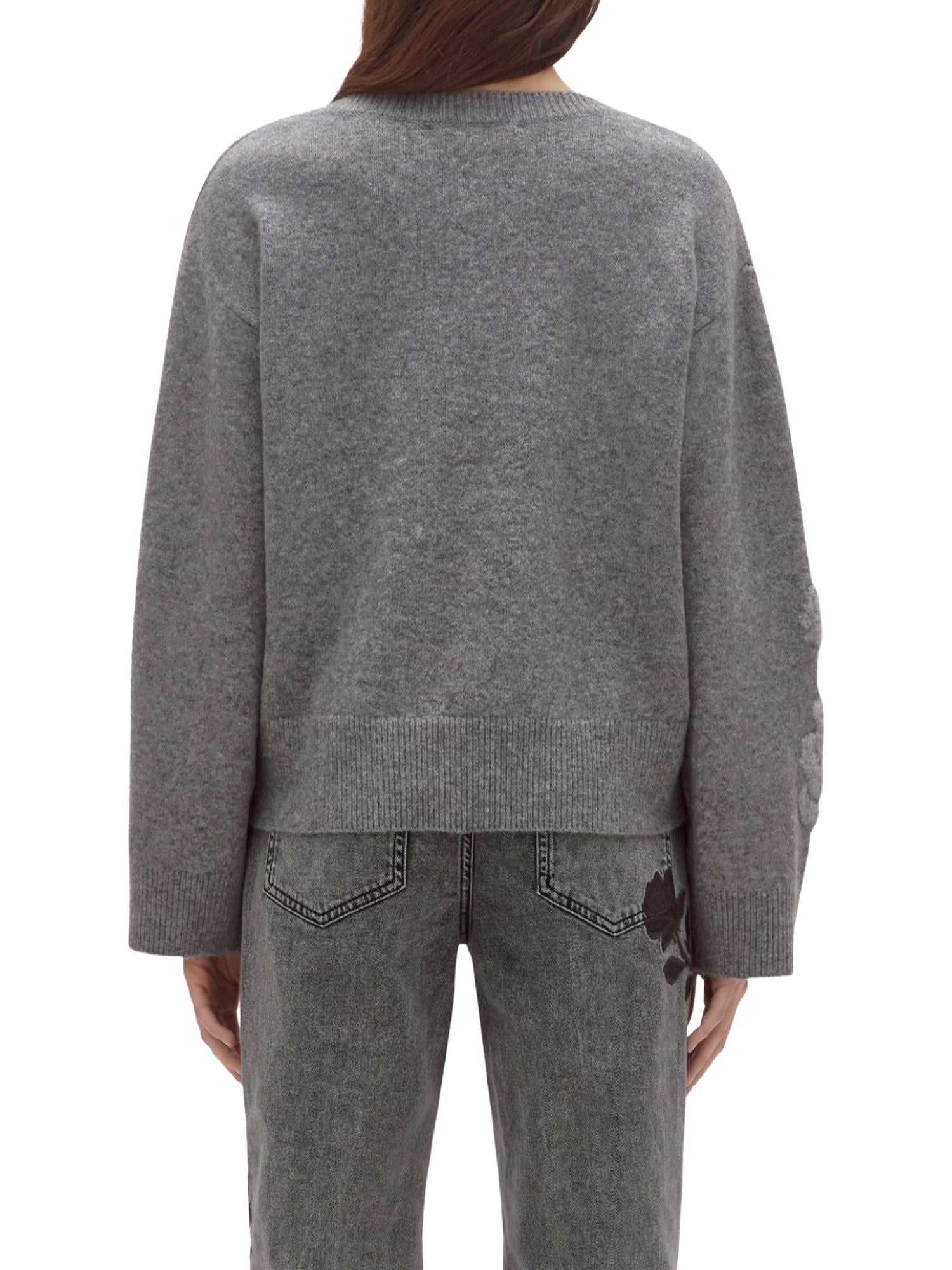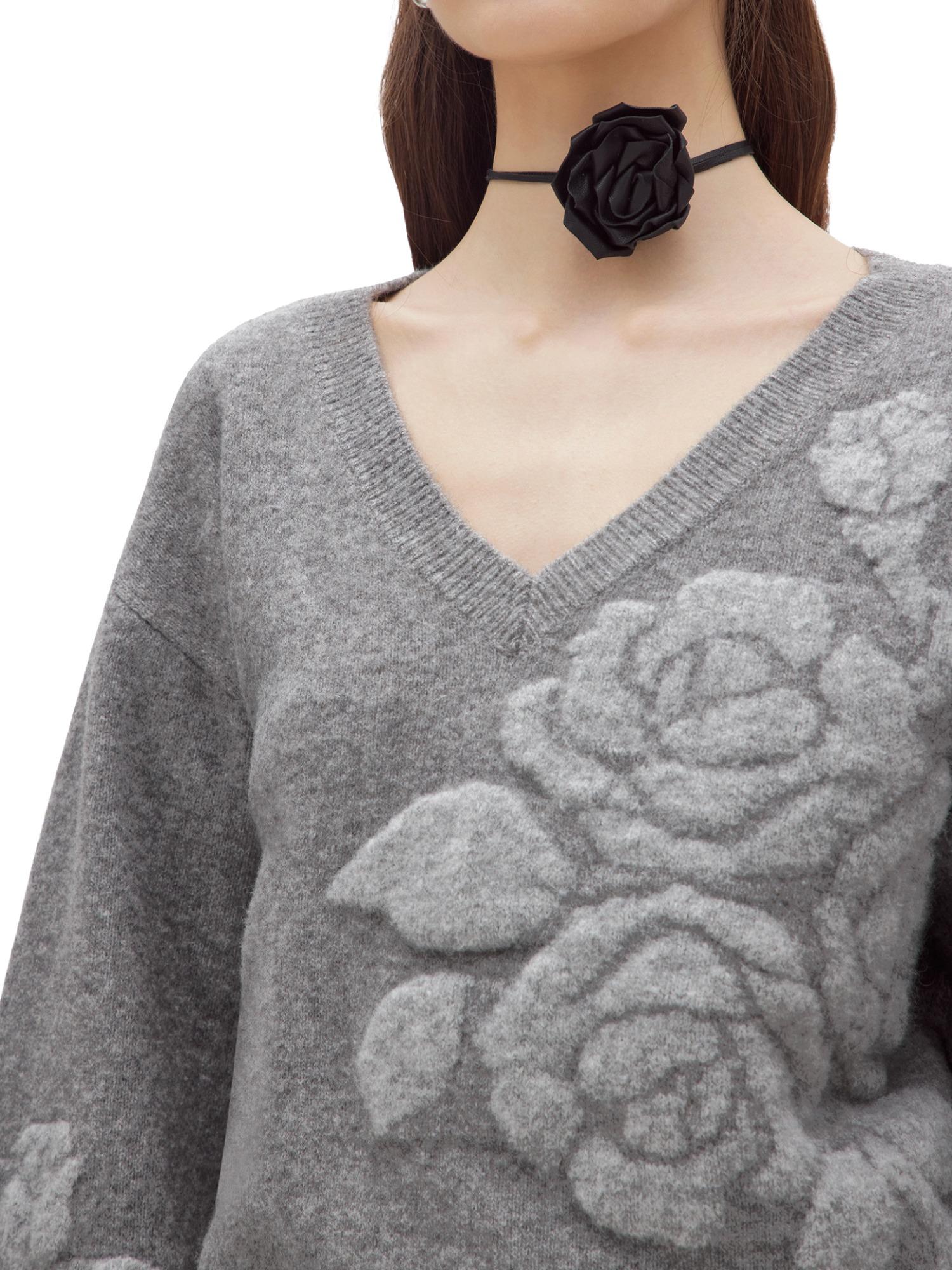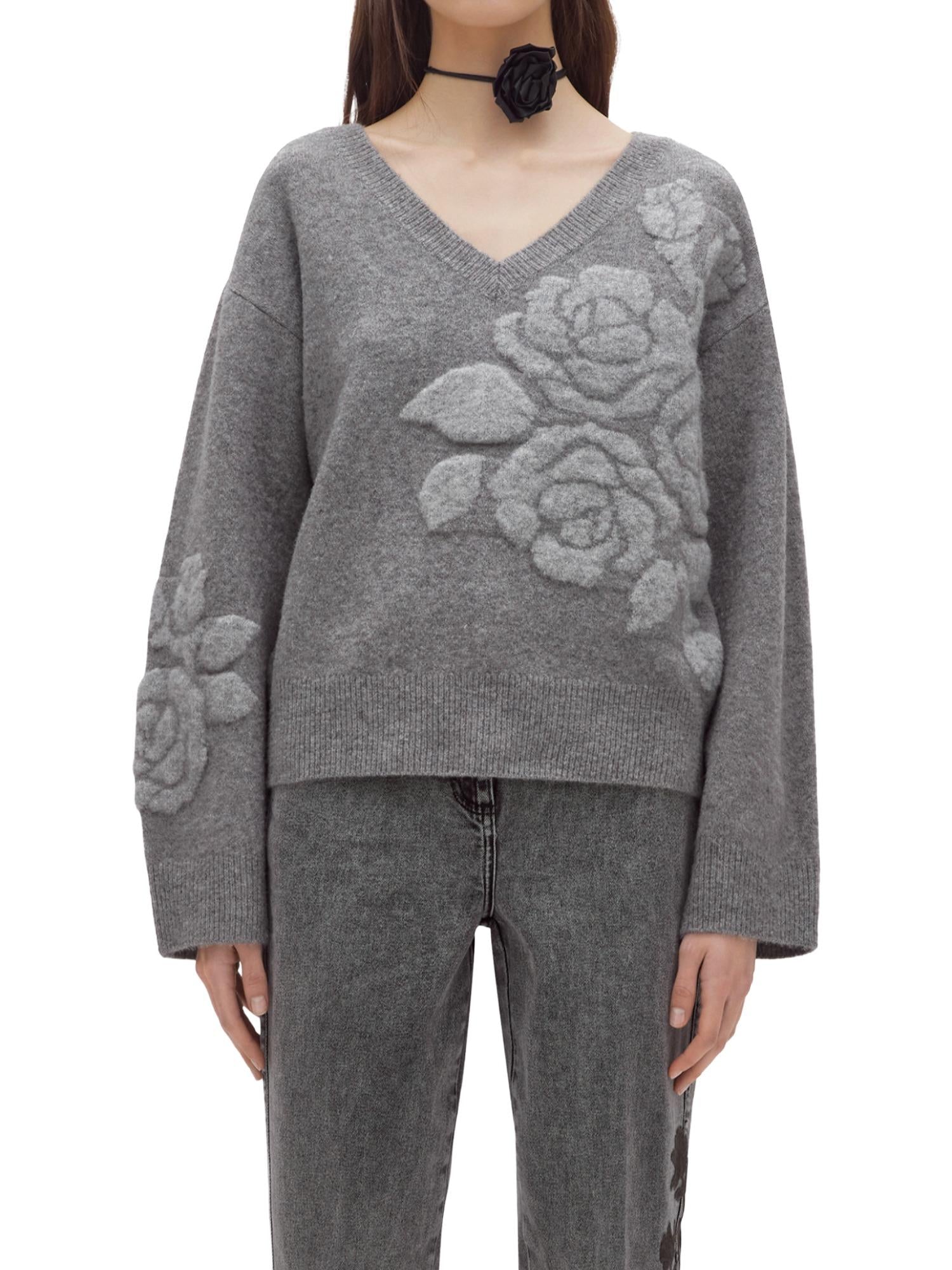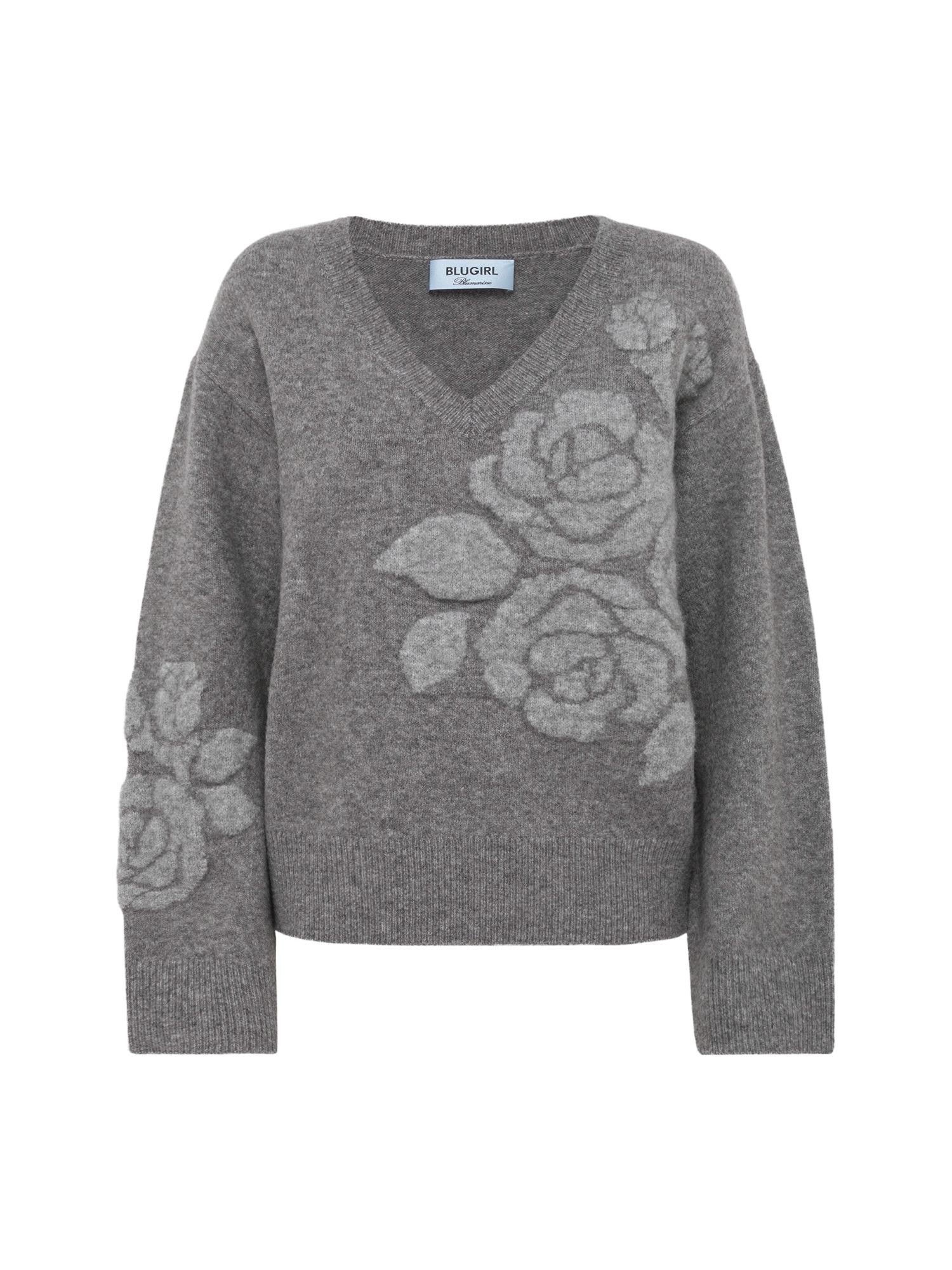 Maglia Blugirl realizzata in misto lana con scollo a V e rose a intarsio a contrasto sul davanti.