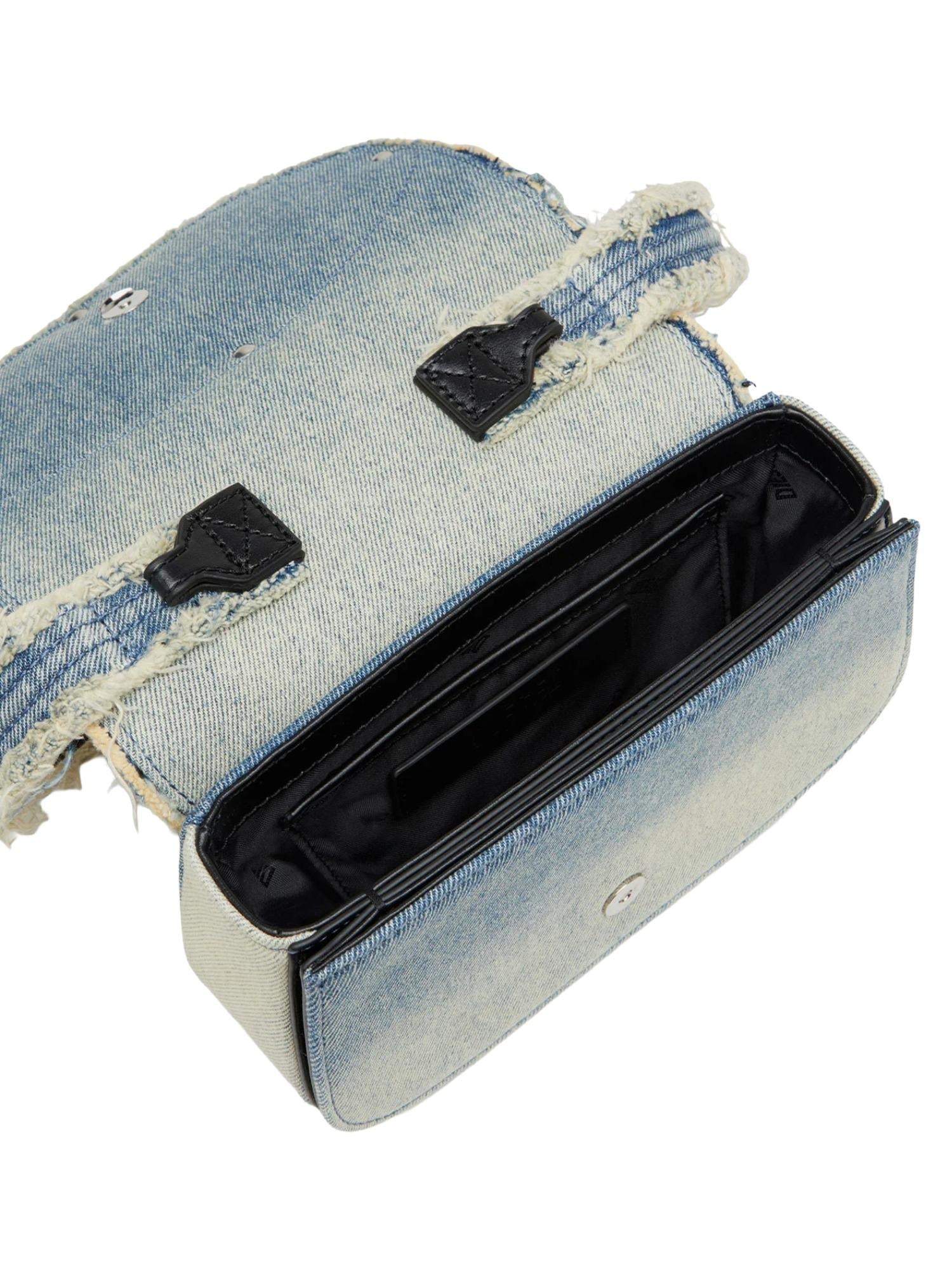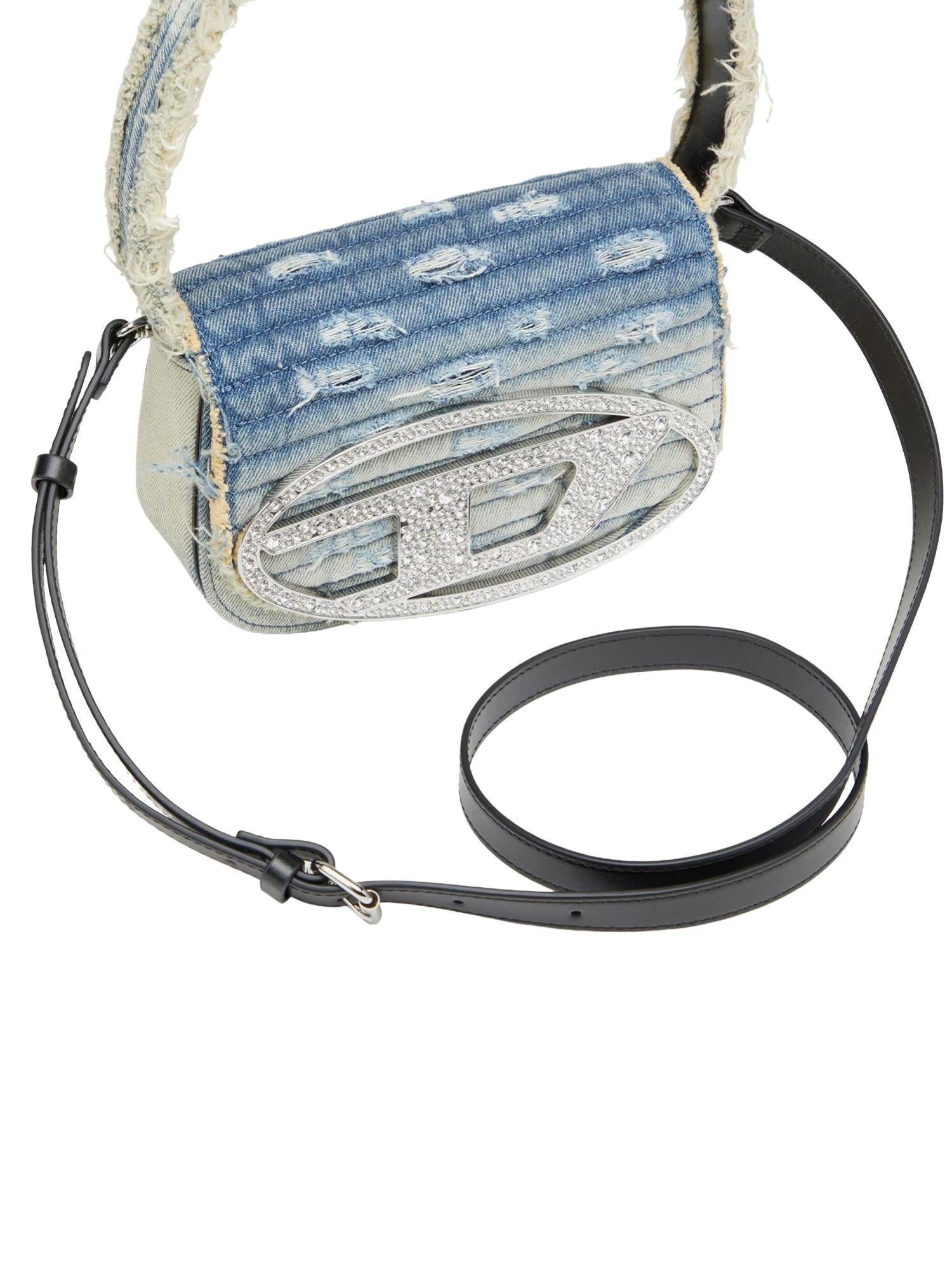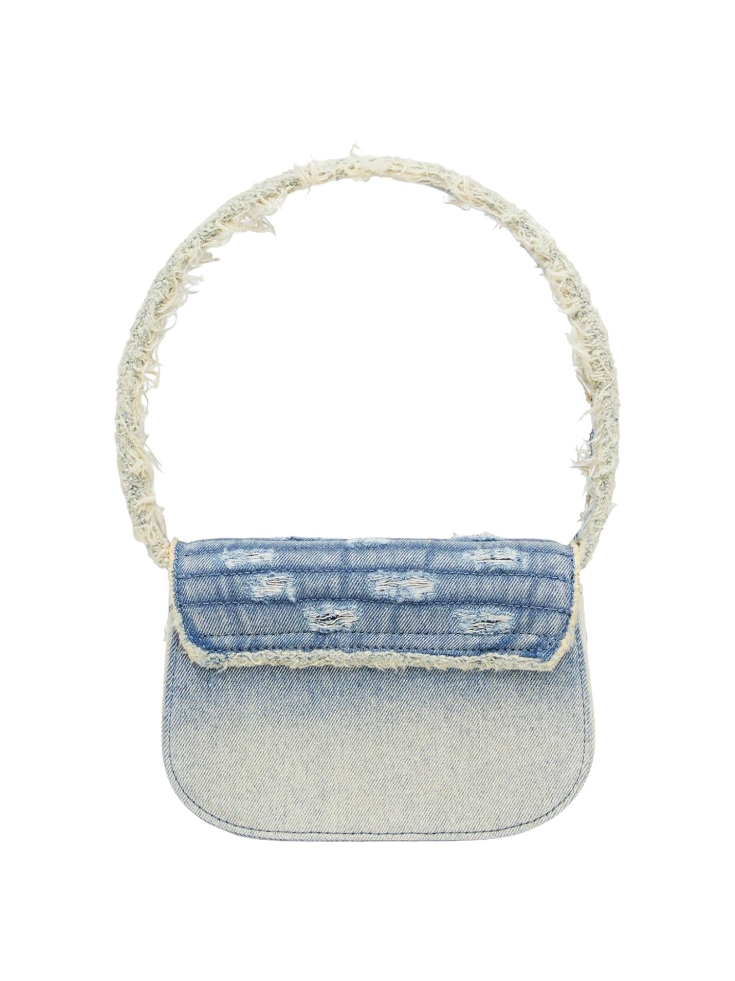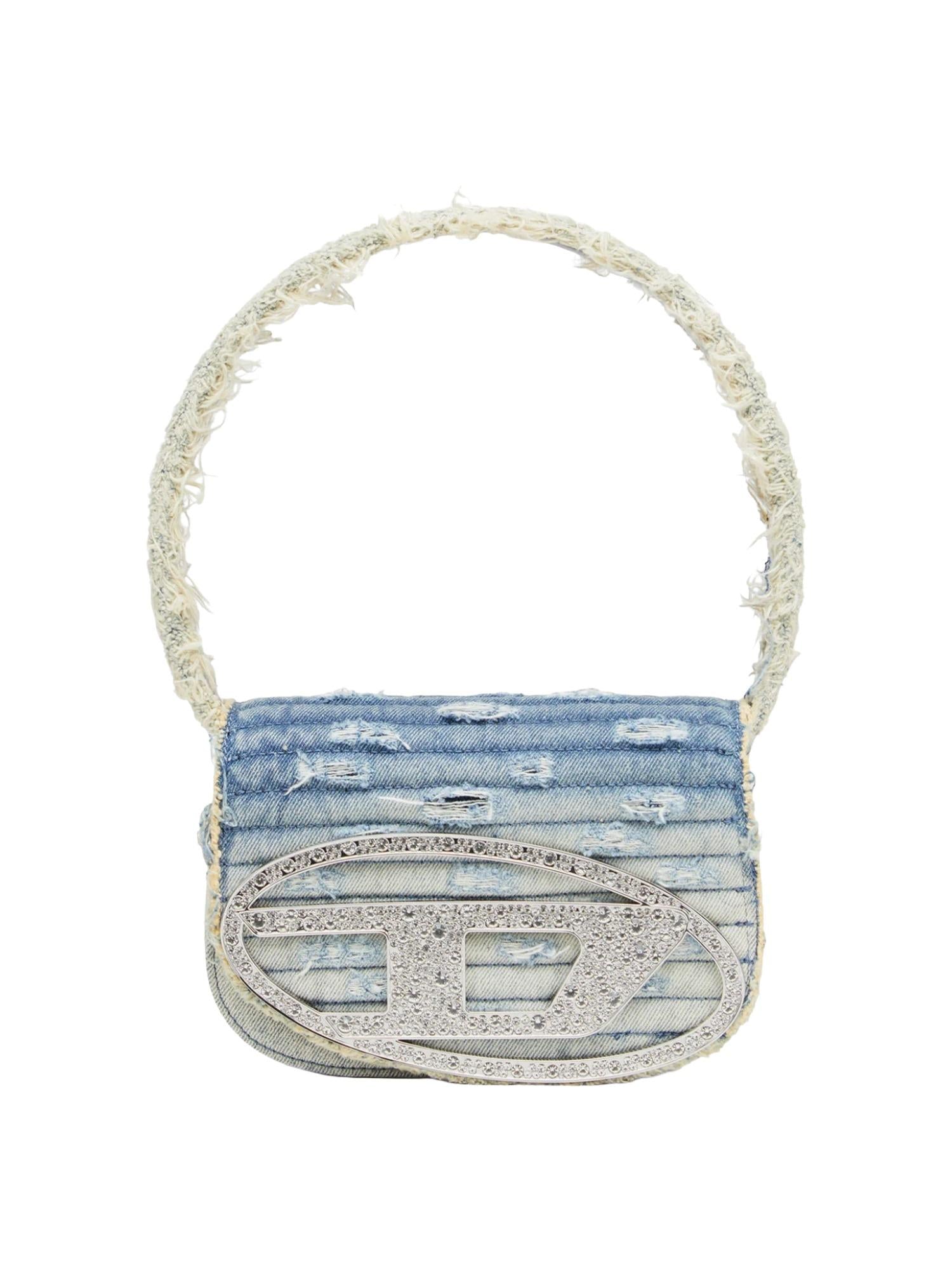Iconica borsa a spalla Diesel 1DR realizzata in denim sfilacciato misto a vera pelle con manico piatto, tracolla removibile, chiusura magnetica, placca logata Oval-D metallica e scomparto interno con tasca a busta.