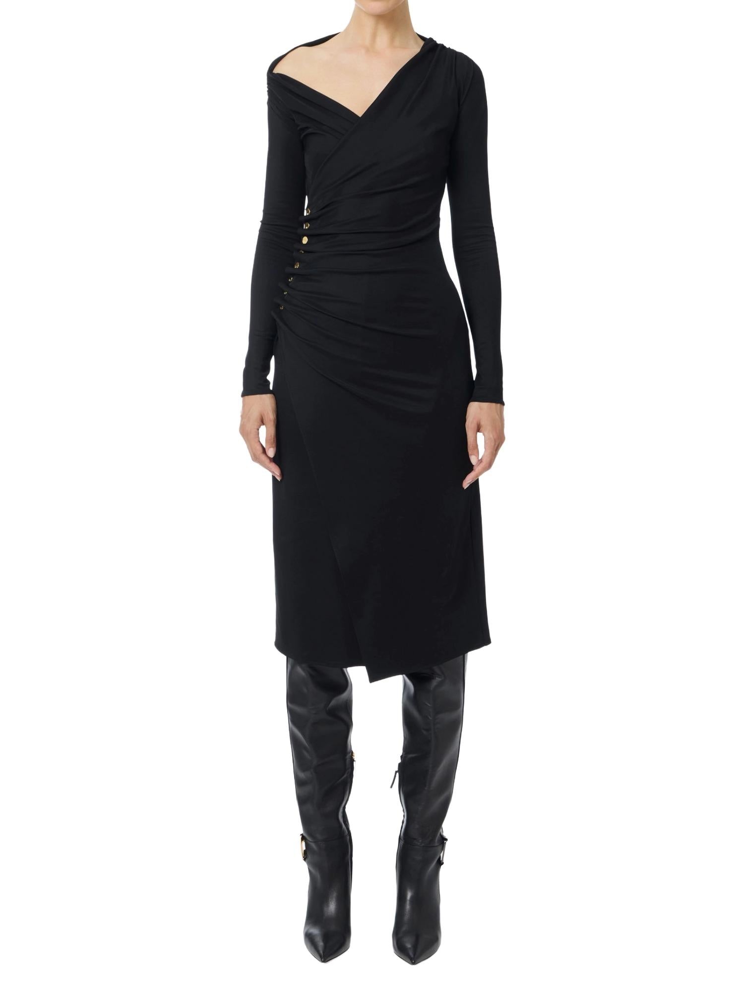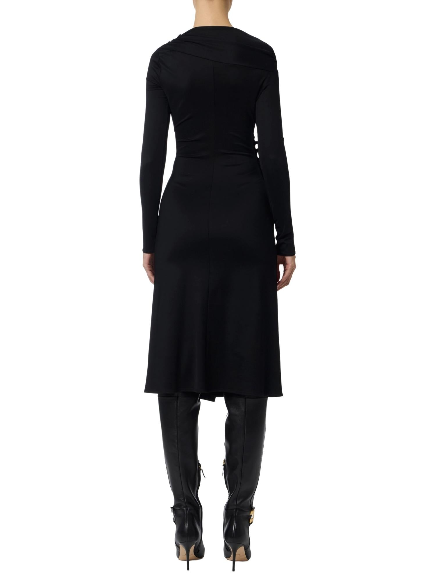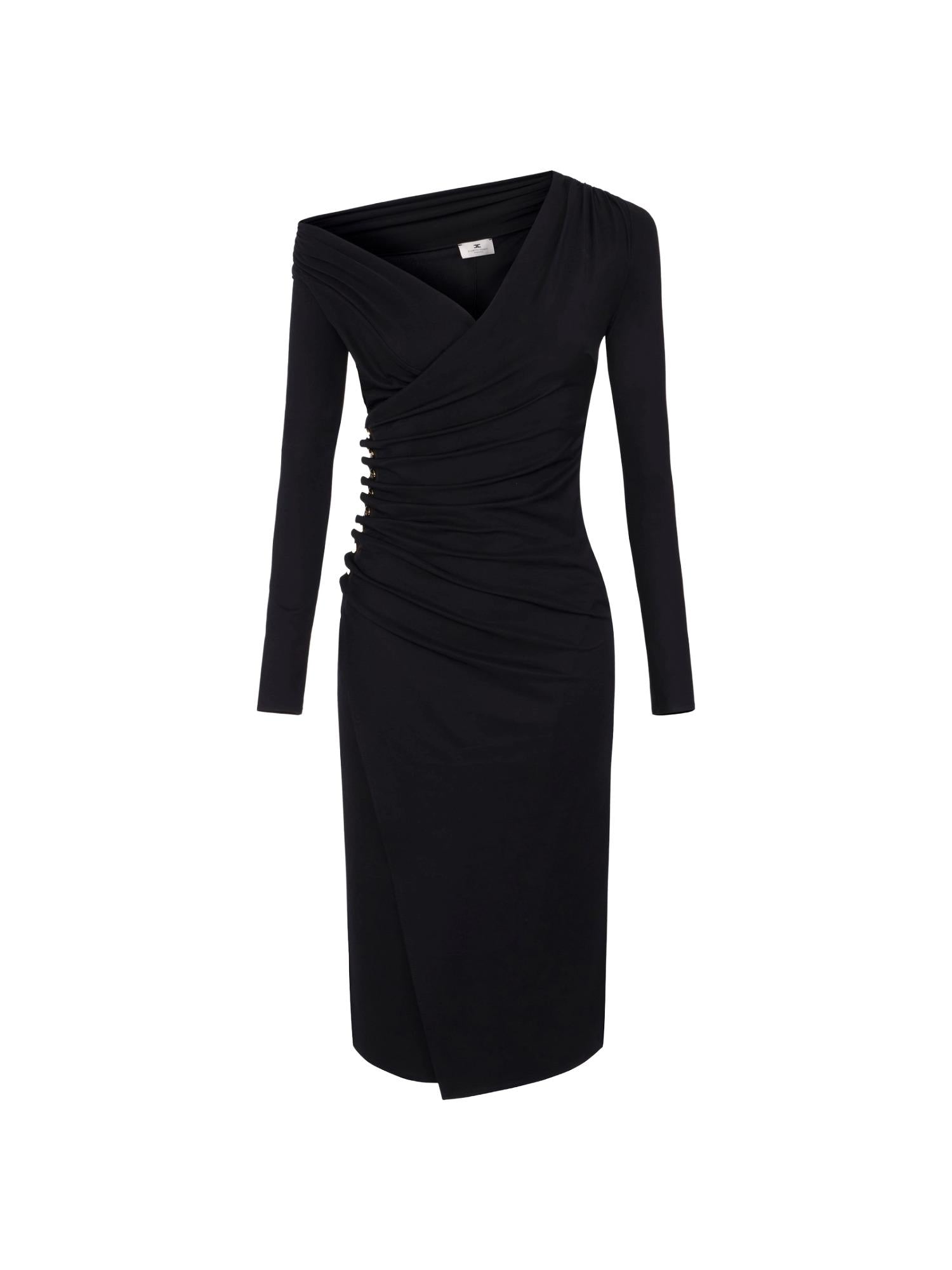 Abito midi a maniche lunghe Elisabetta Franchi realizzato in jersey di viscosa stretch con scollo asimmetrico, gonna con spacco laterale e bottoni gioiello sul fianco che creano un drappeggio.