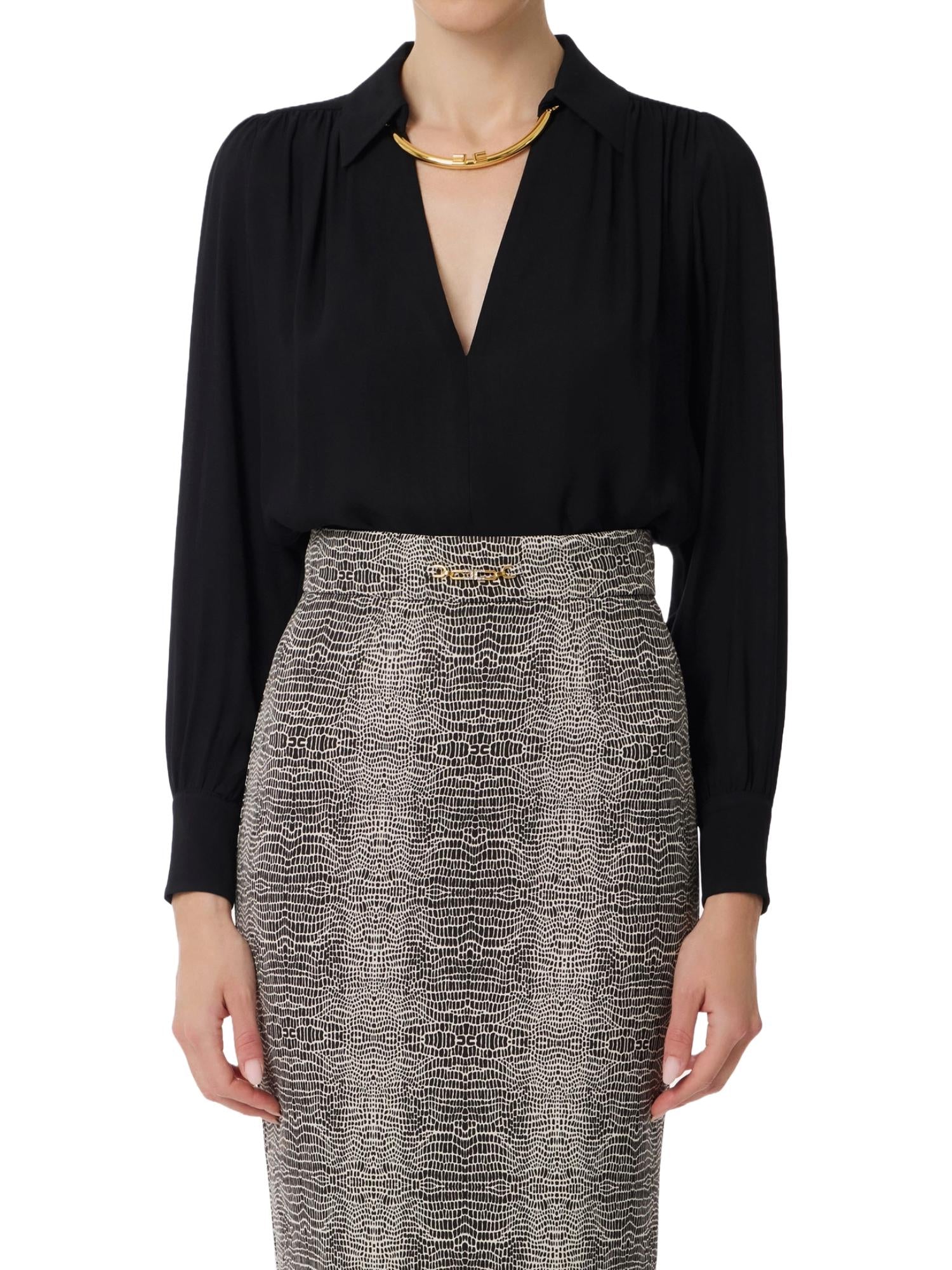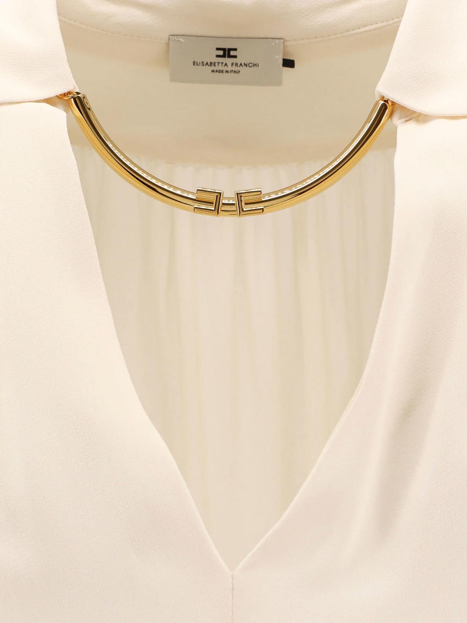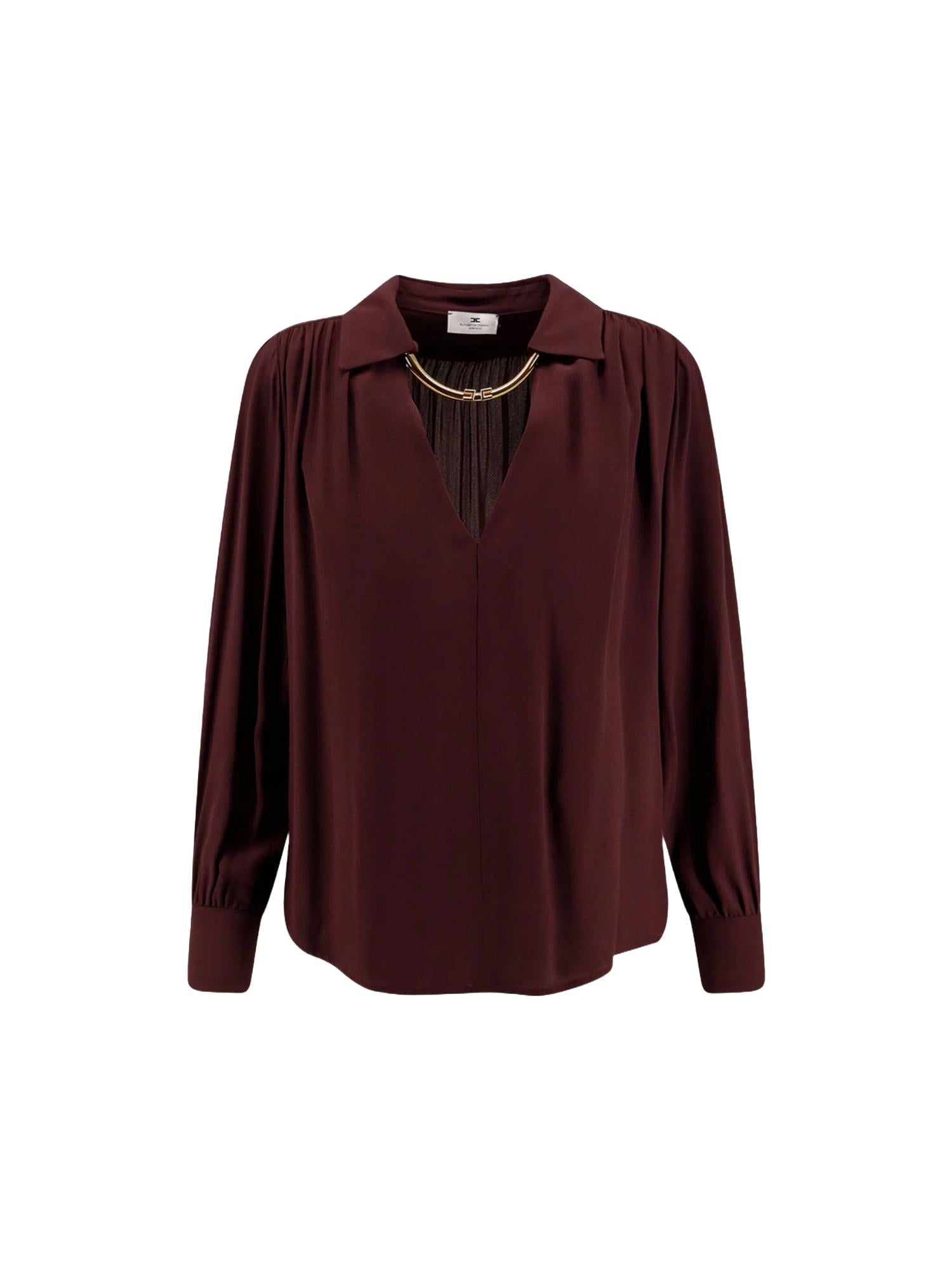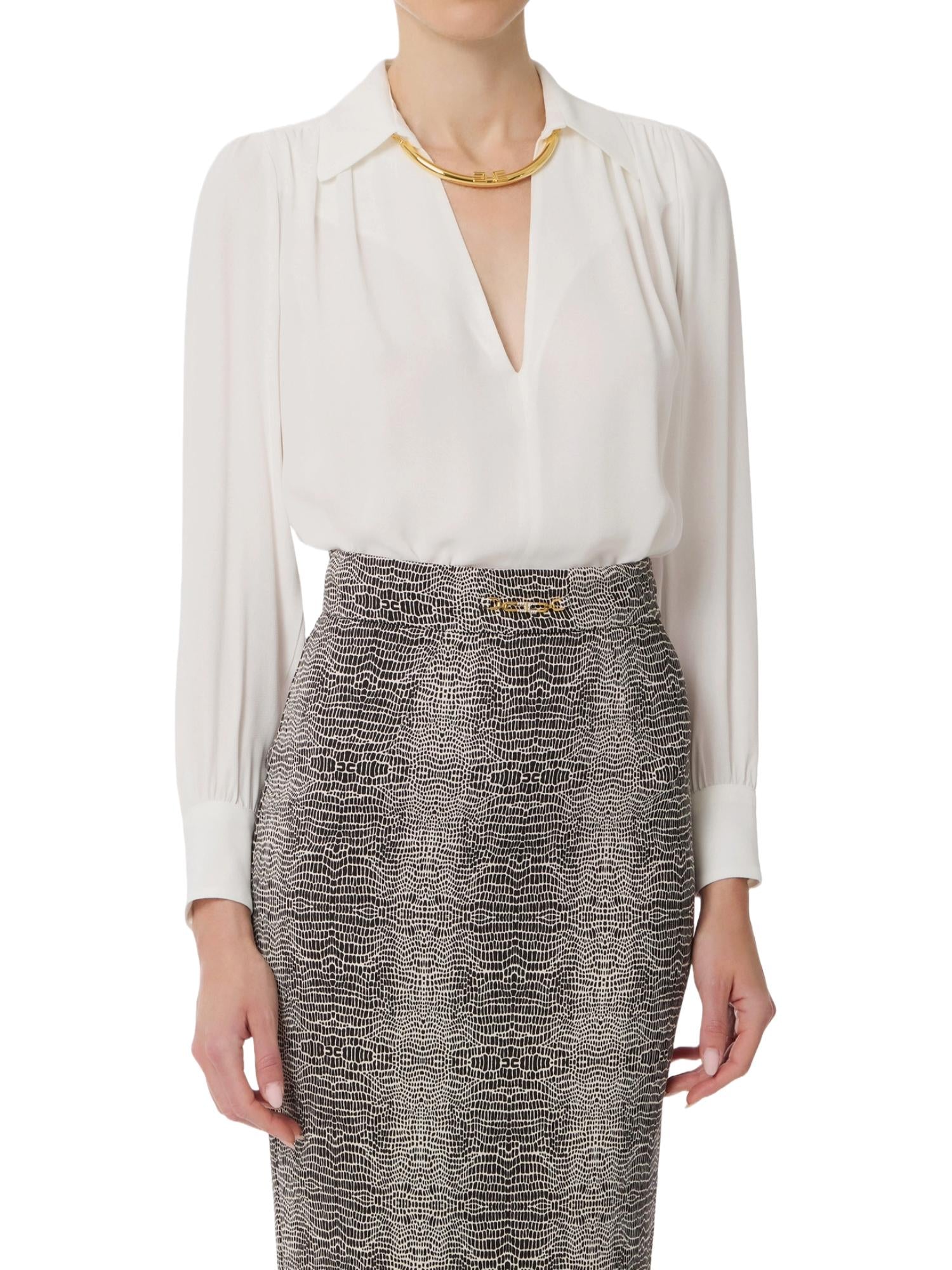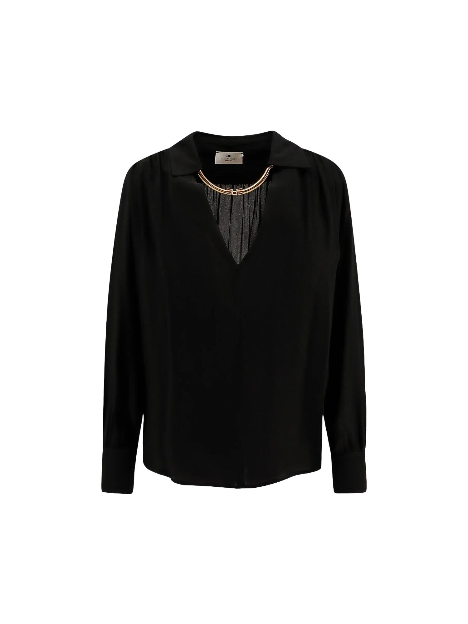 Camicia slim Elisabetta Franchi realizzata in georgette di pura viscosa con scollo a V, maniche lunghe e colletto all'italiana con dettaglio gioiello logato removibile.