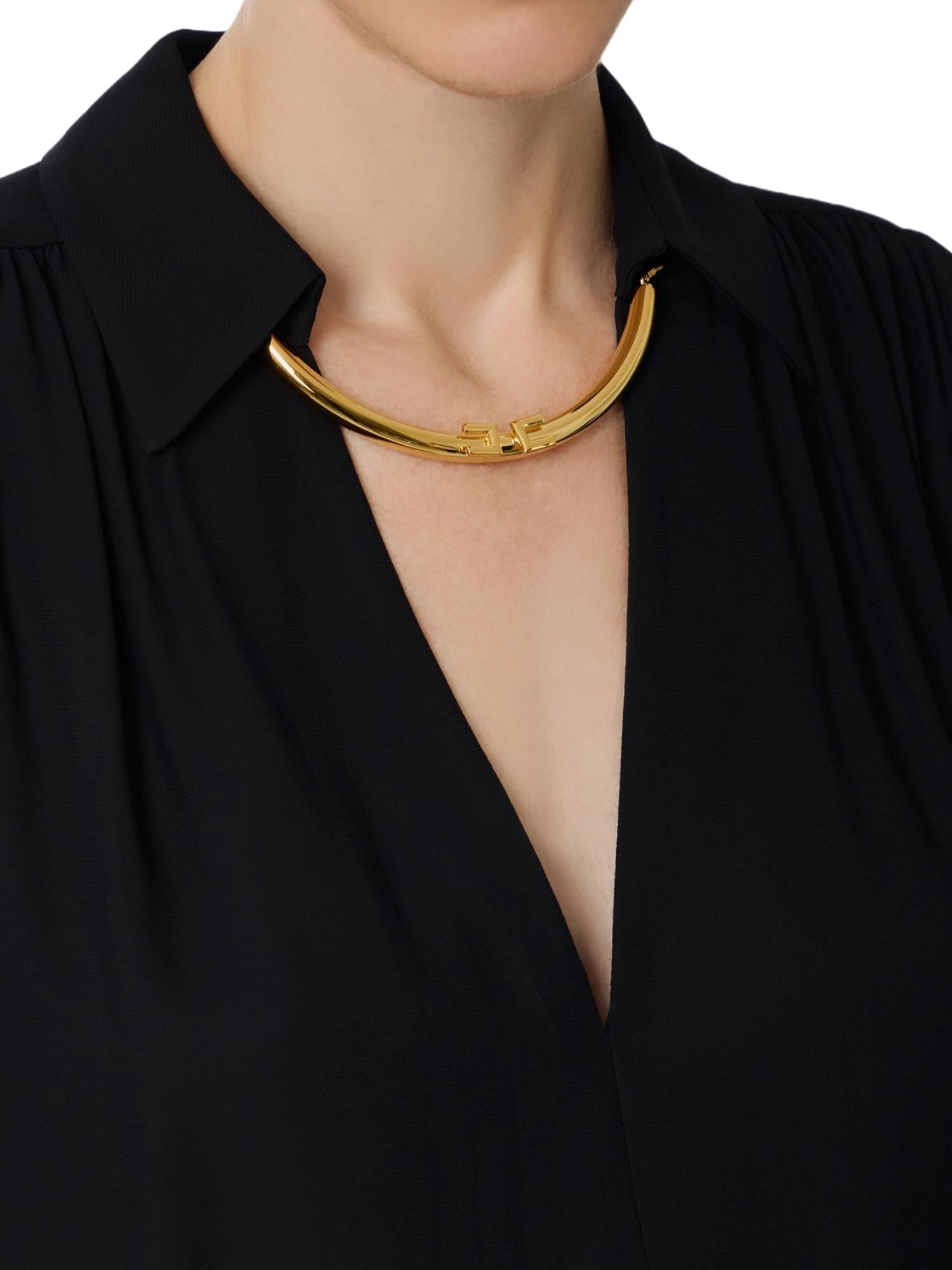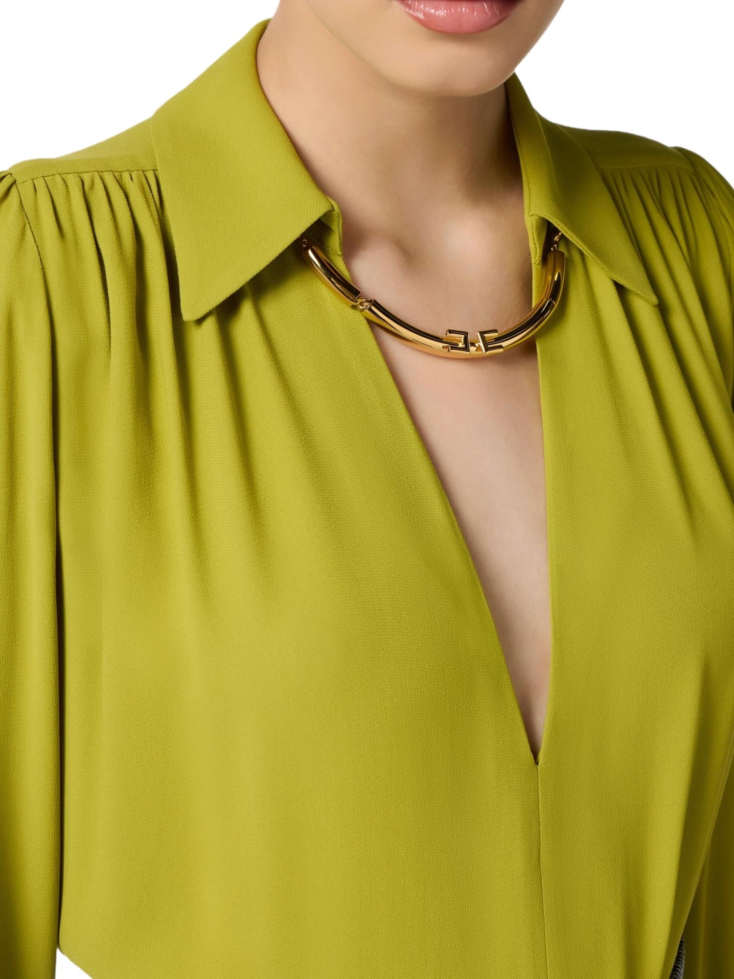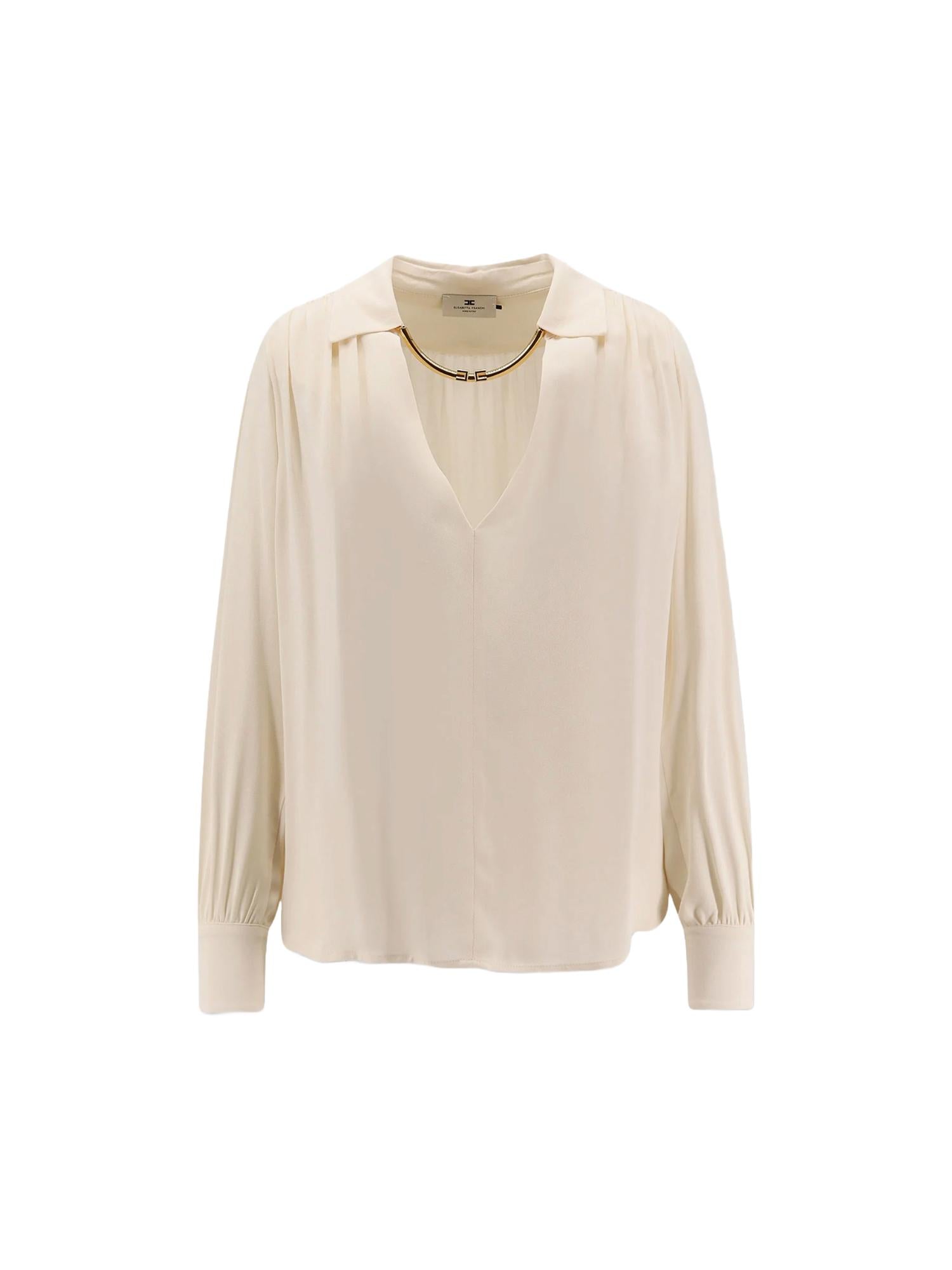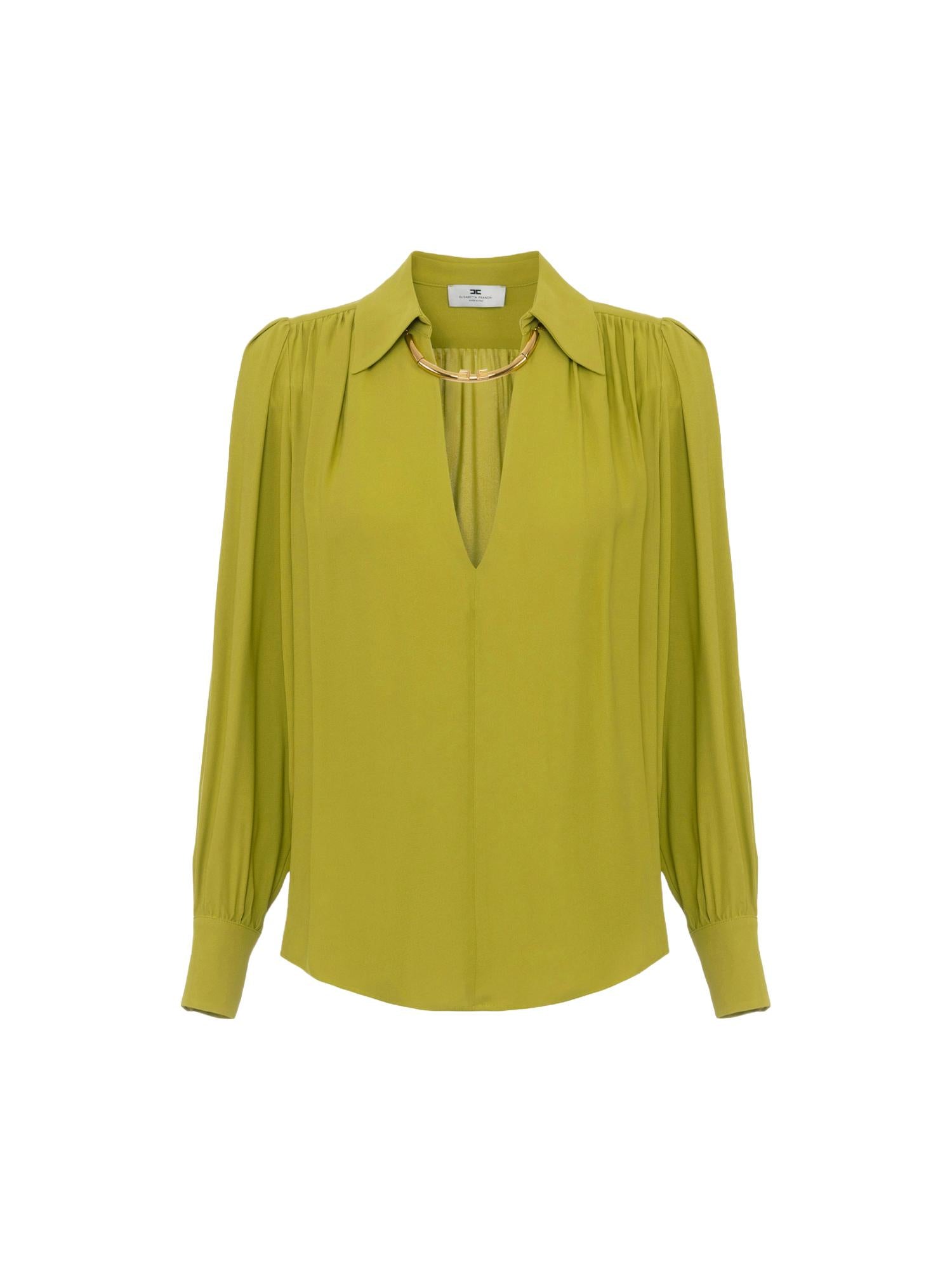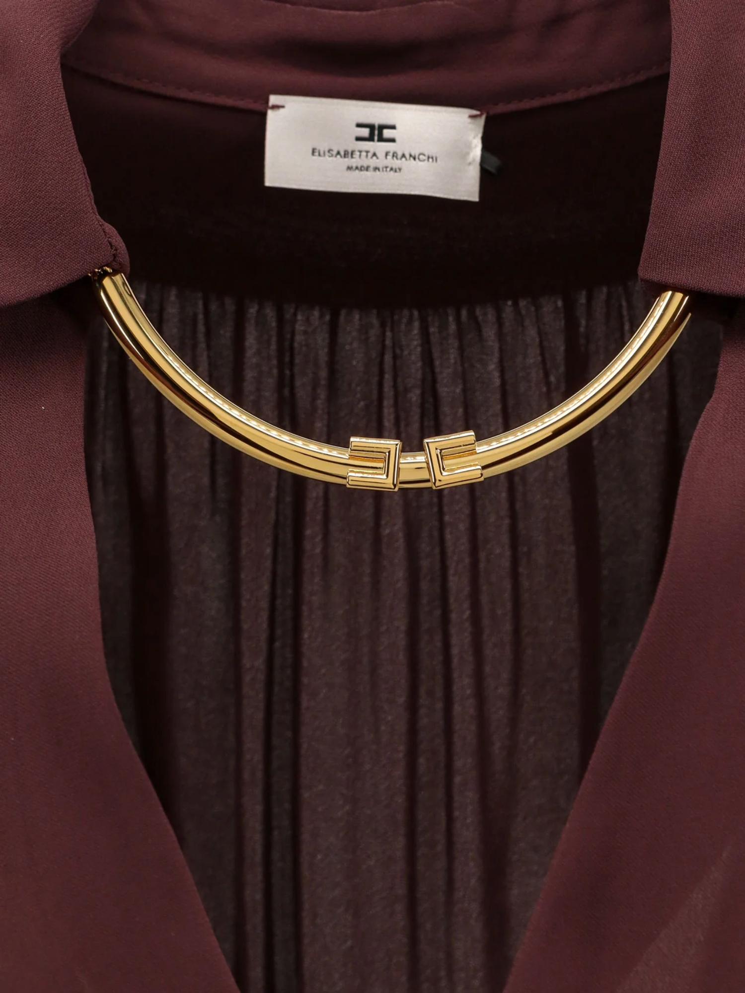 Camicia slim Elisabetta Franchi realizzata in georgette di pura viscosa con scollo a V, maniche lunghe e colletto all'italiana con dettaglio gioiello logato removibile.