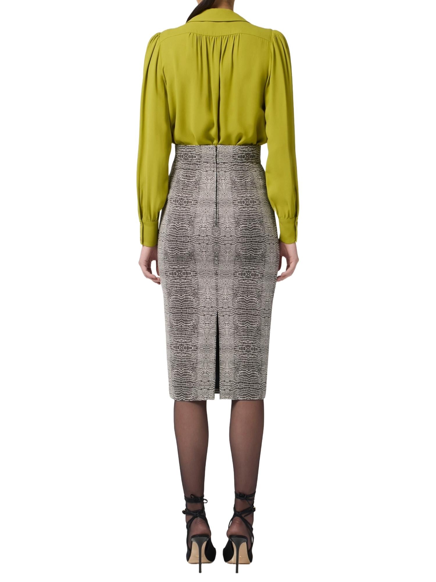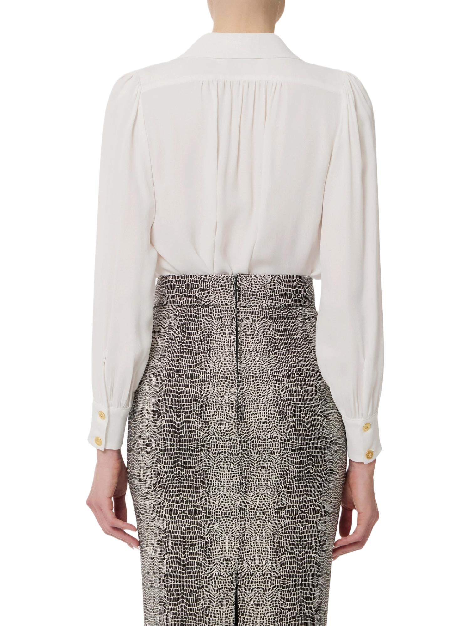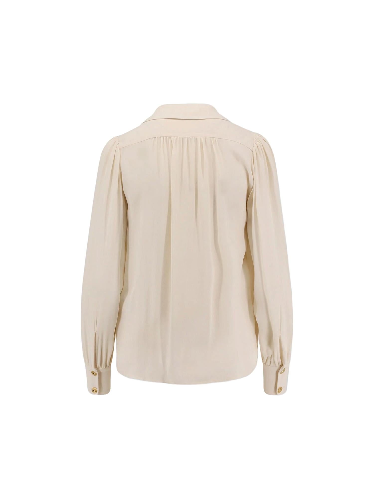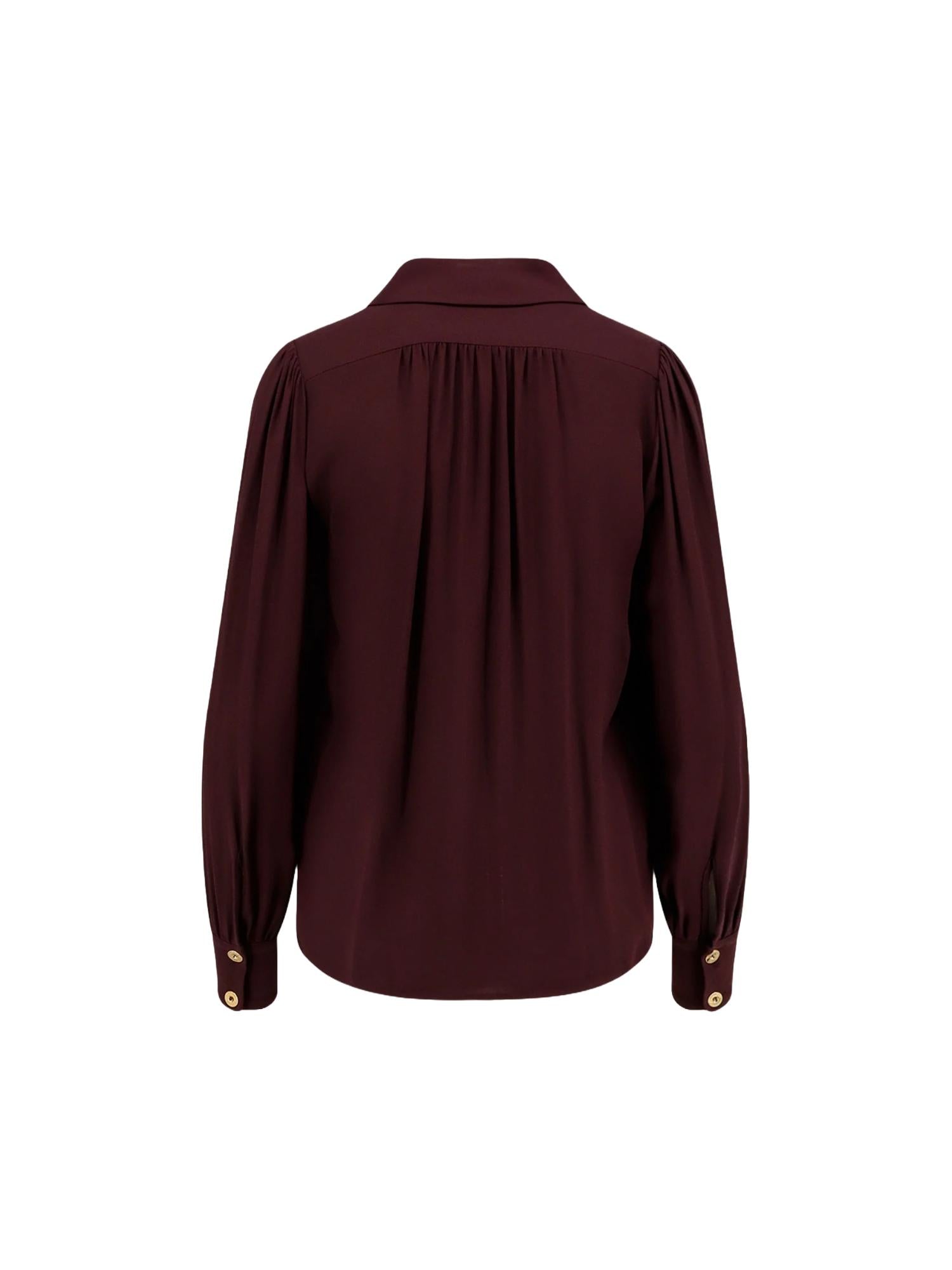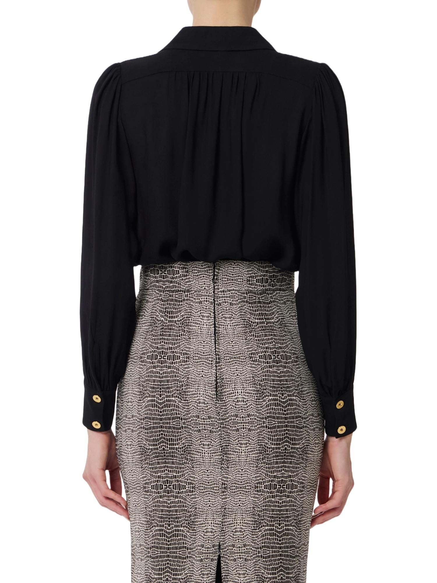 Camicia slim Elisabetta Franchi realizzata in georgette di pura viscosa con scollo a V, maniche lunghe e colletto all'italiana con dettaglio gioiello logato removibile.