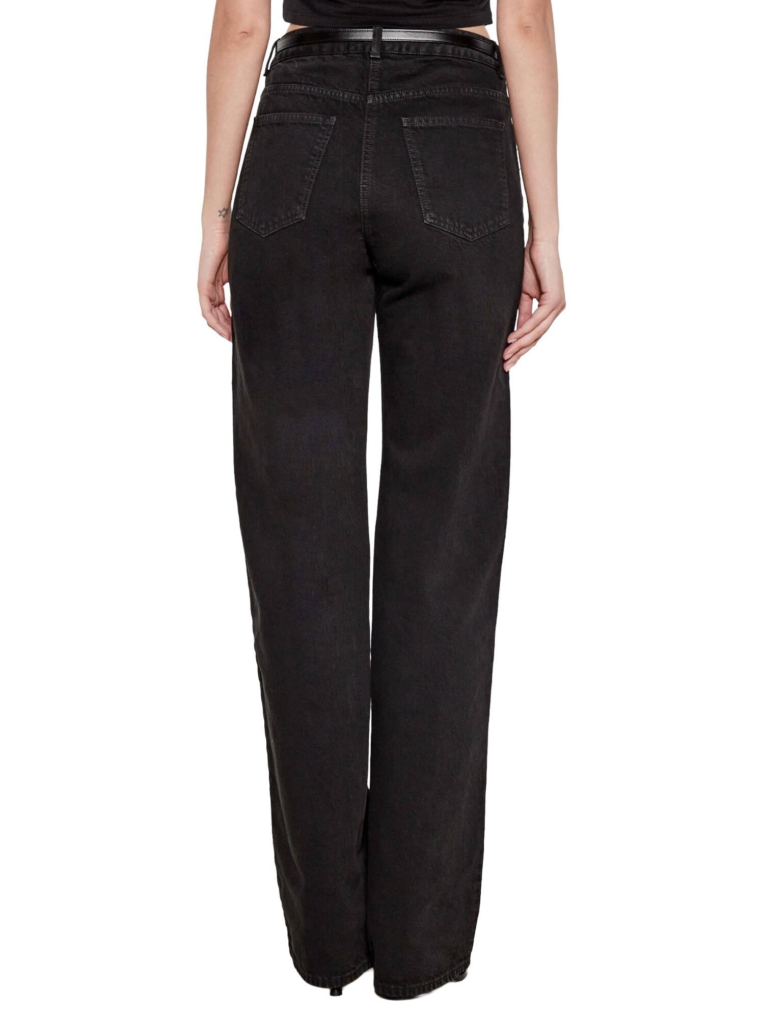 Jeans a palazzo Elisabetta Franchi realizzato in denim fermo con chiusura tramite zip e bottone, vita bassa, passanti per la cintura abbinata, 5 tasche e bande laterali in raso.