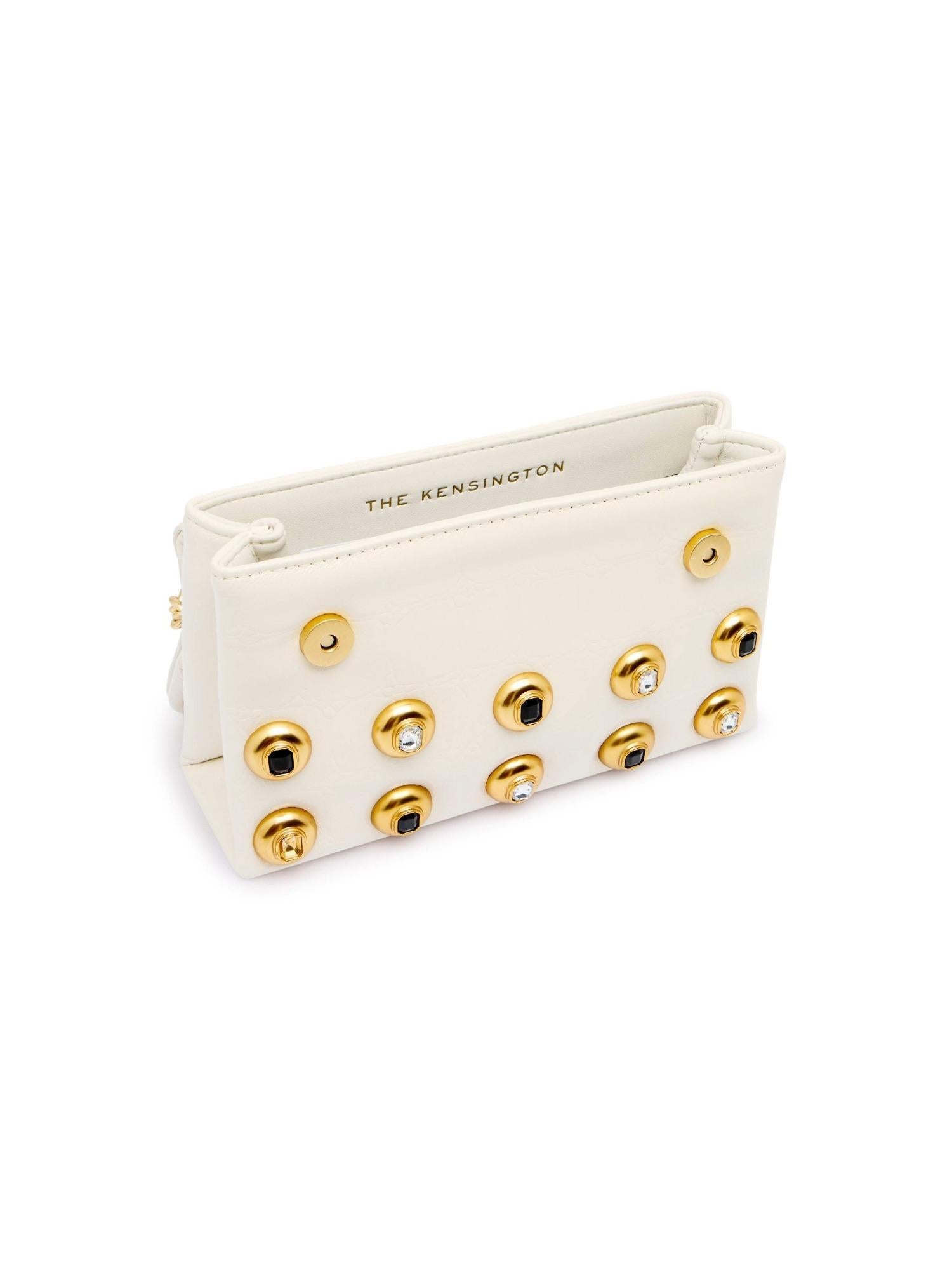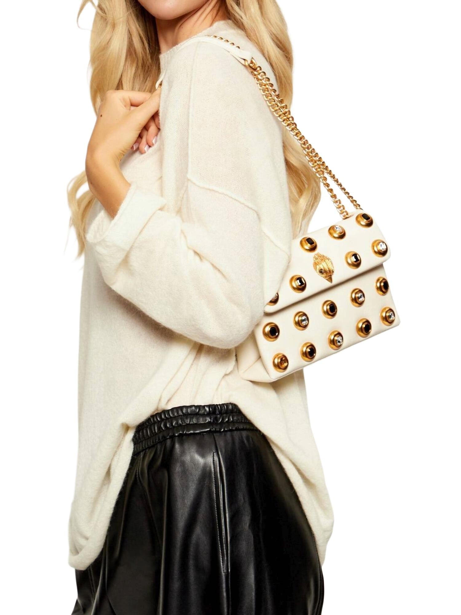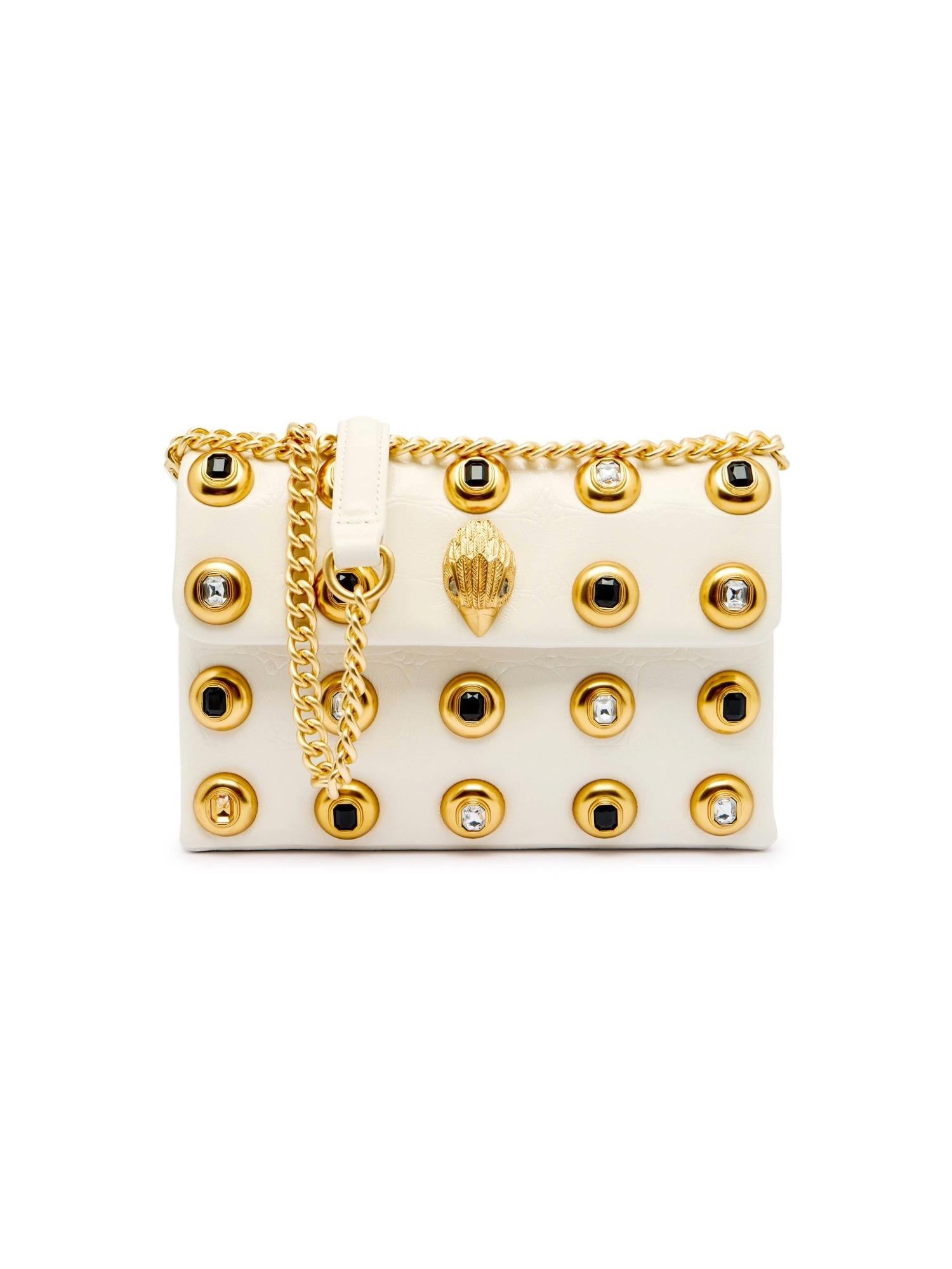 Borsa Kurt Geiger realizzata in vera pelle con chiusura magnetica, tracolla in catena con spallaccio, unico scomparto interno e pietre applicate allover.
