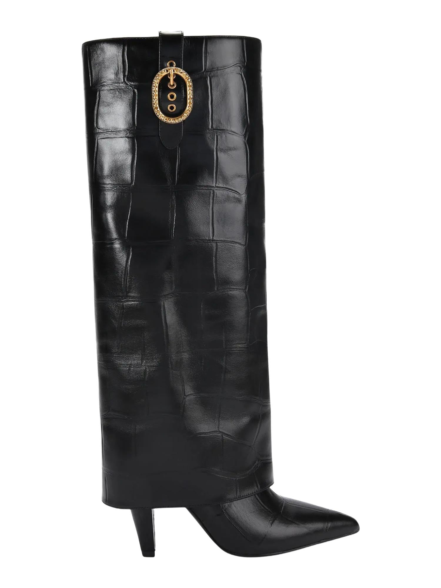 Stivali alti Kurt Geiger realizzati in vera pelle con stampa coccodrillo, design ripiegabile, tacco 10 cm e cinturino con fibbia logata nella parte alta.