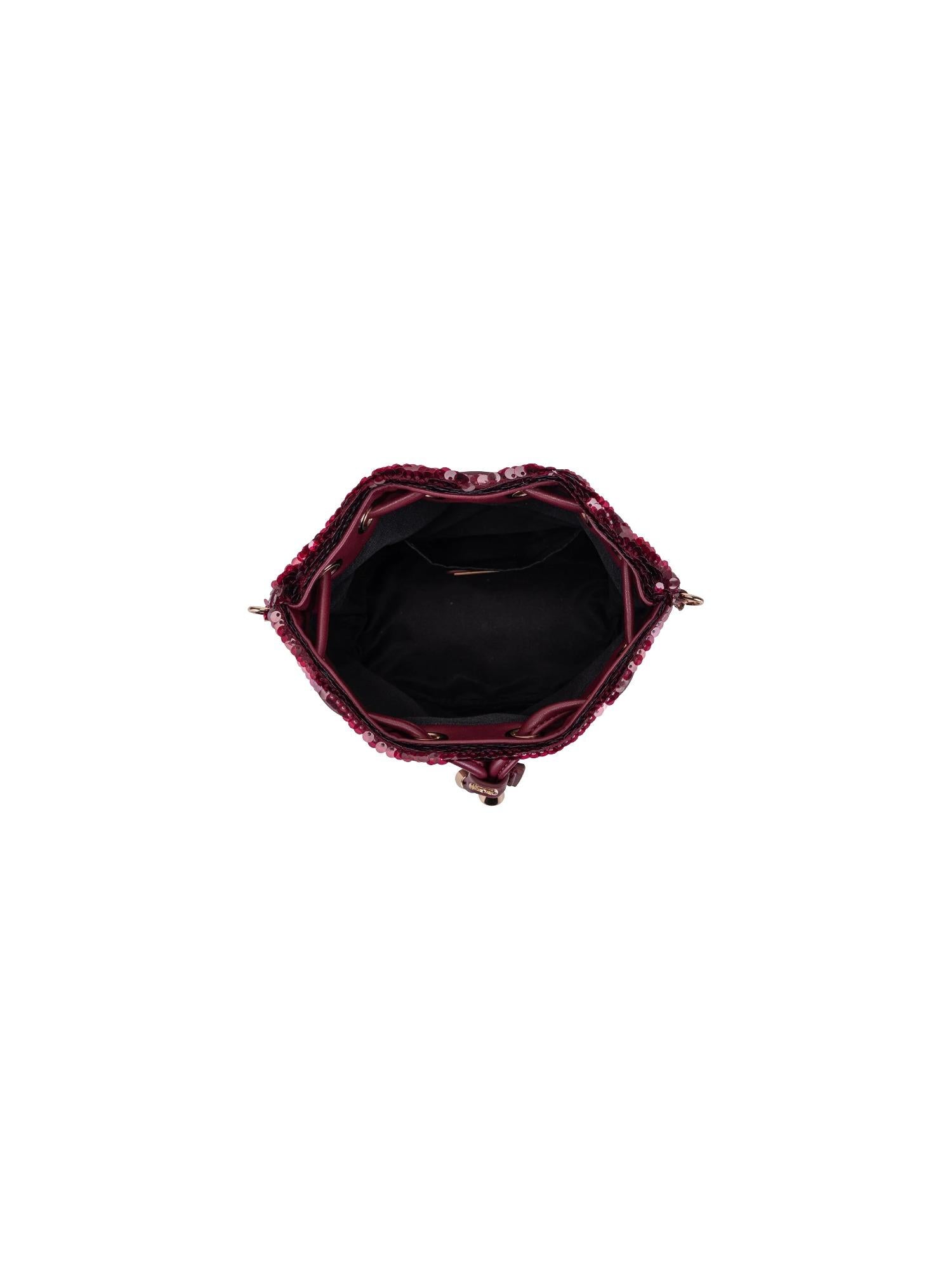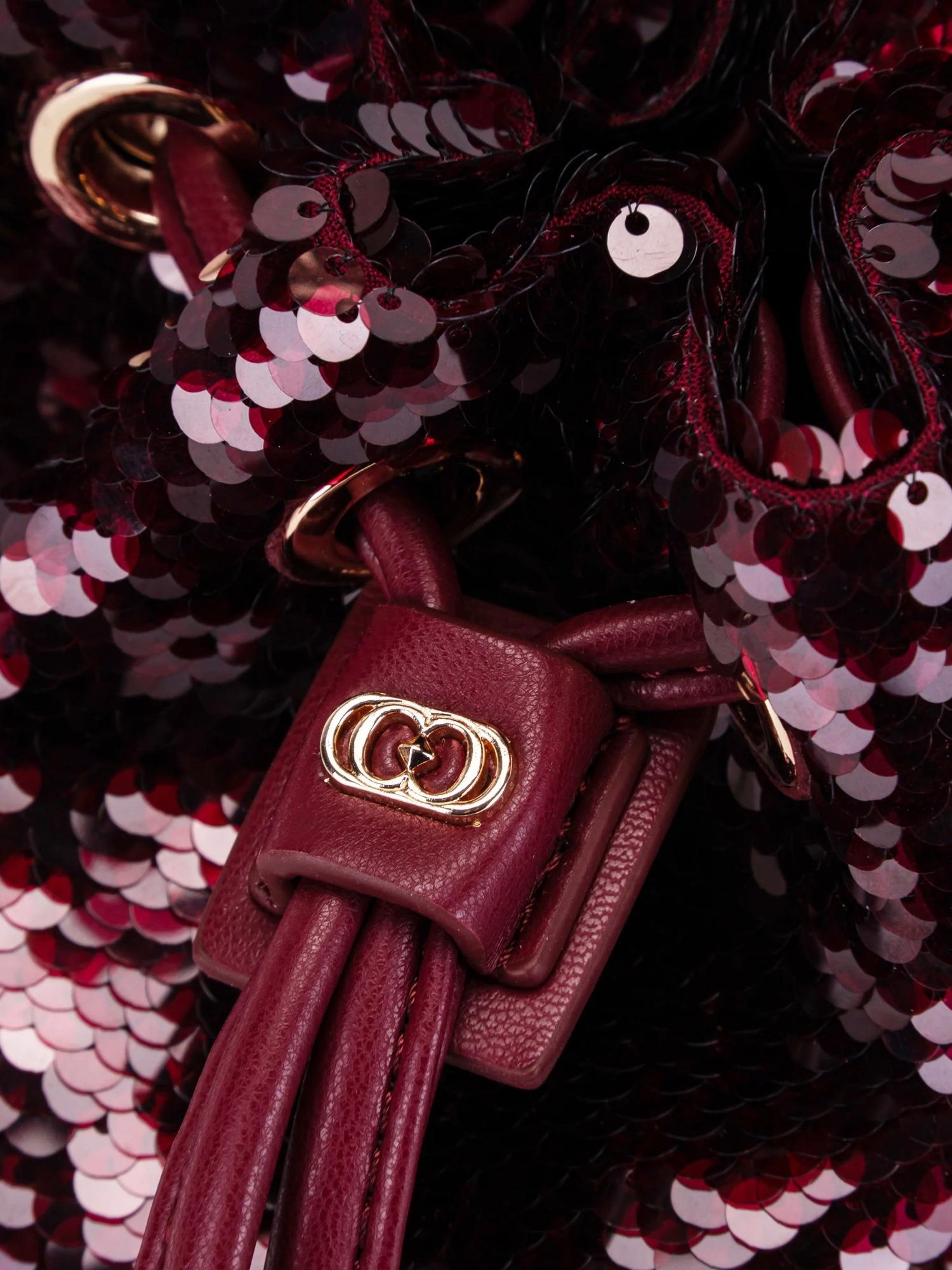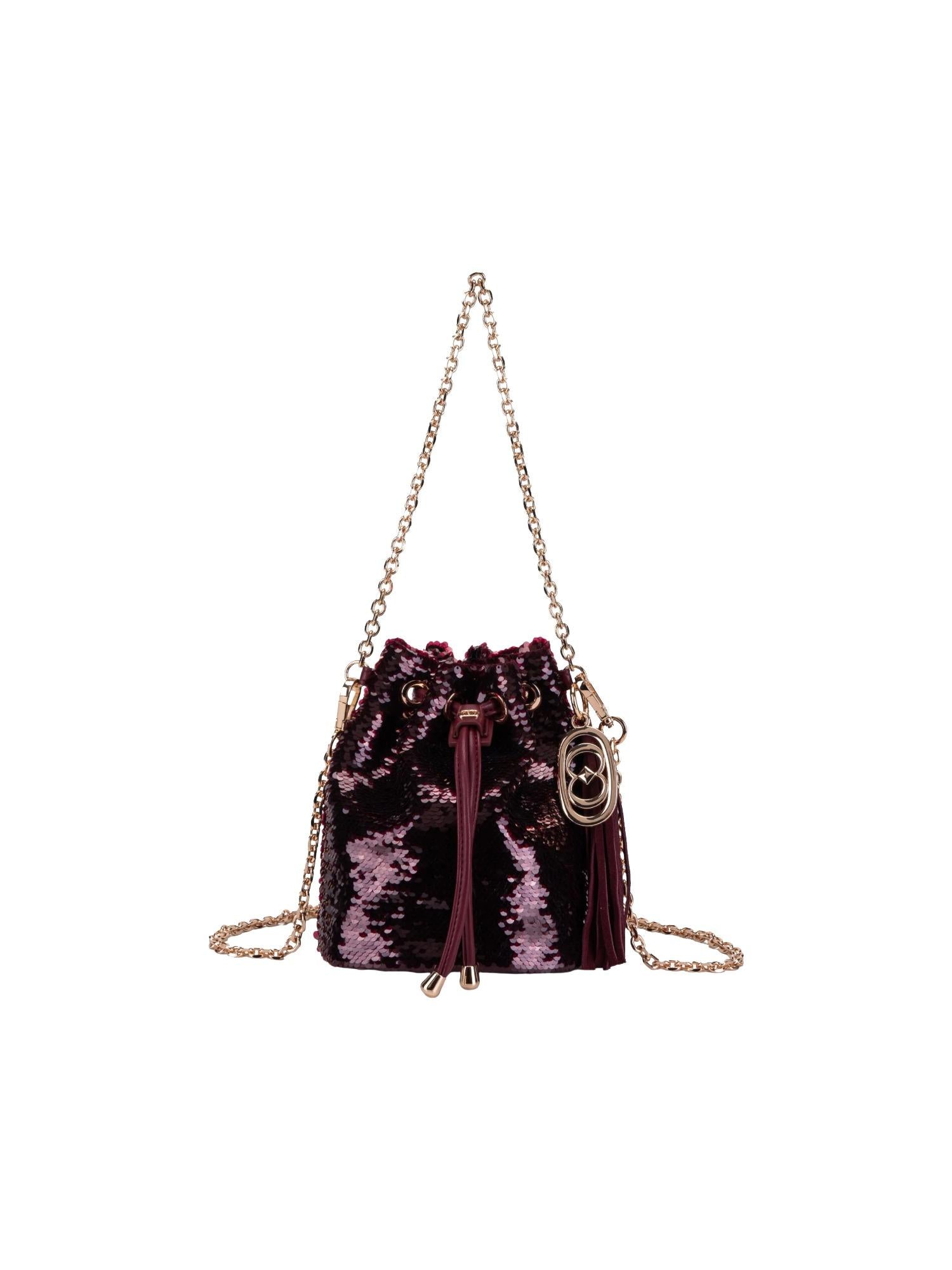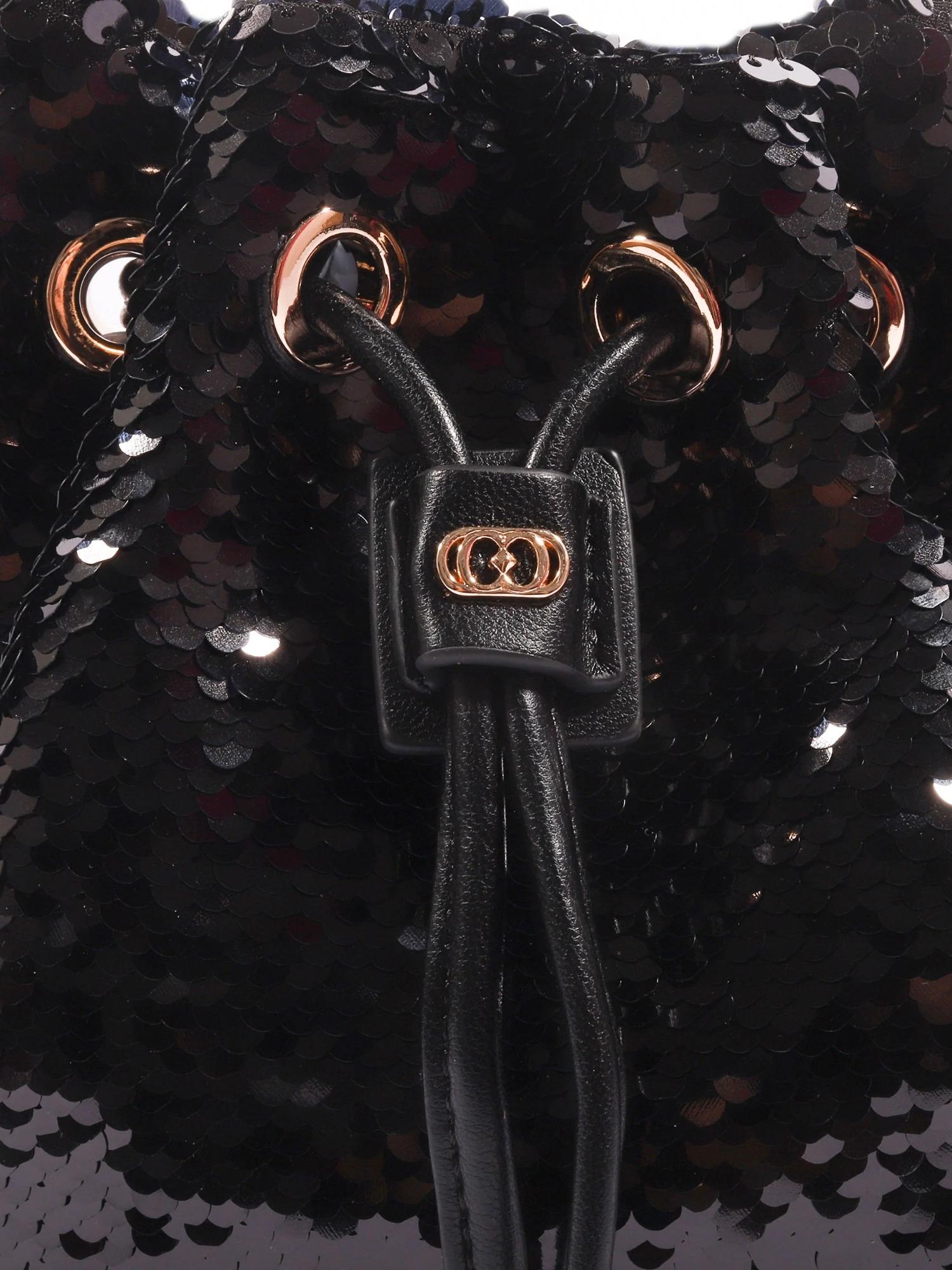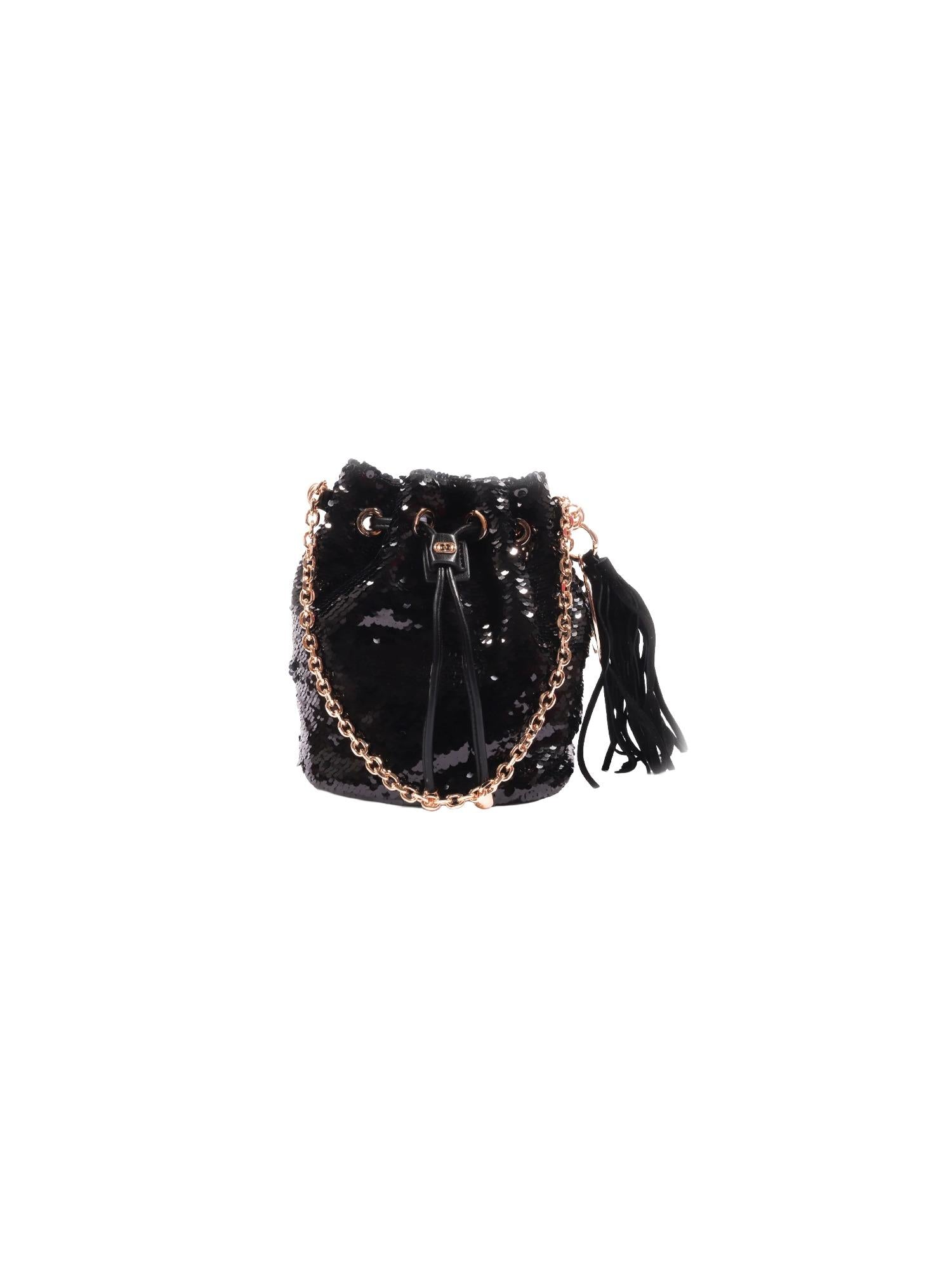Borsa a secchiello La Carrie realizzata in full paillettes con chiusura tramite coulisse e bottone, manico e tracolla removibili e ciondolo logato.