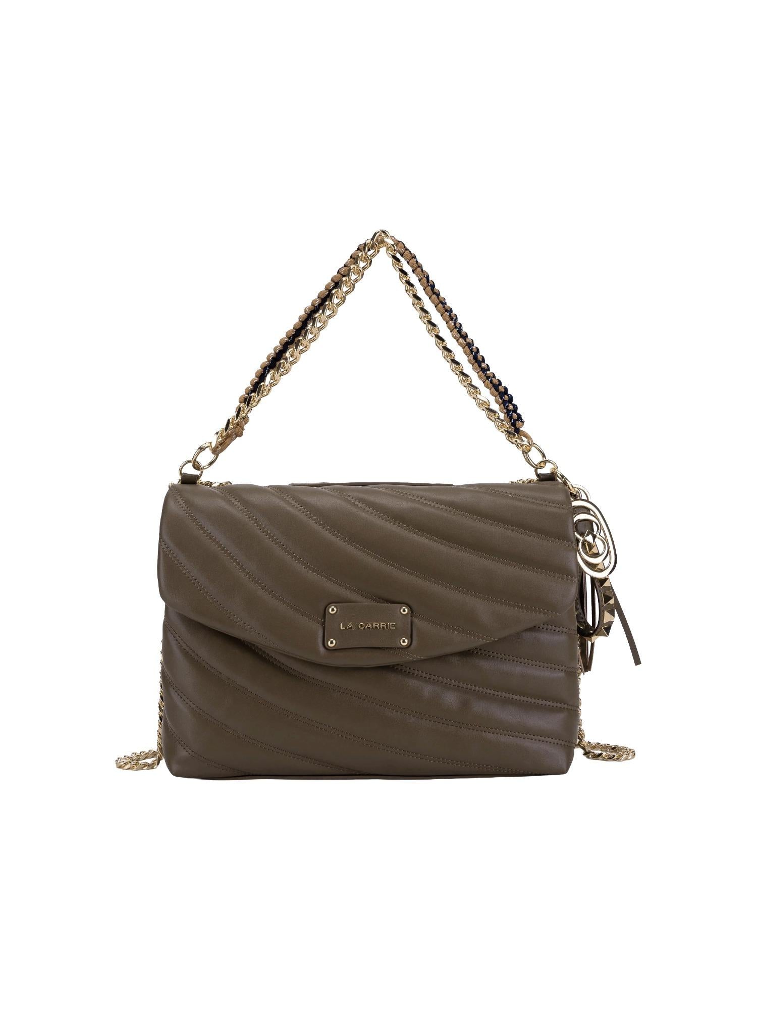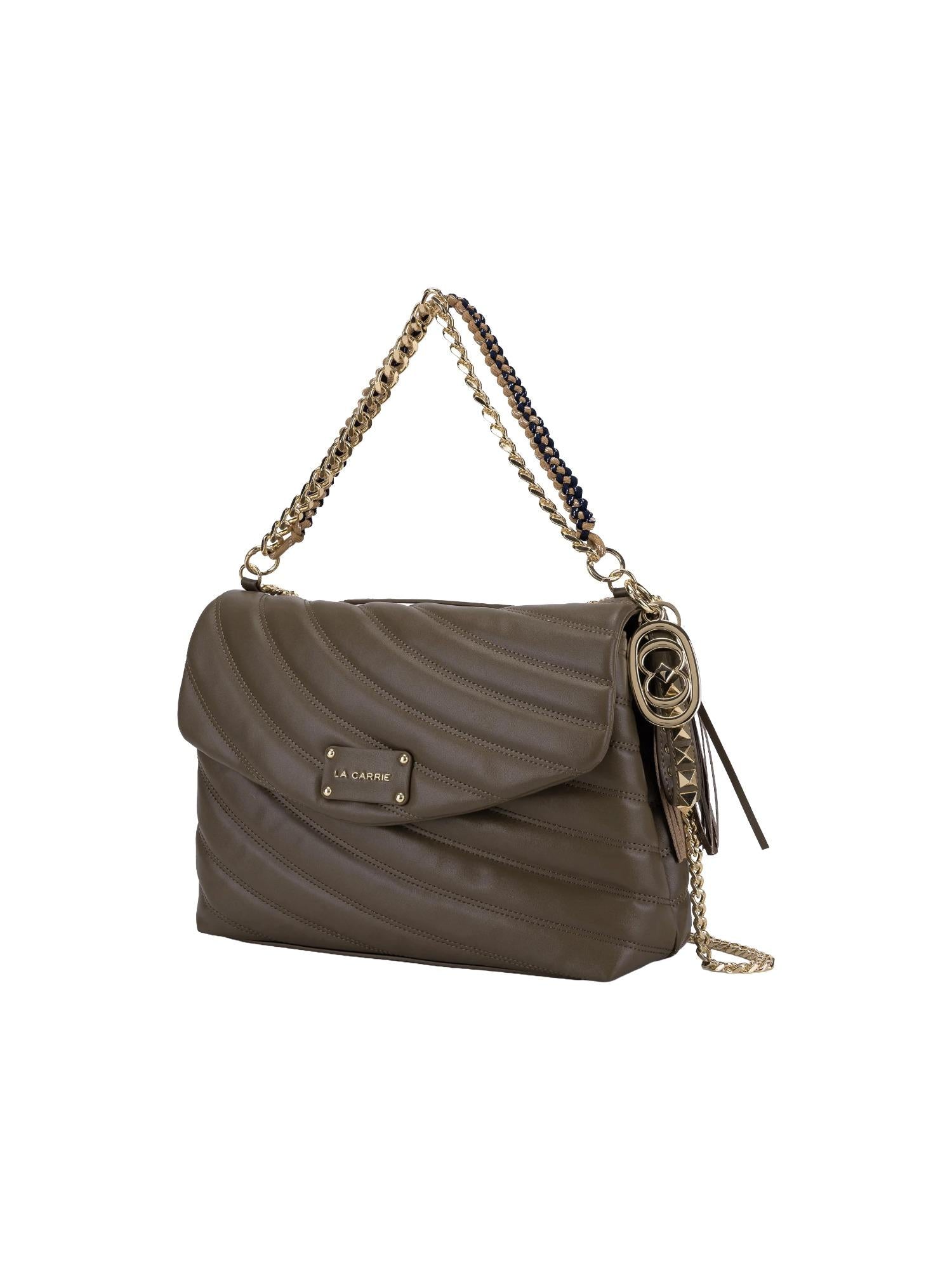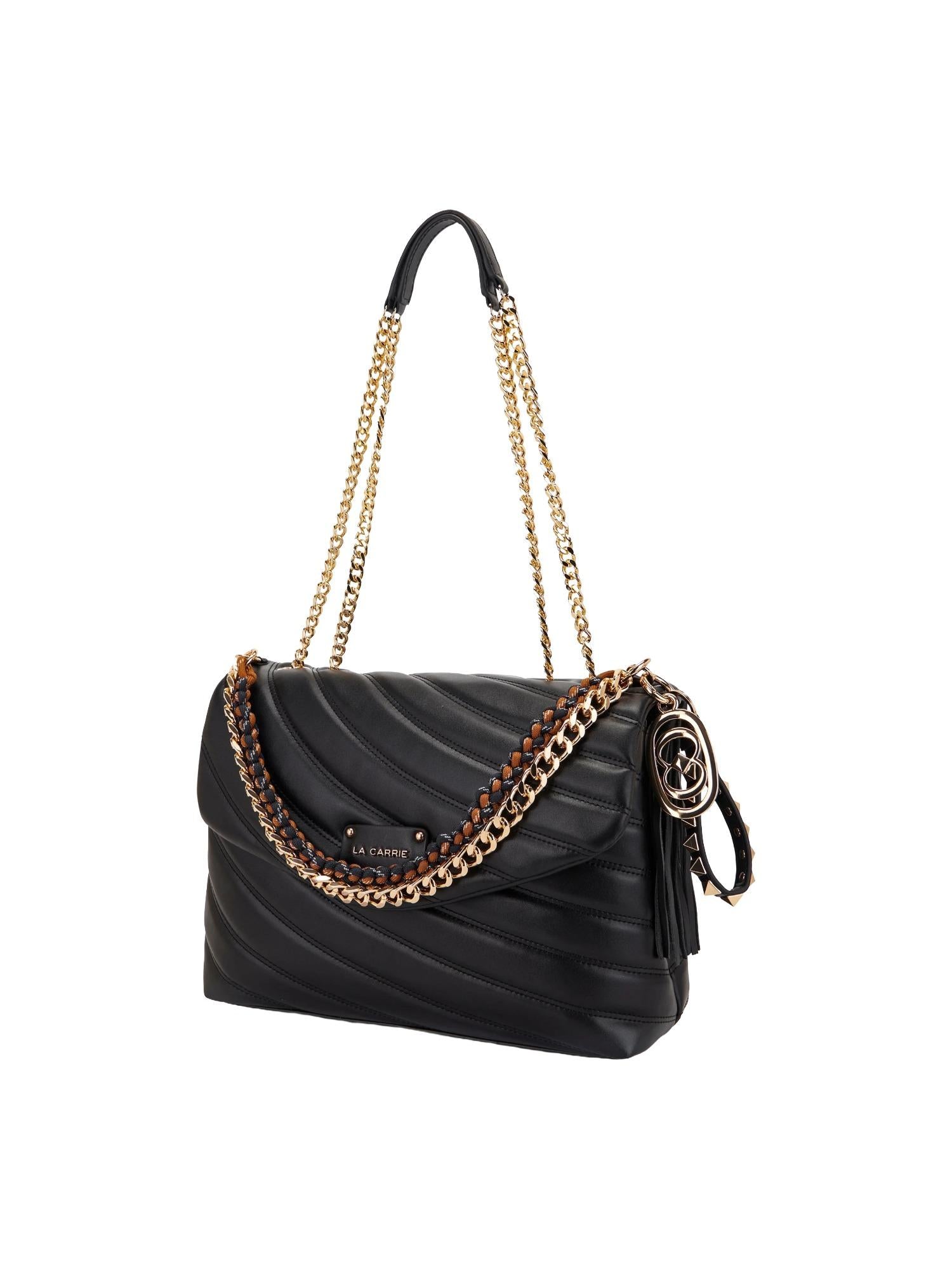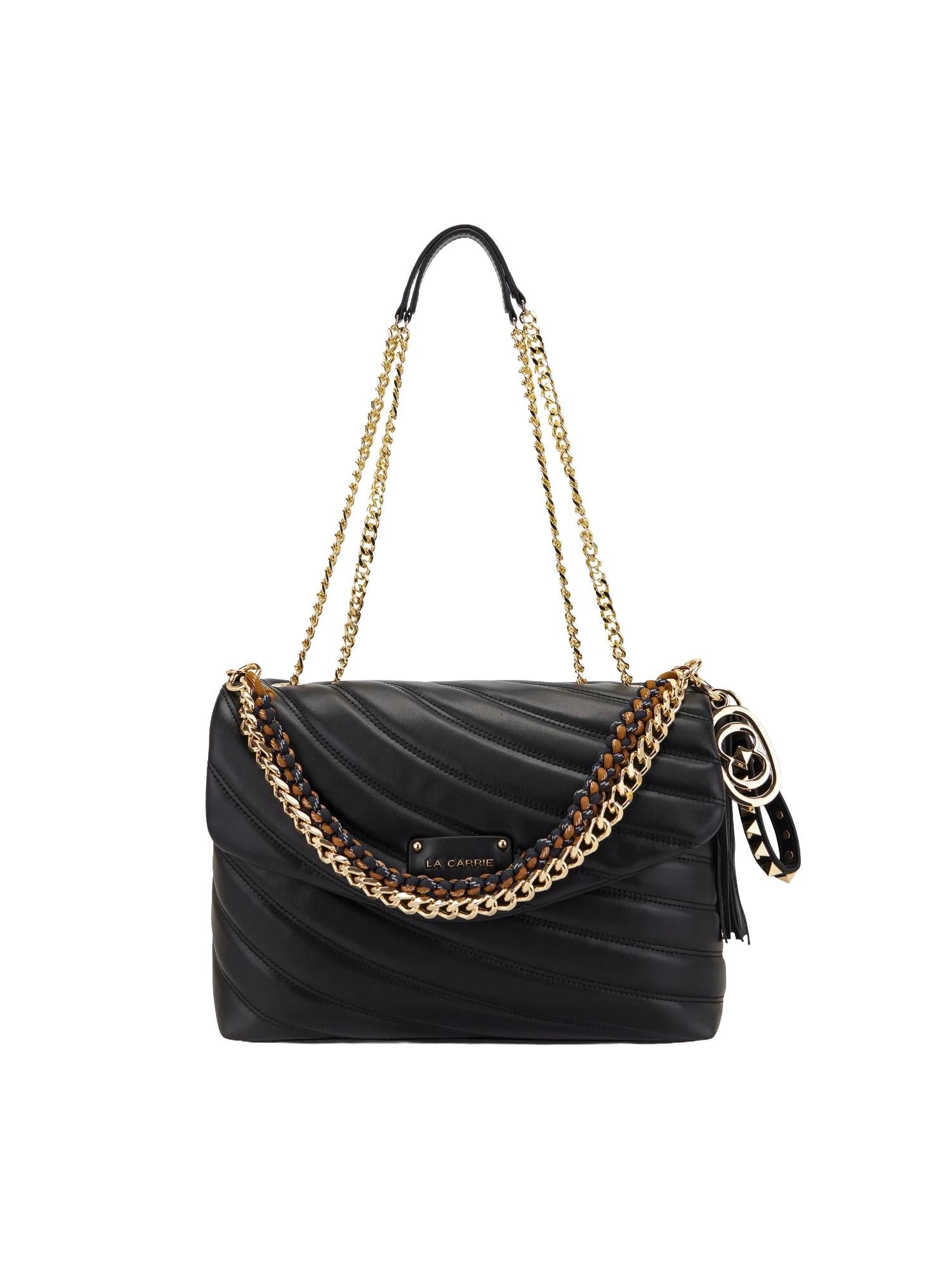 Borsa a spalla La Carrie realizzata in vera pelle trapuntata con chiusura tramite bottone, tracolla in catena con spallacci e doppio manico removibili, tasca interna con zip e placca logo frontale.