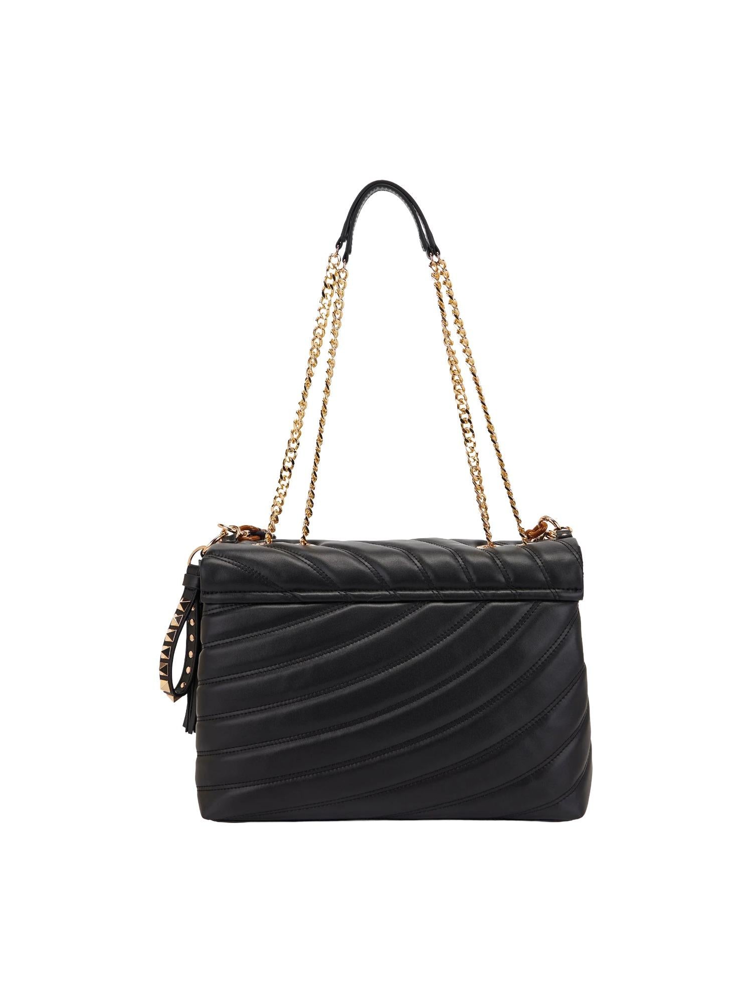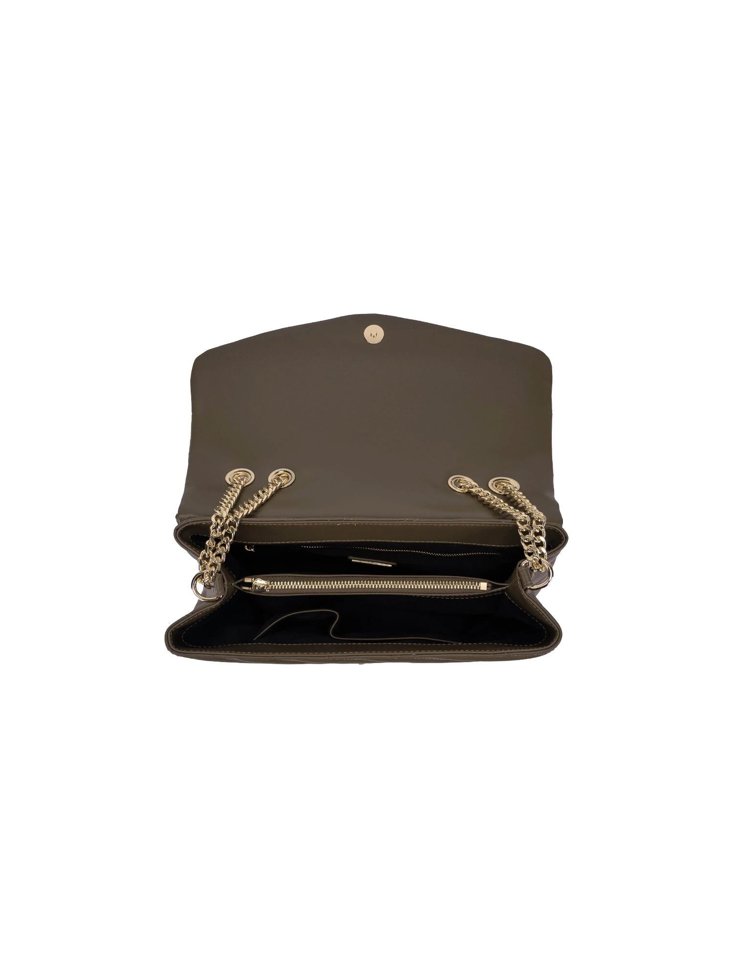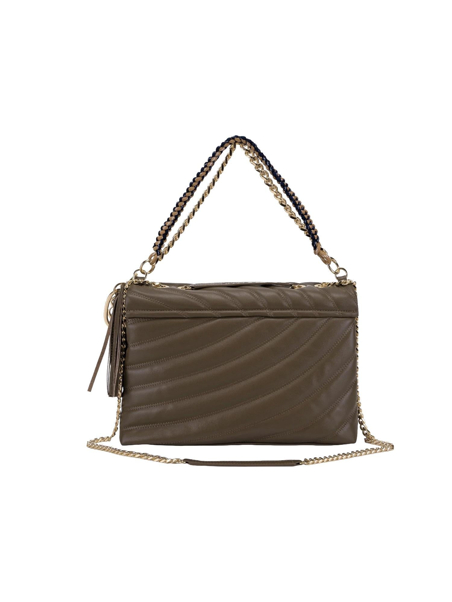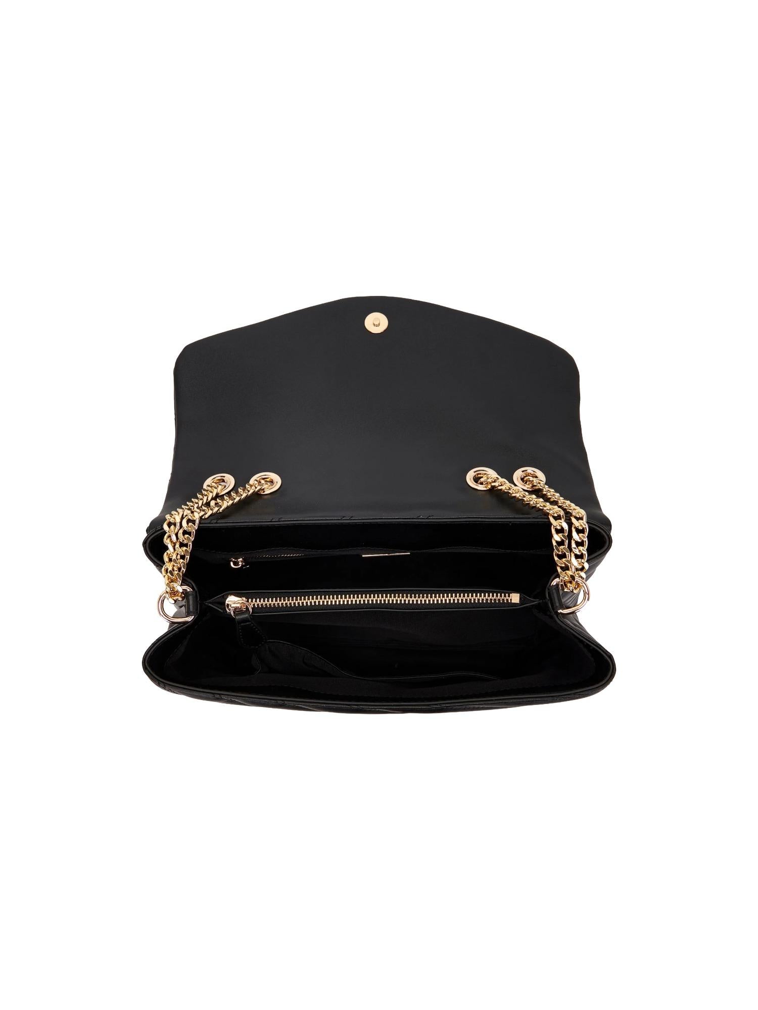 Borsa a spalla La Carrie realizzata in vera pelle trapuntata con chiusura tramite bottone, tracolla in catena con spallacci e doppio manico removibili, tasca interna con zip e placca logo frontale.