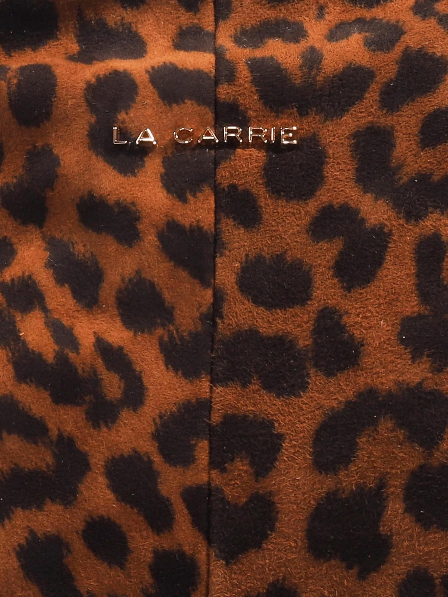 Borsa shopper La Carrie realizzata in suede leopardato con chiusura tramite zip, tracolla in catena con spallaccio e logo frontale.