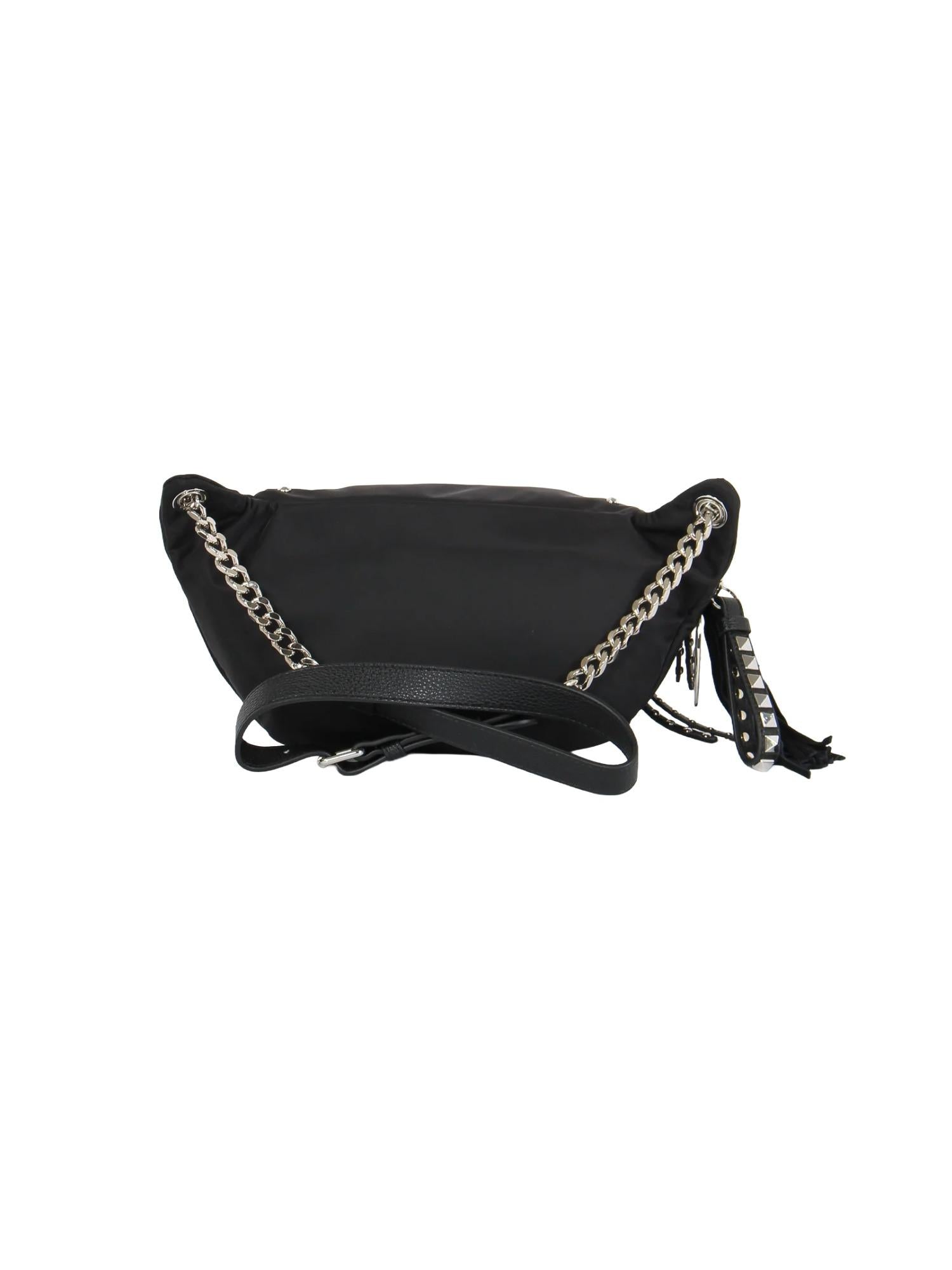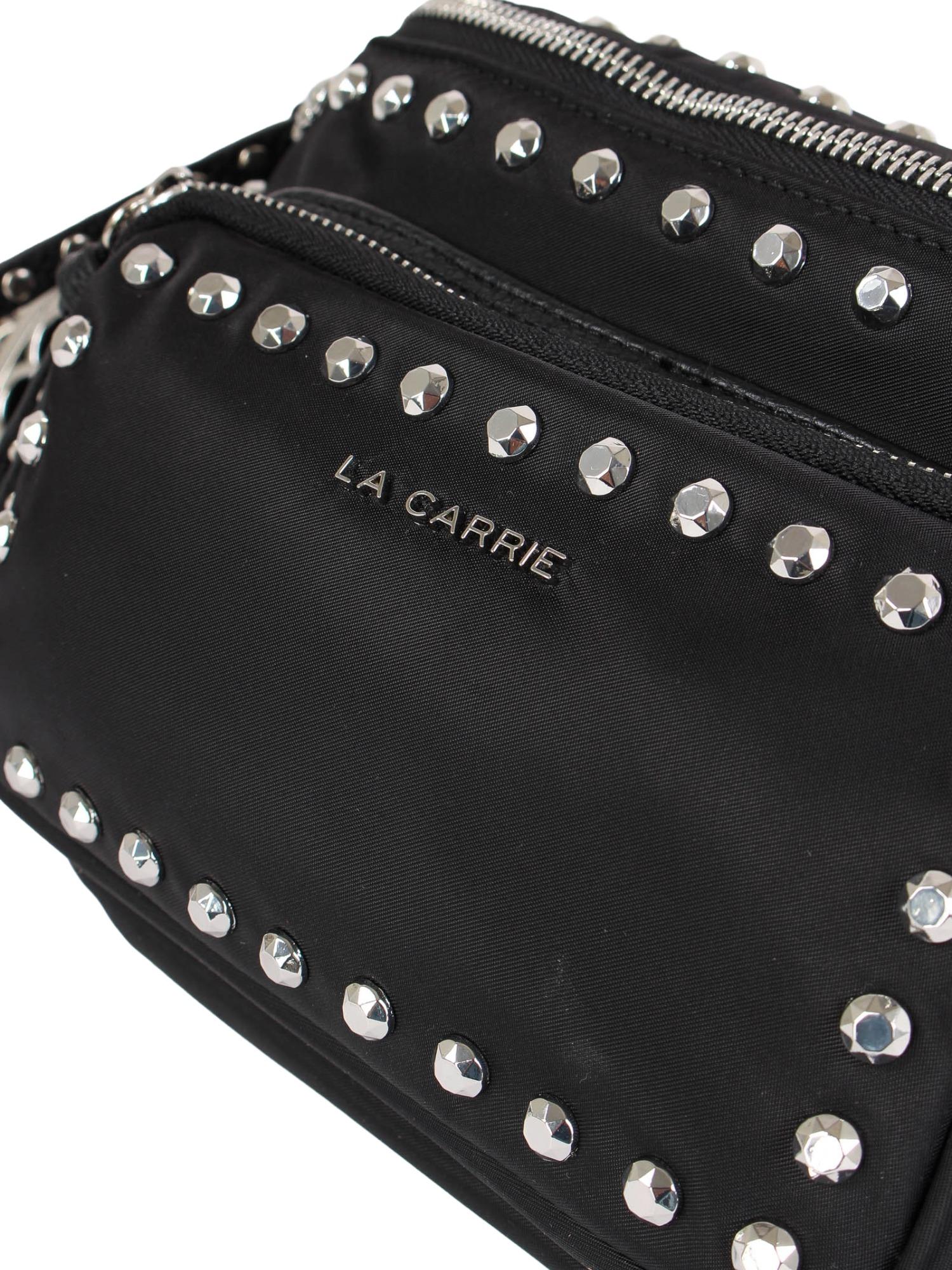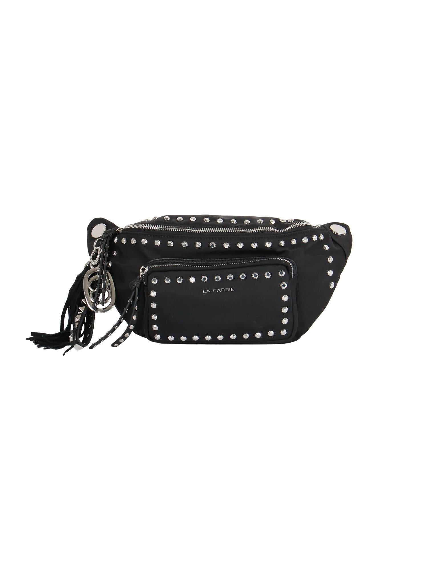 Marsupio La Carrie realizzato in nylon con doppia tasca con zip, borchie applicate lungo i profili a logo frontale.