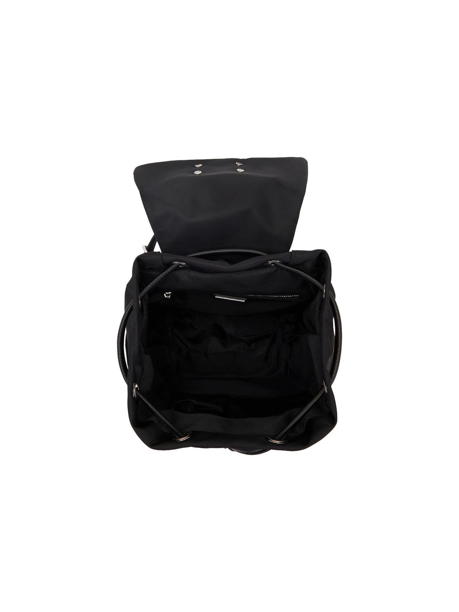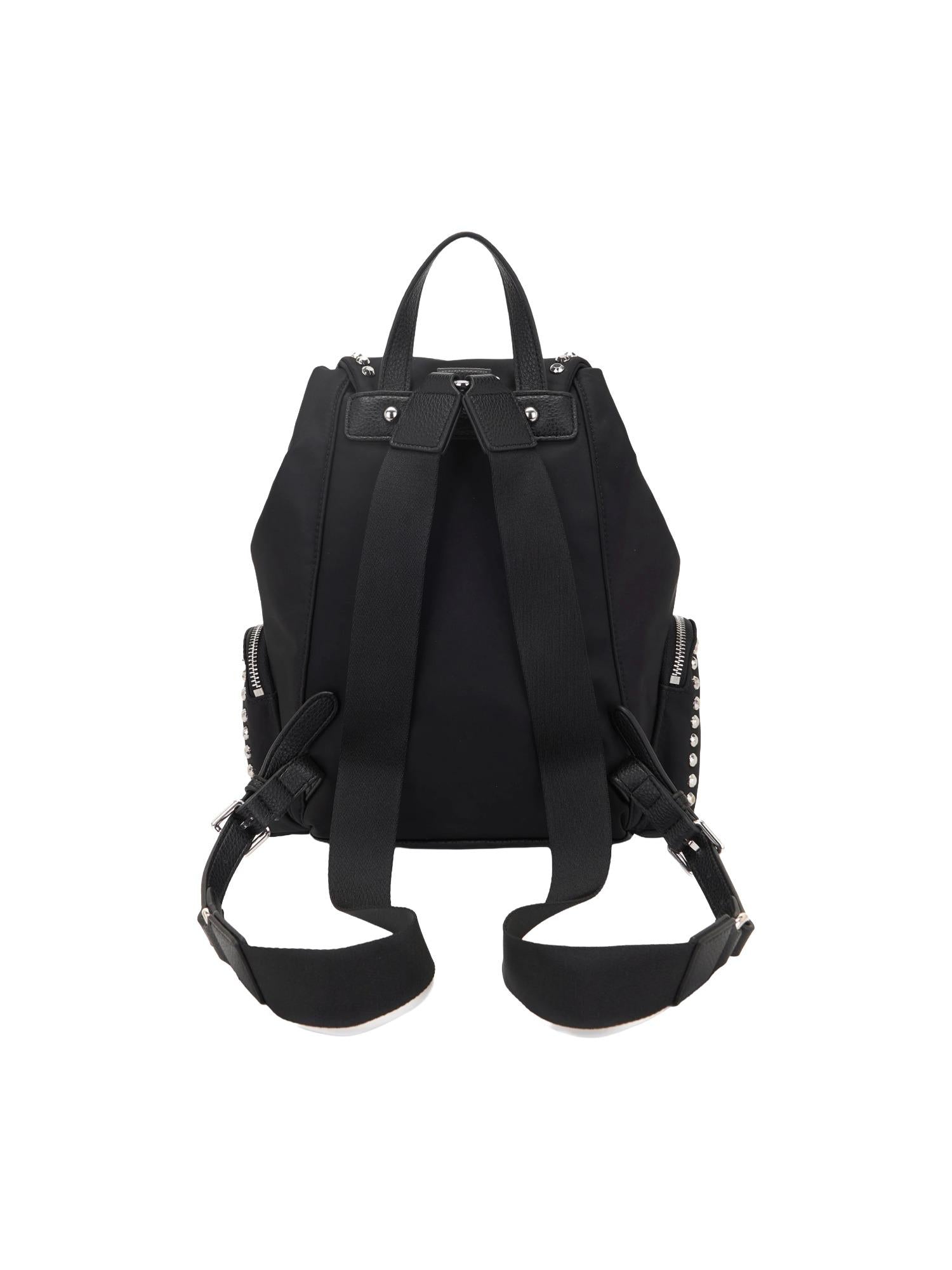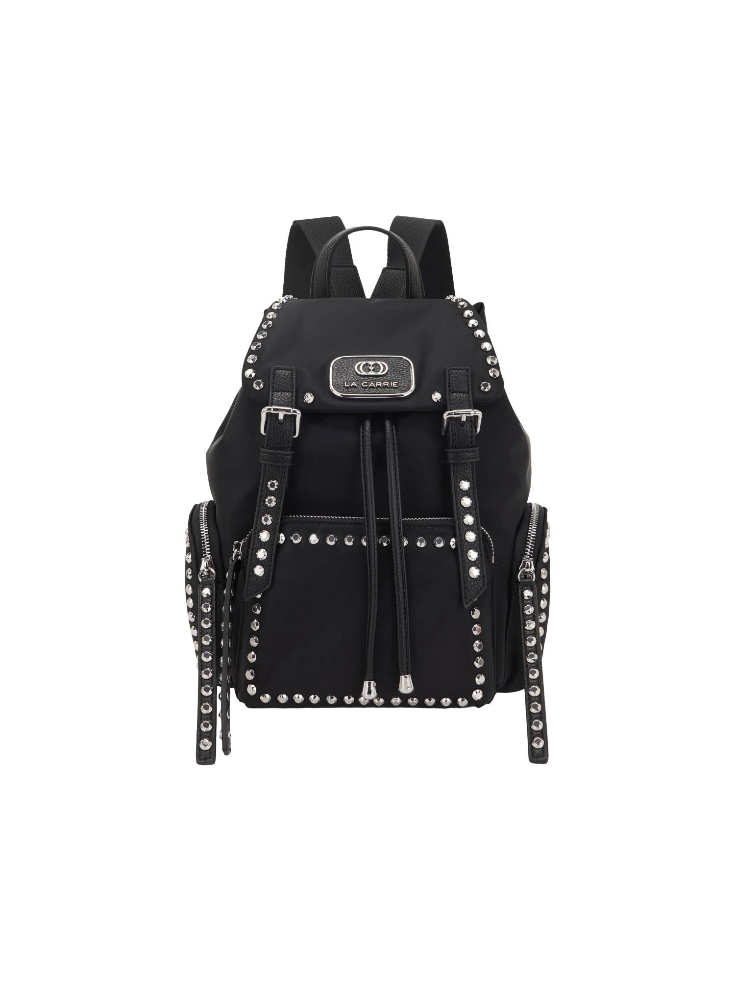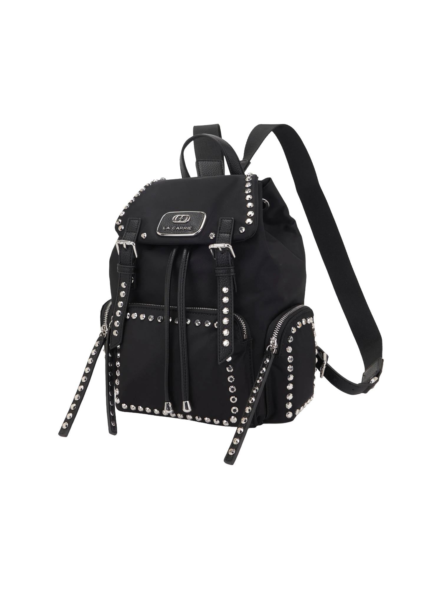 Zaino La Carrie realizzato in nylon con chiusura tramite coulisse, 3 tasche con zip, manico piatto, spallacci regolabili e borchie applicate.