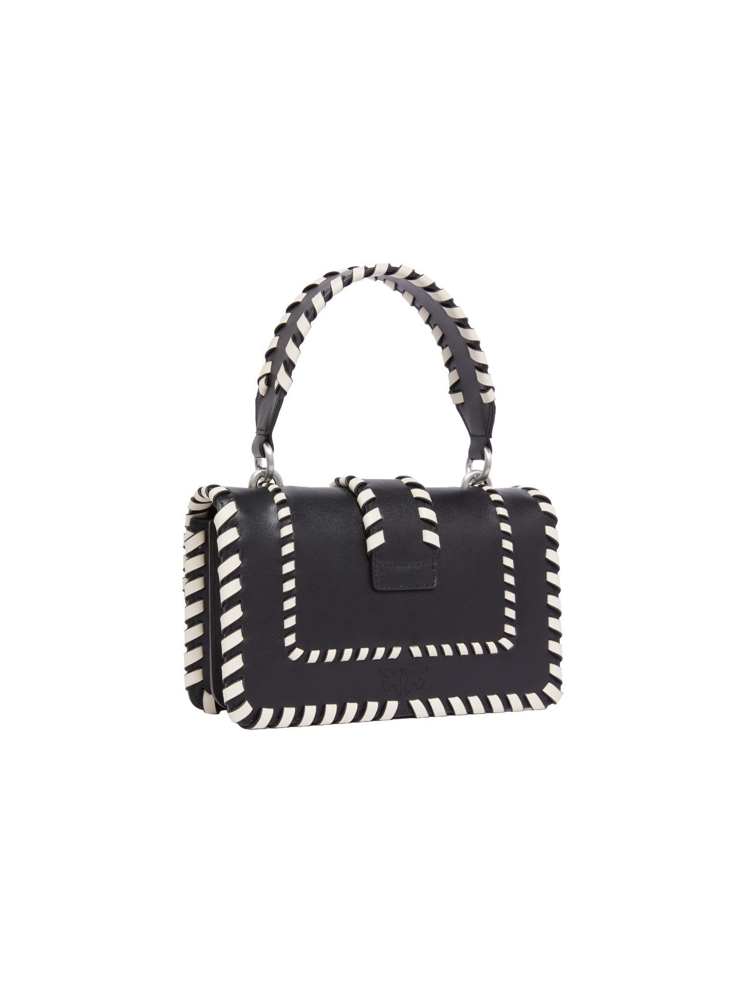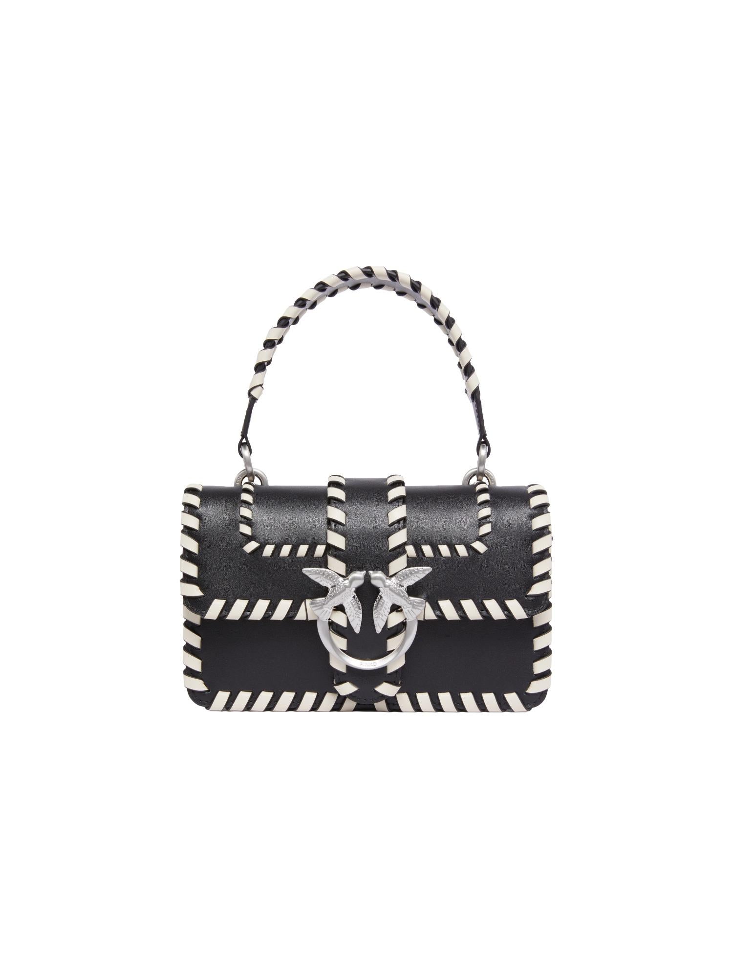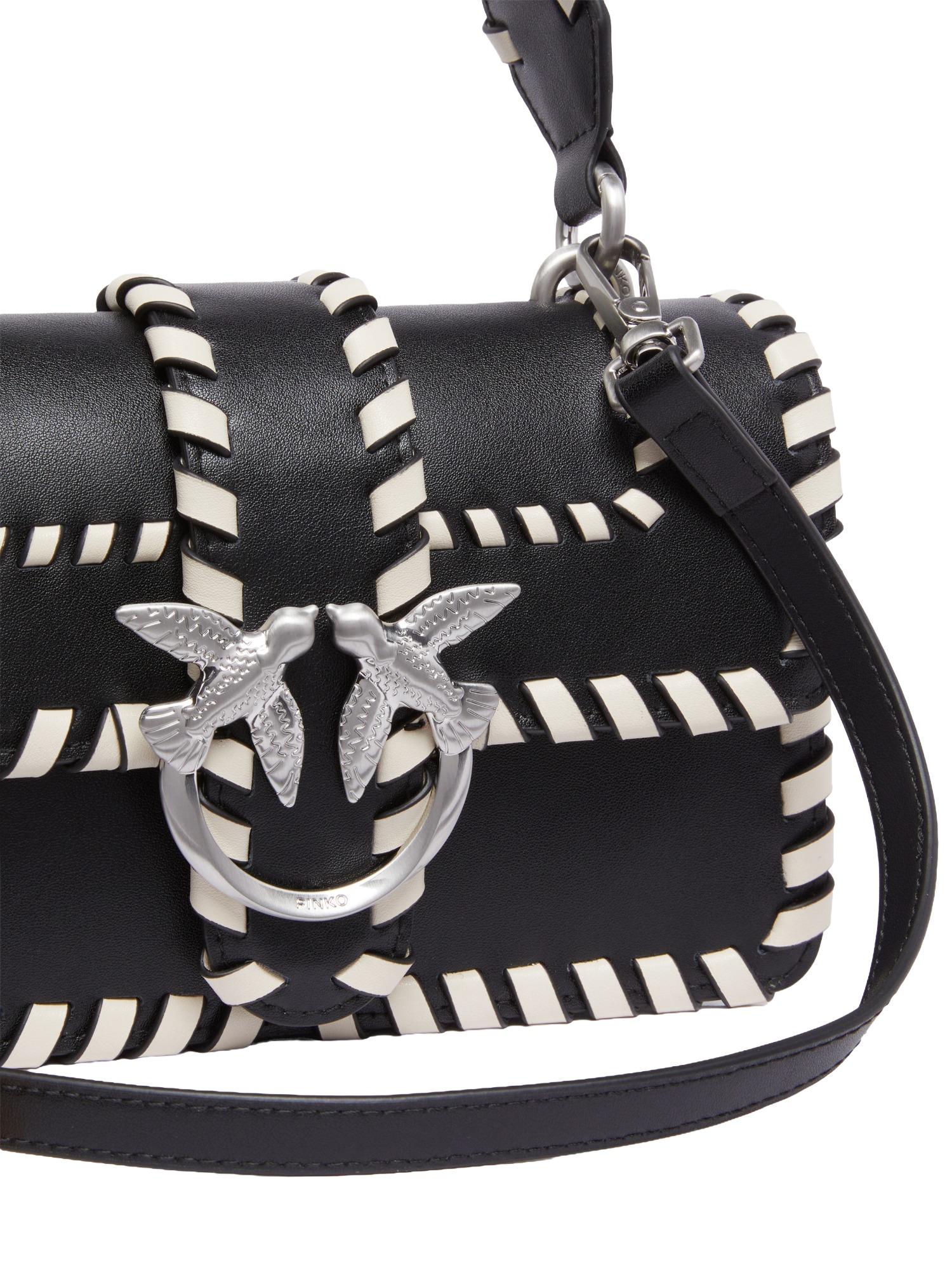 Borsa Pinko realizzata in vera pelle bovina con chiusura tramite bottone a incastro, tasca interna con zip, manico piatto, tracolla removibile, placca logo Love Birds sul davanti e infilature bicolore a contrasto lungo i profili.