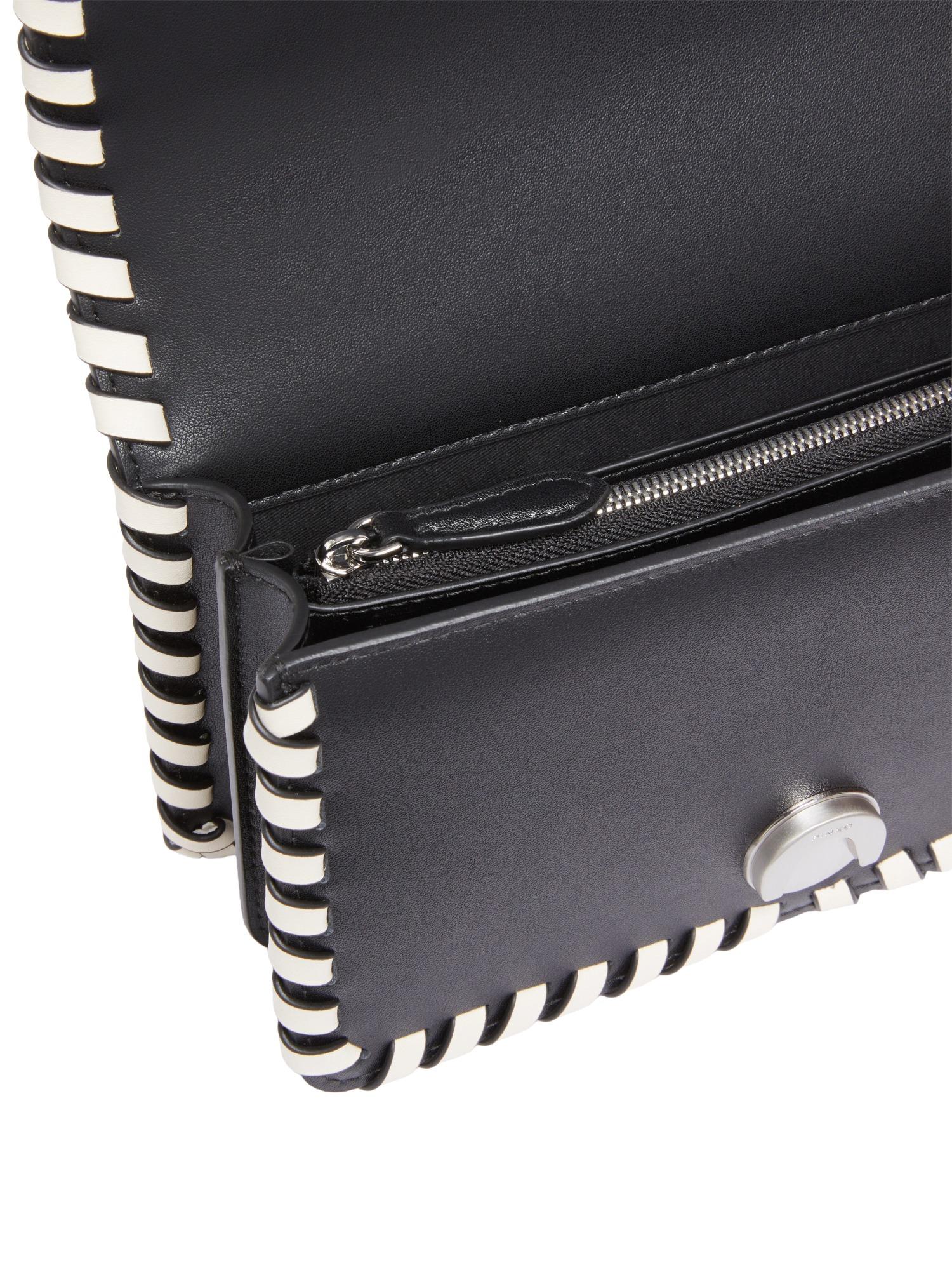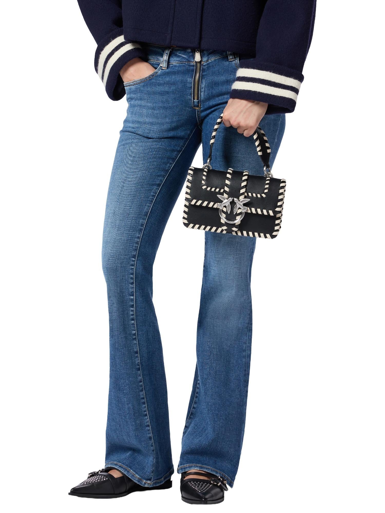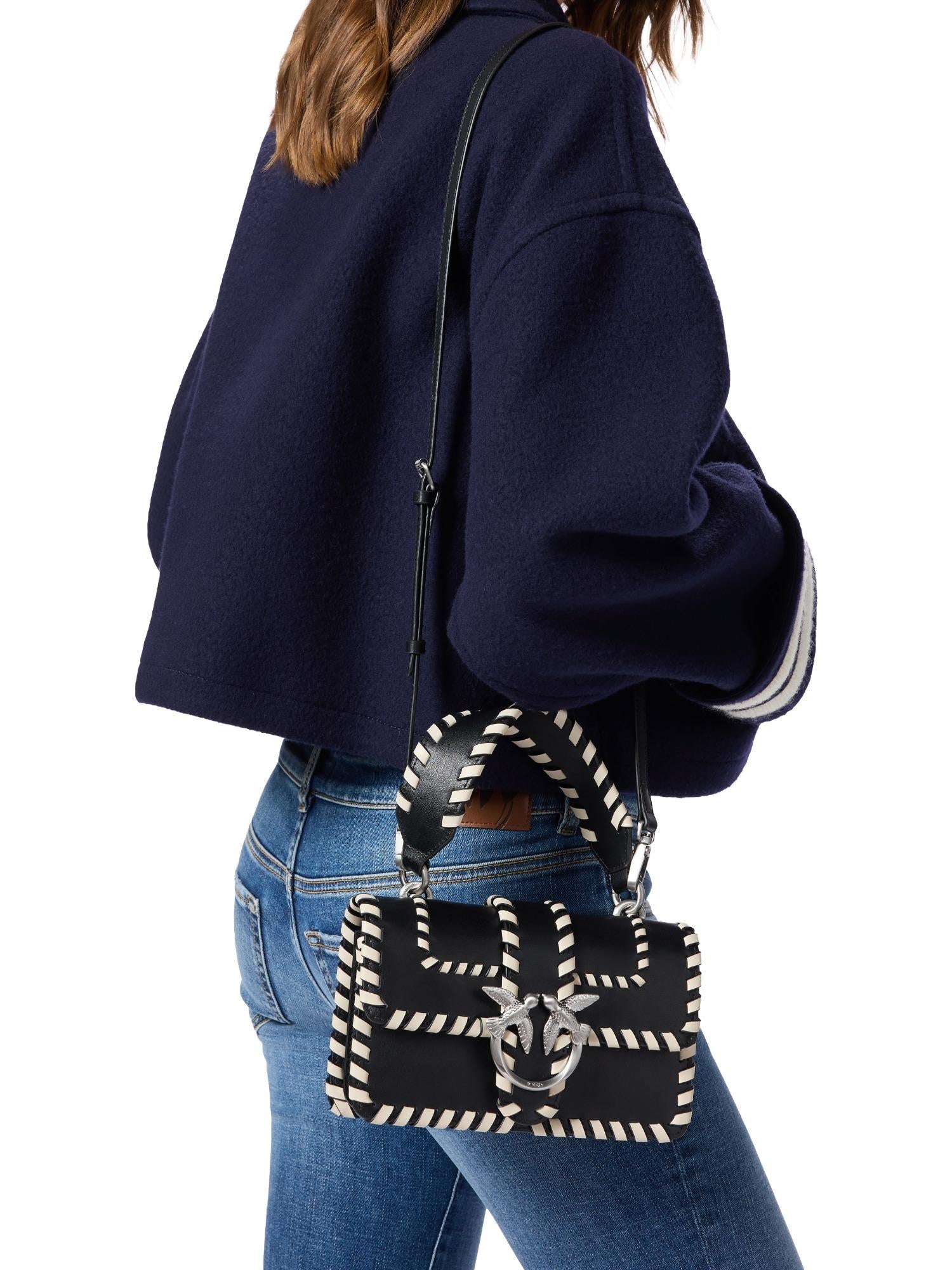 Borsa Pinko realizzata in vera pelle bovina con chiusura tramite bottone a incastro, tasca interna con zip, manico piatto, tracolla removibile, placca logo Love Birds sul davanti e infilature bicolore a contrasto lungo i profili.