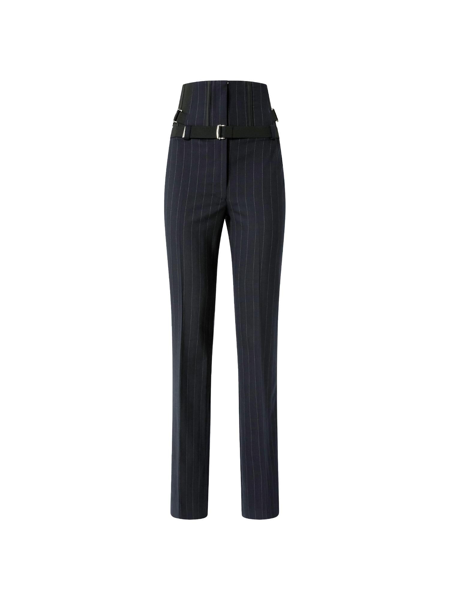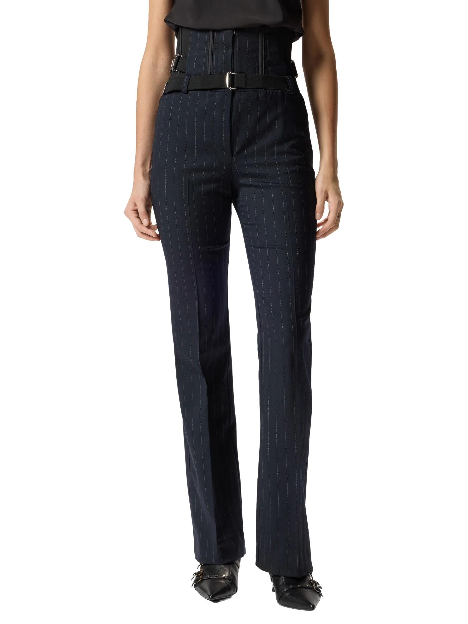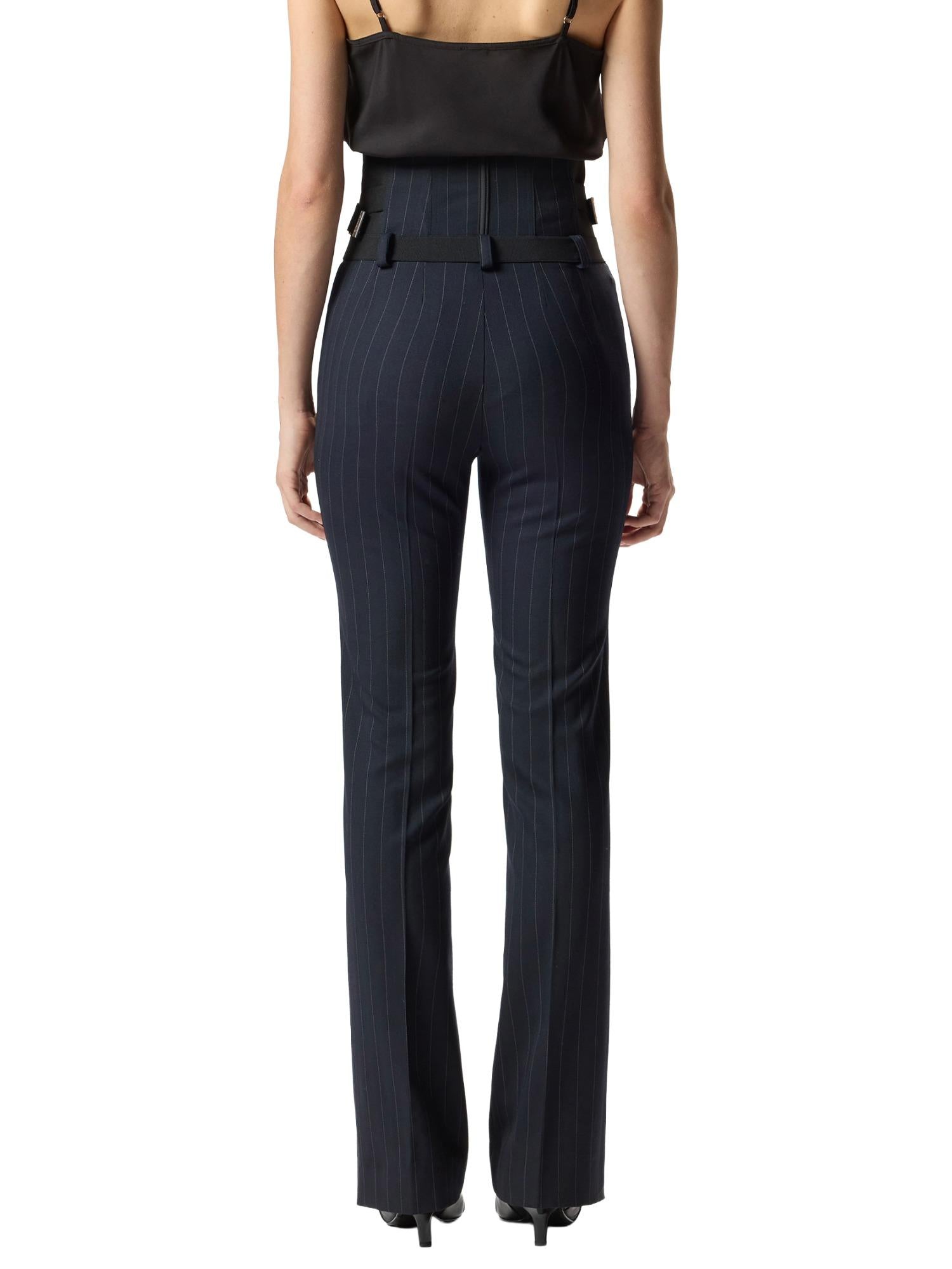 Pantalone gessato Pinko realizzato in misto lana con costruzione bustier a vita super alta, cinturini con fibbie e fit a gamba dritta.